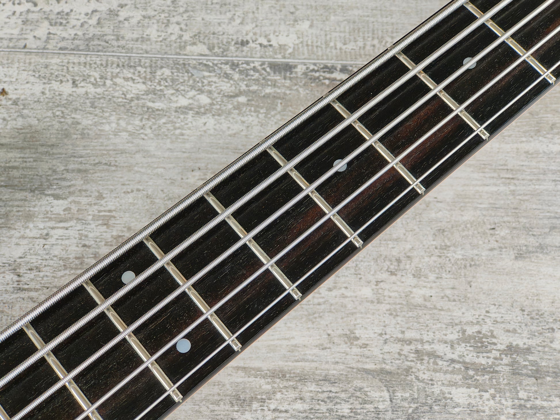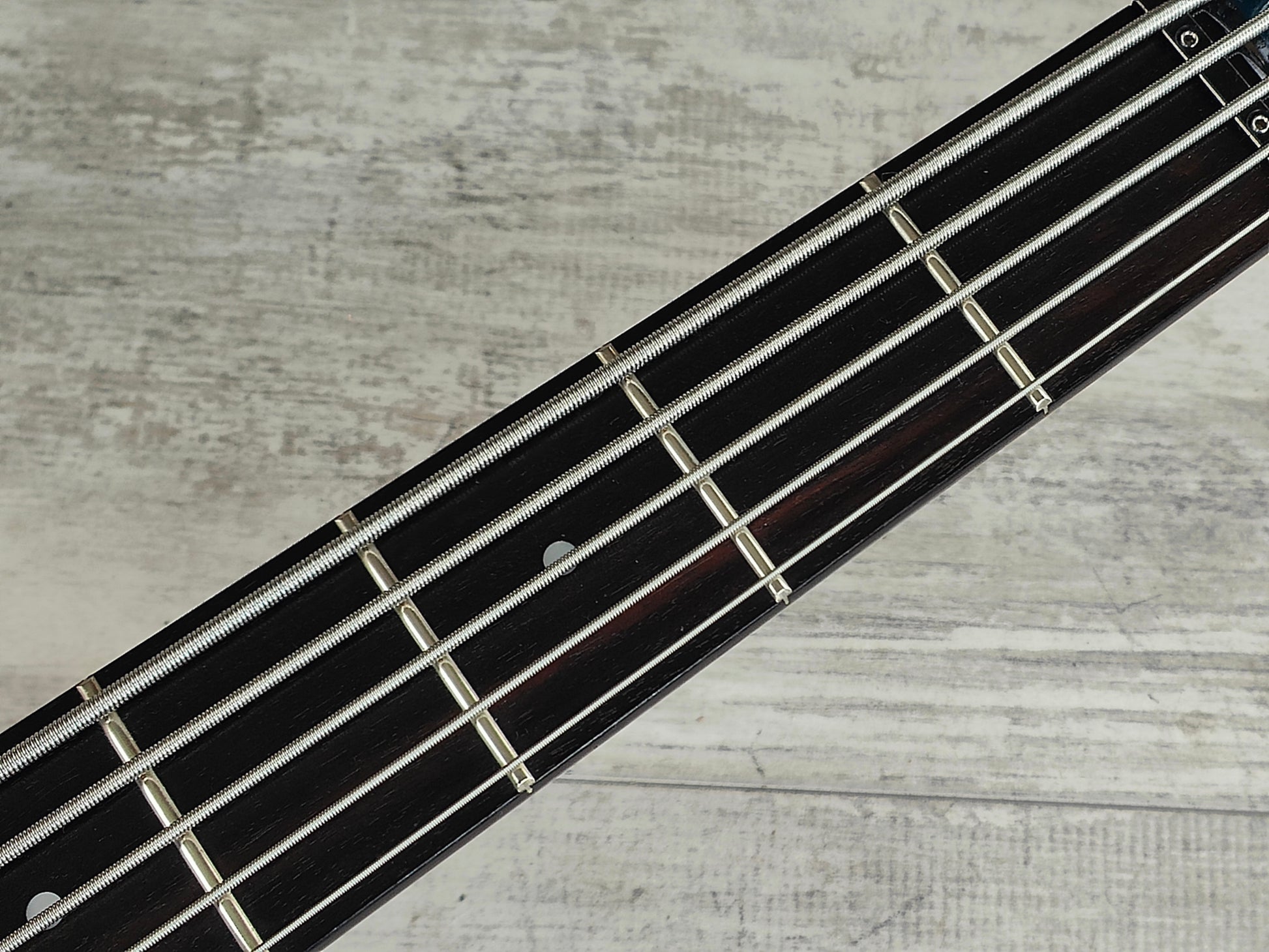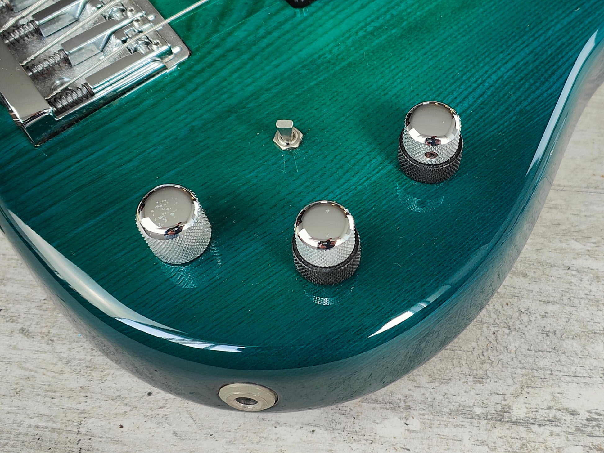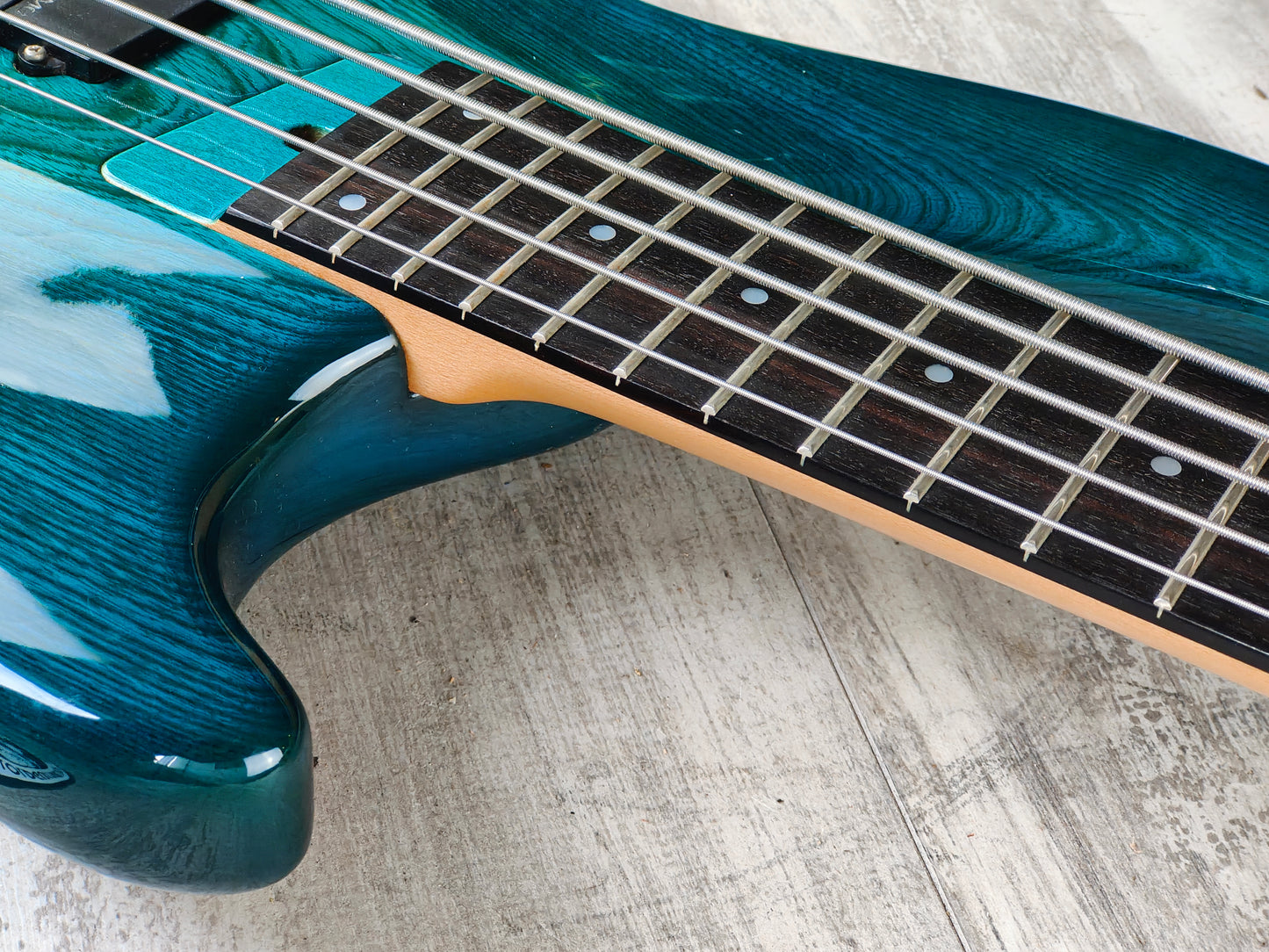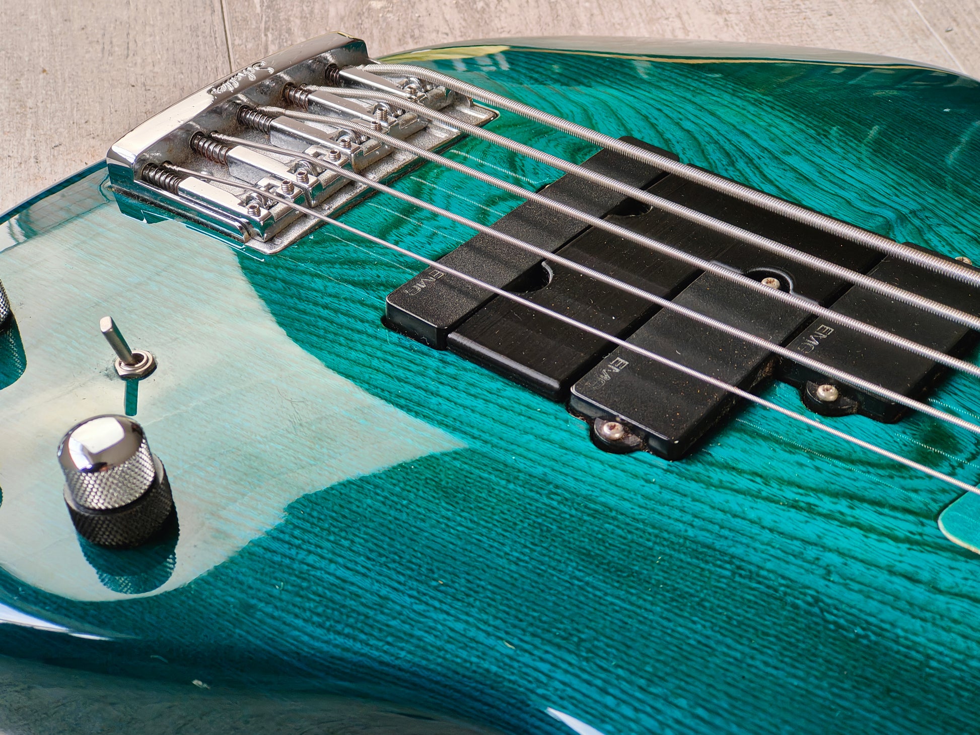 Made in Japan by Fernandes during the 1980's when P-Project guitars were primarily custom orders made to customers specs. This is a PUM-5 model bass with a transparent green stained one-piece ash body bolted to a maple neck and 24 fret ebony fingerboard (43mm nut width, 34" scale length), it weighs 3.8kg's. Loaded with a pair of active EMG's along with a three-band EQ system on the concentric pots, the factory Schaller bridge and Gotoh tuners keep it tuned and intonated perfectly.