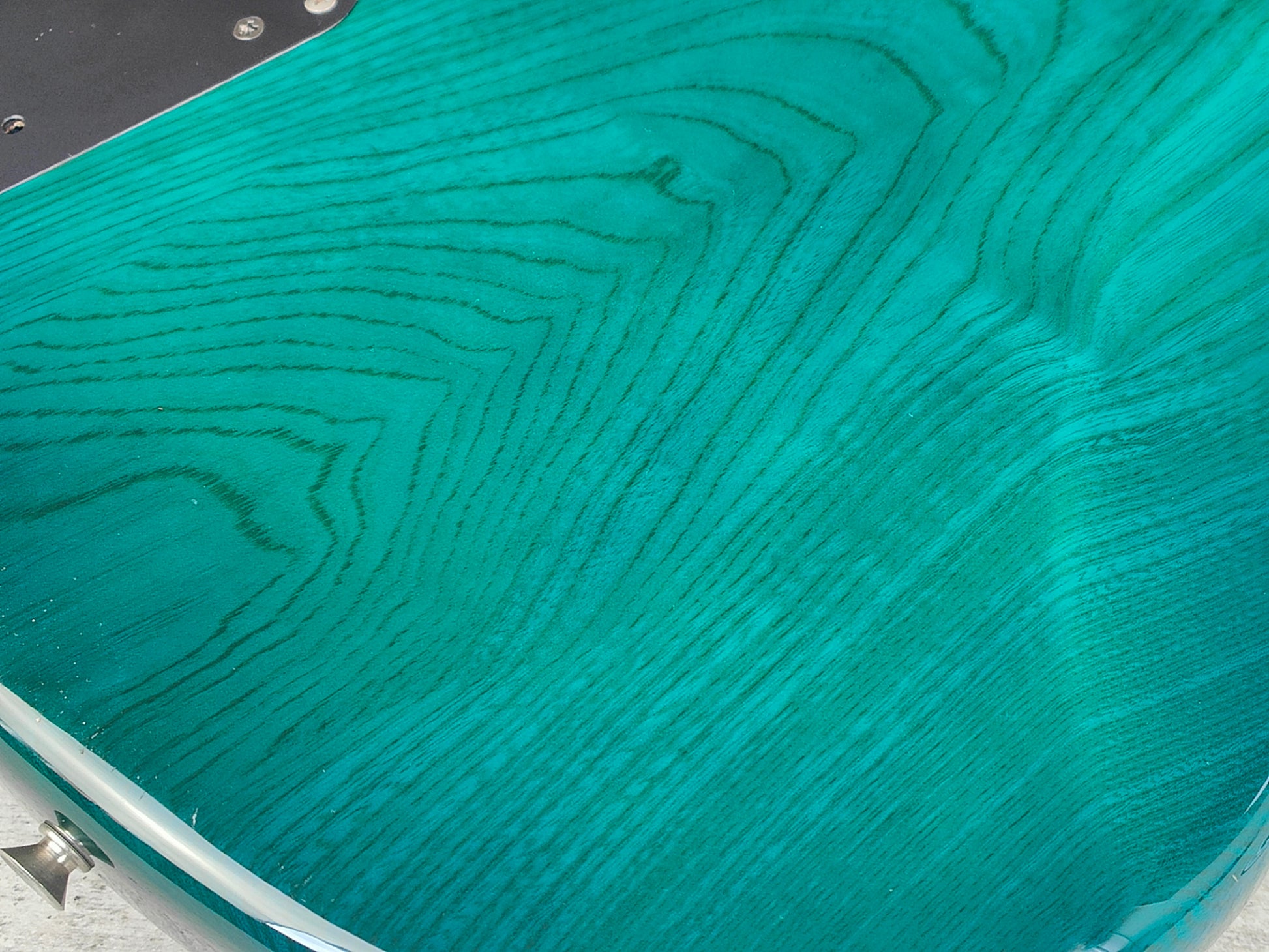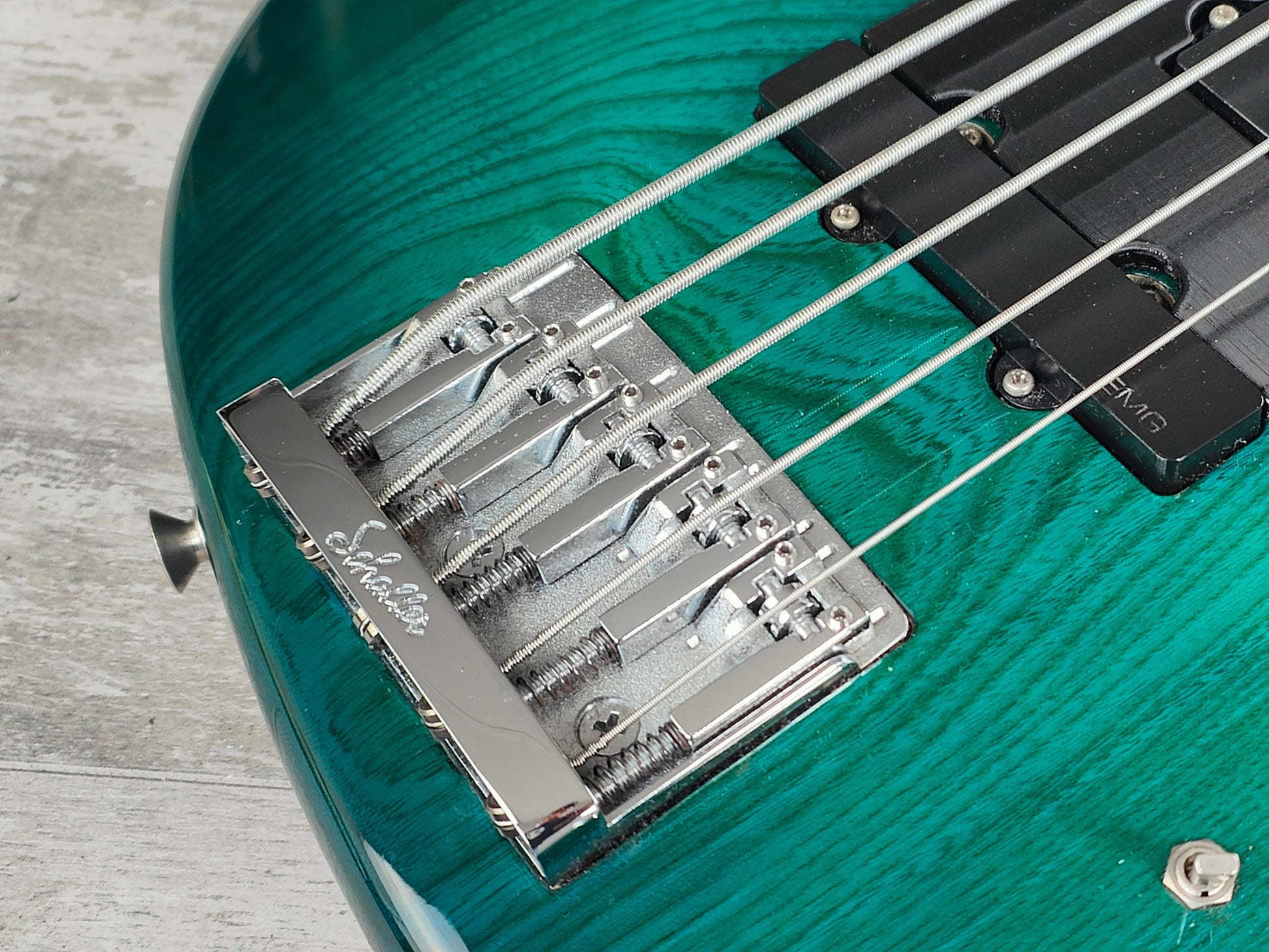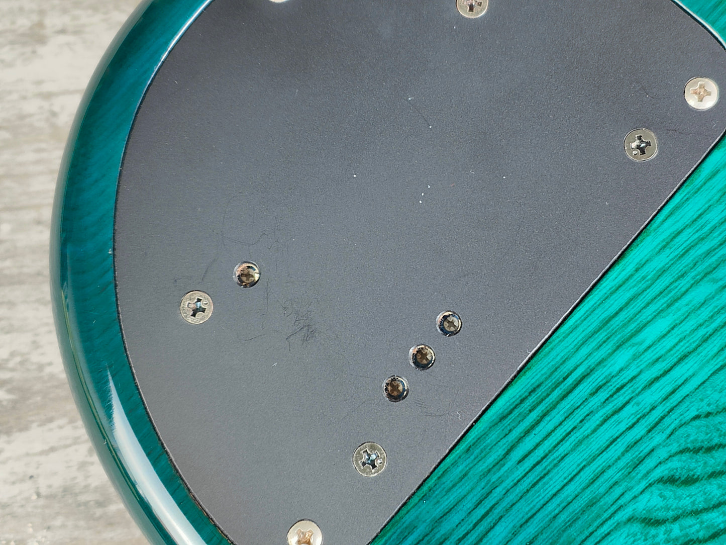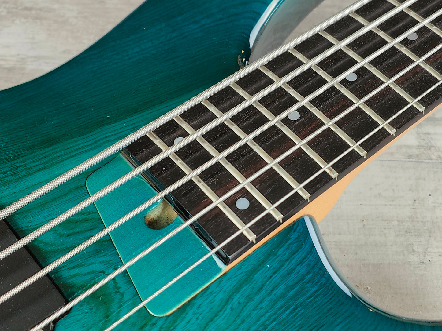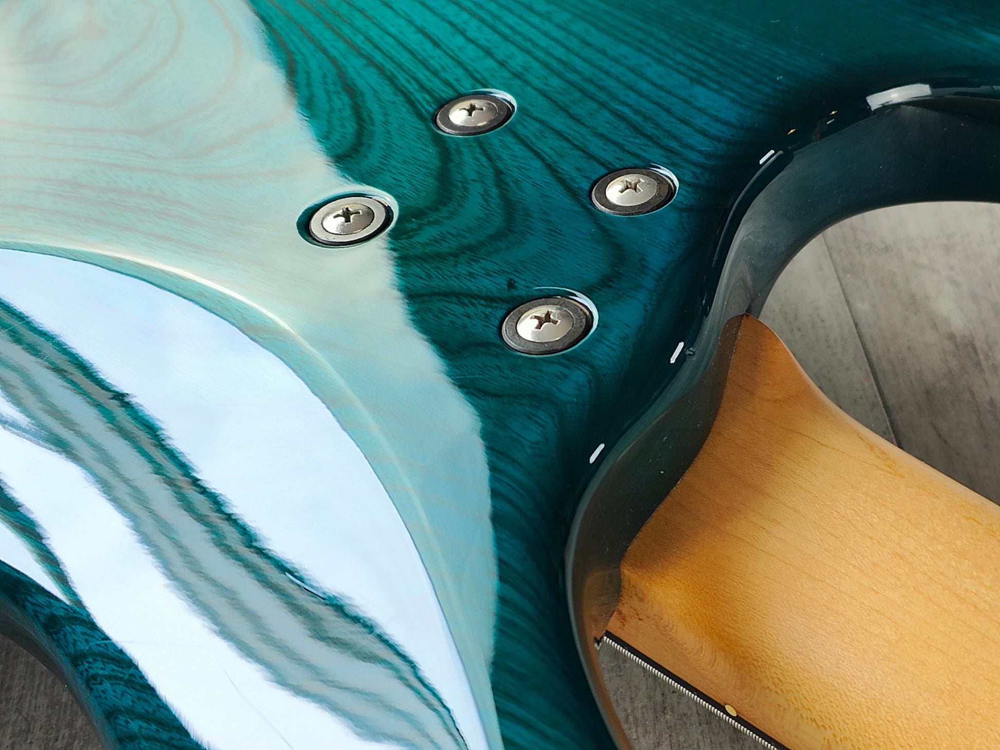 Made in Japan by Fernandes during the 1980's when P-Project guitars were primarily custom orders made to customers specs. This is a PUM-5 model bass with a transparent green stained one-piece ash body bolted to a maple neck and 24 fret ebony fingerboard (43mm nut width, 34" scale length), it weighs 3.8kg's. Loaded with a pair of active EMG's along with a three-band EQ system on the concentric pots, the factory Schaller bridge and Gotoh tuners keep it tuned and intonated perfectly.