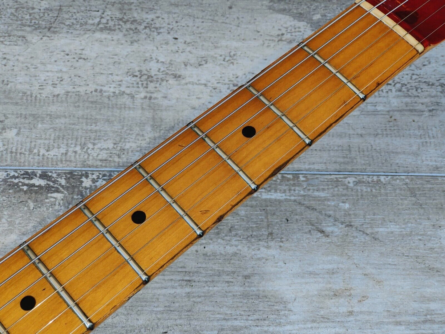 More aesthetic vibe than you could ever handle and twice as much sound! Made in Tokyo by the by Yubi Sound Lab (the Japanese distributor for Seymour Duncan), these were mostly on-off custom shop style builds created to showcase the range of SD pickups prior to their agreement with ESP. Loaded with just a single Seymour Duncan JBJ/SH-4 humbucker (16.5k), this one's built with a one-piece '54 style maple neck (soft V profile) bolted to an unfinished two-piece alder body. Controlled by a single volume knob and output jack mounted to the control plate, it's a very simple no-nonsense guitar with incredible acoustic volume. The original Dimarzio branded machine heads are an interesting choice given that it's a Seymour Duncan build, but they look the part and keep things perfectly in tune.