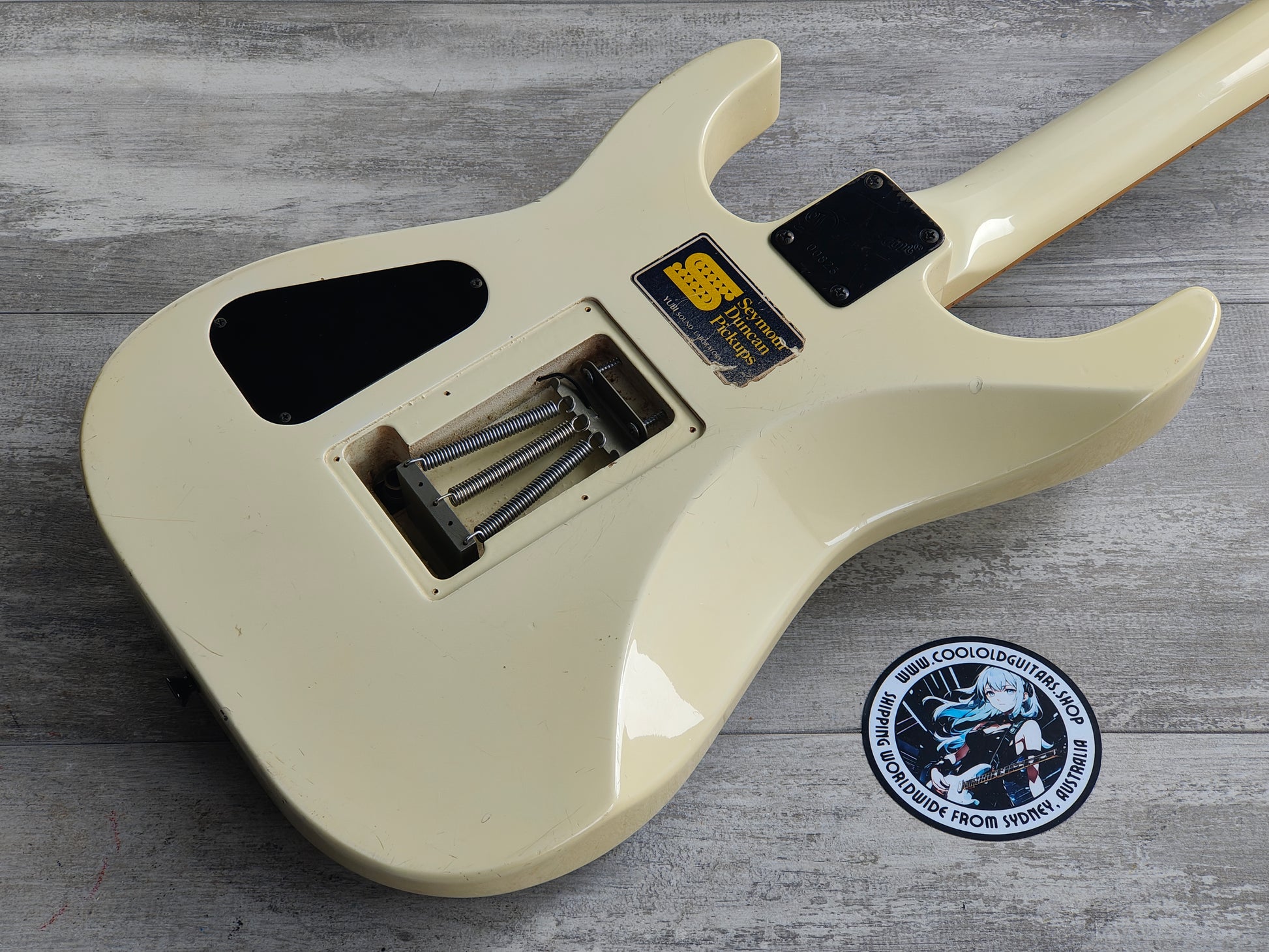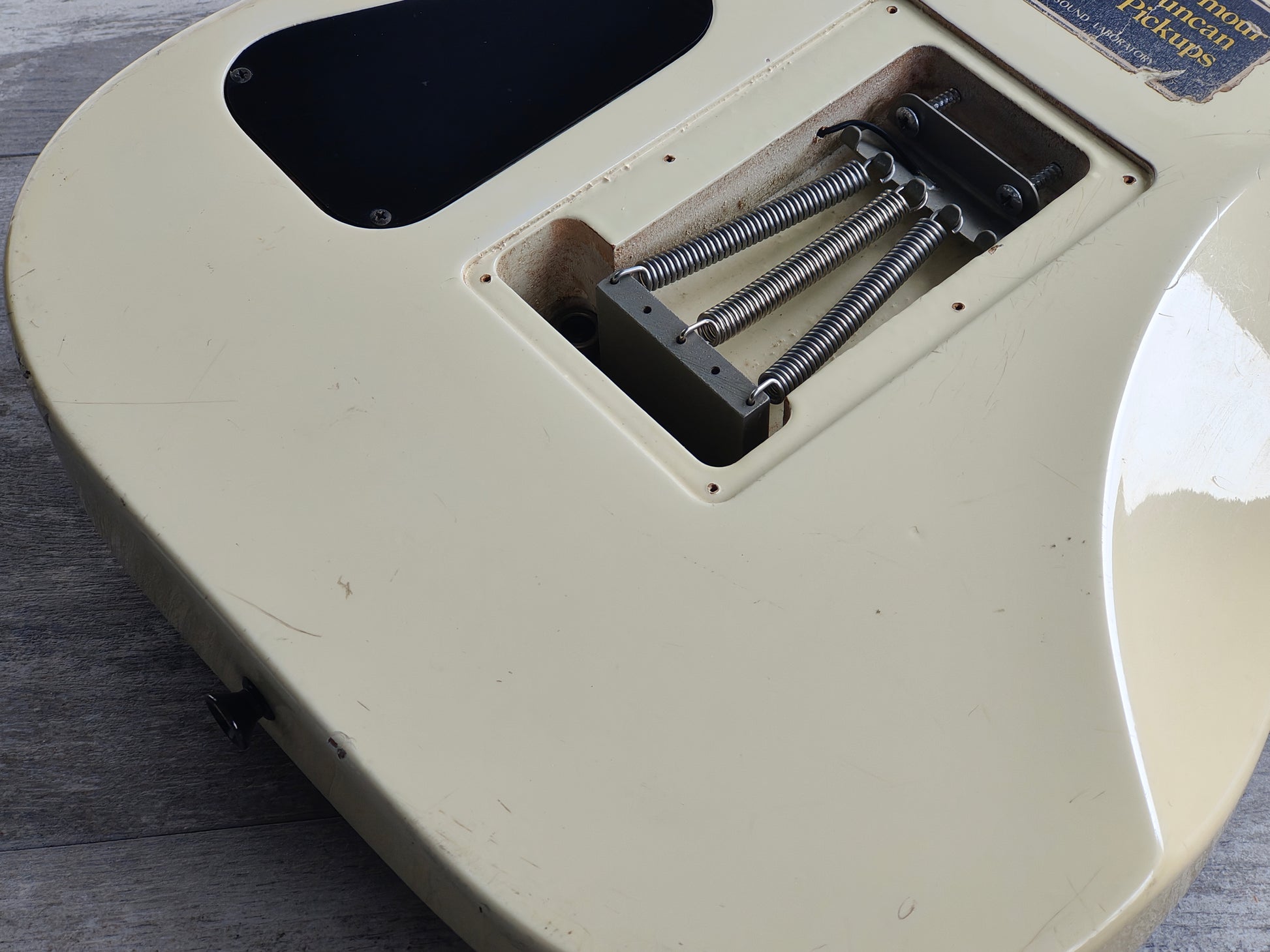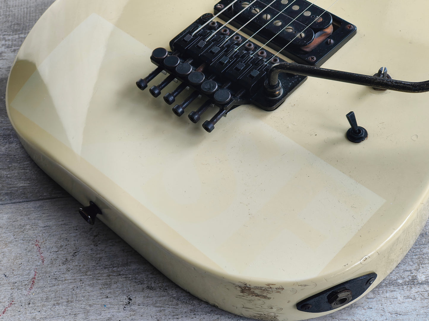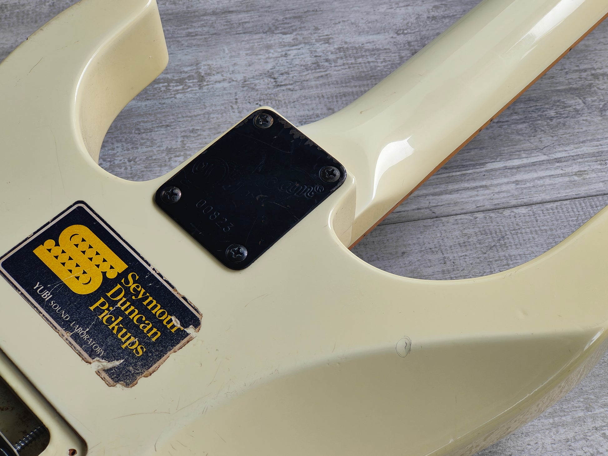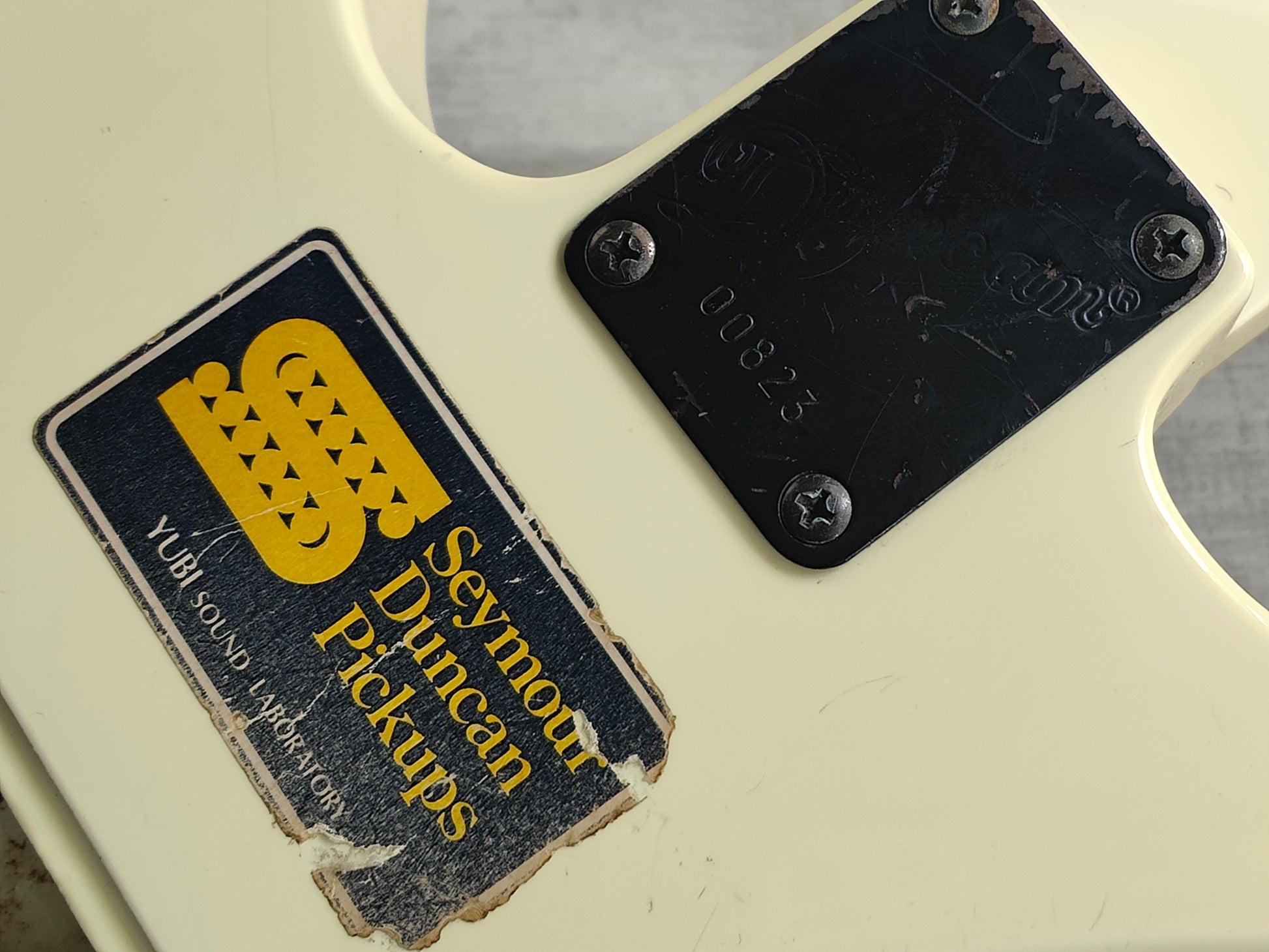 Made in Tokyo by the by Yubi Sound Lab (the Japanese distributor for Seymour Duncan) in the 1980's, the Quattro was a Charvel/Jackson style Superstrat loaded with a Floyd Rose system and two 80's Seymour Duncan pickups. Aged white finish on a solid body bolted to a slim C style maple neck with a 22 fret maple fingerboard (648mm scale length), it weighs 3.5kg's.