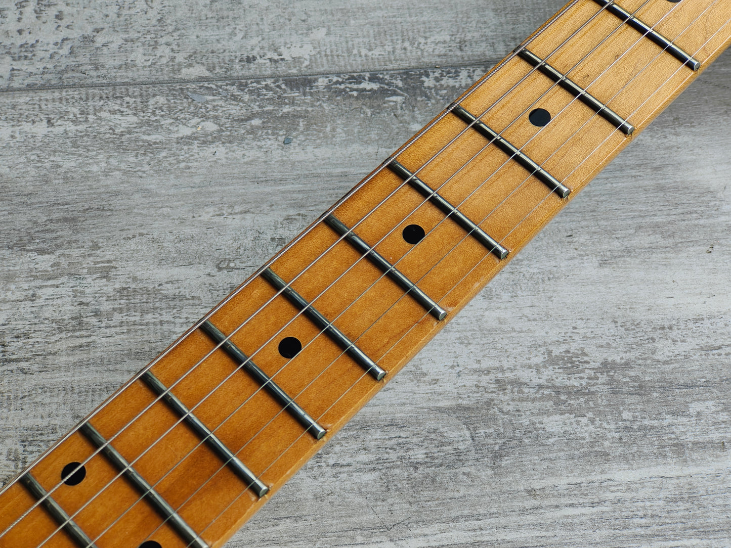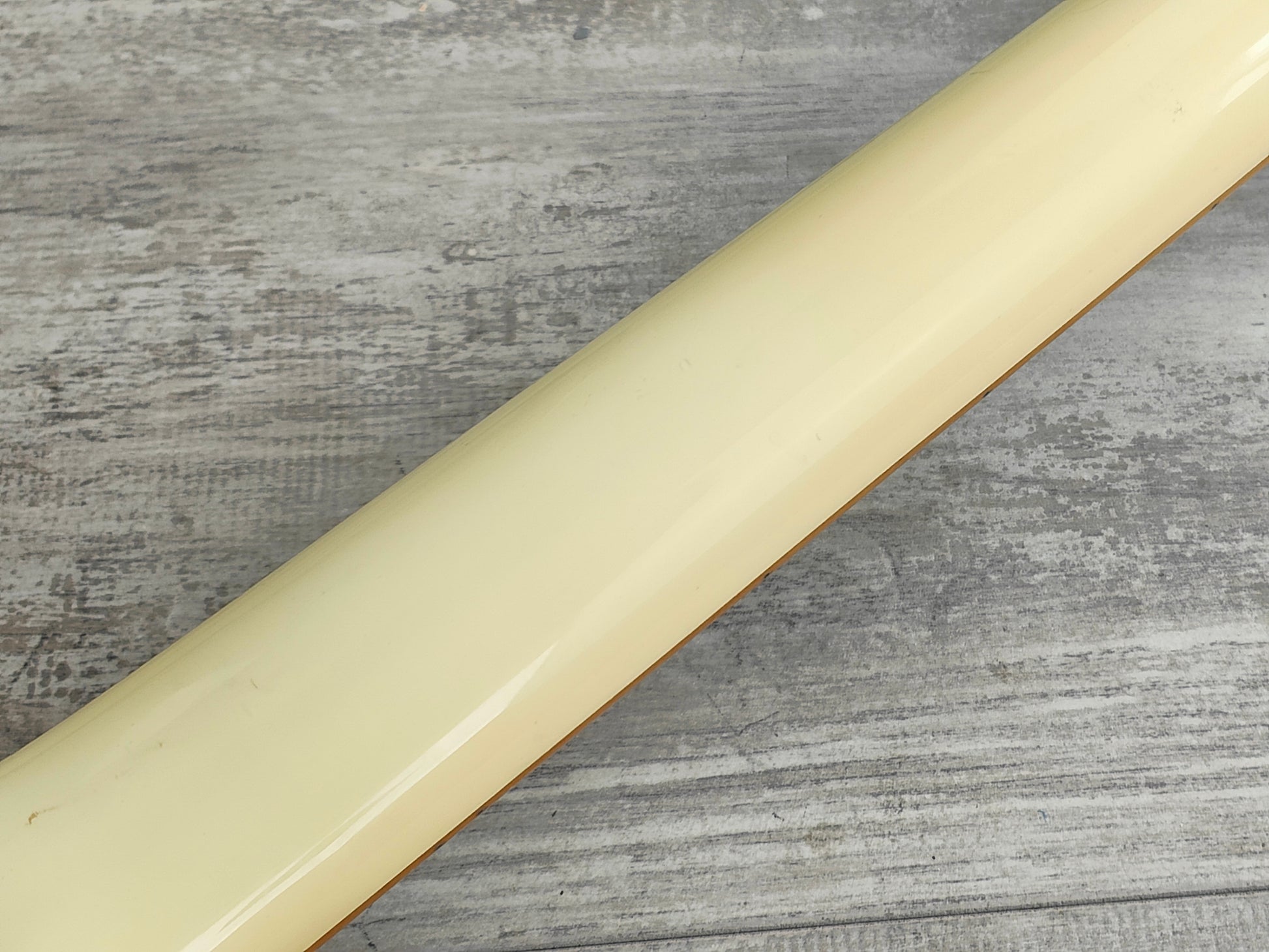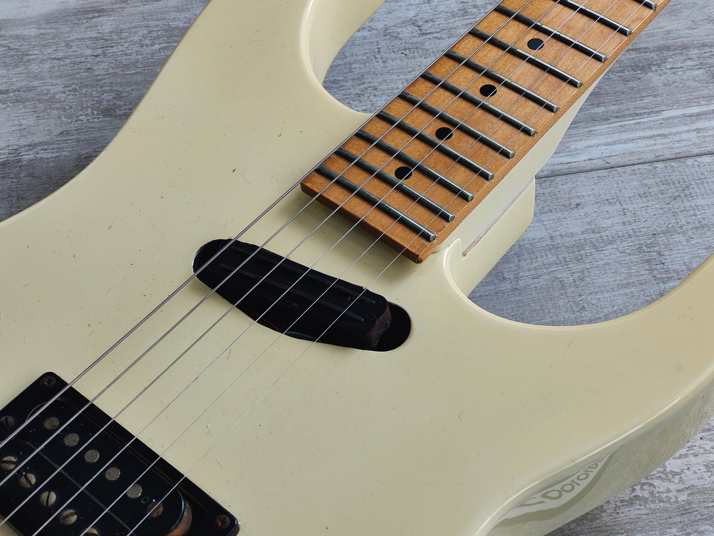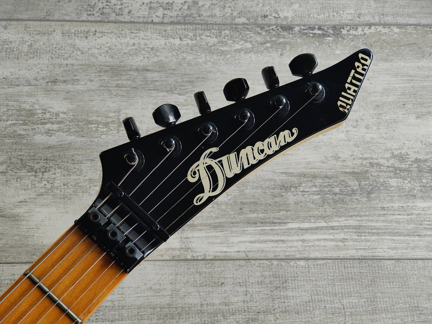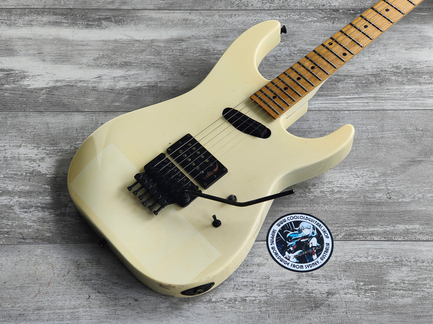 Made in Tokyo by the by Yubi Sound Lab (the Japanese distributor for Seymour Duncan) in the 1980's, the Quattro was a Charvel/Jackson style Superstrat loaded with a Floyd Rose system and two 80's Seymour Duncan pickups. Aged white finish on a solid body bolted to a slim C style maple neck with a 22 fret maple fingerboard (648mm scale length), it weighs 3.5kg's.