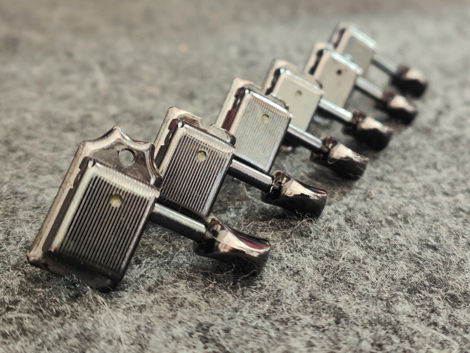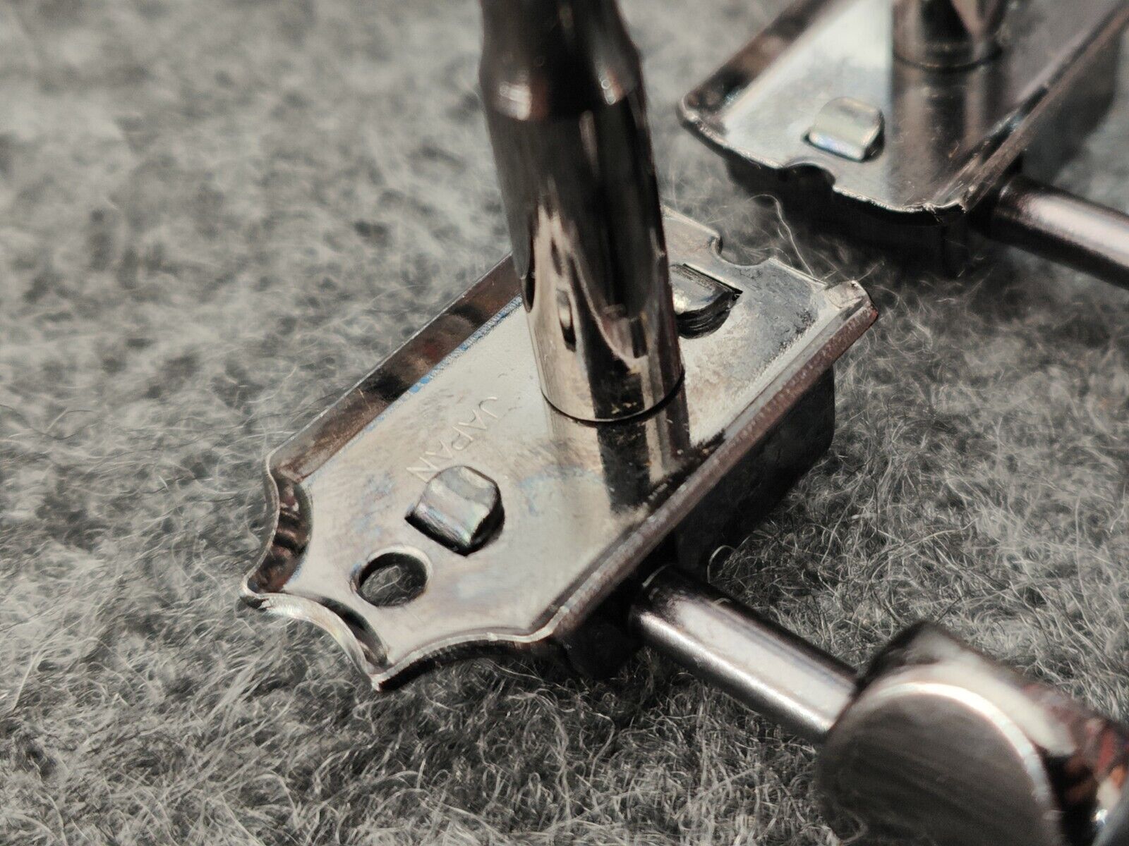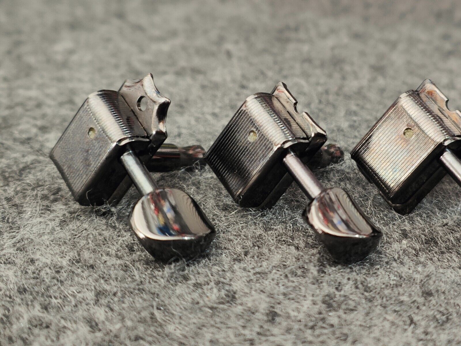 These are the tuners that the Tokai factory used for many years on their Stratocaster and Telecaster builds (both their own models and many of the guitars they built for Fender Japan). They've never been installed and have aged slightly from being stored for over 30 years, meaning they'll perfectly match a used/vintage guitar (unlike a shiny new set that won't match the ageing of the rest of the hardware). These machine heads are significantly higher quality than most Chinese sets and were likely made by Gotoh, they're smooth and responsive.