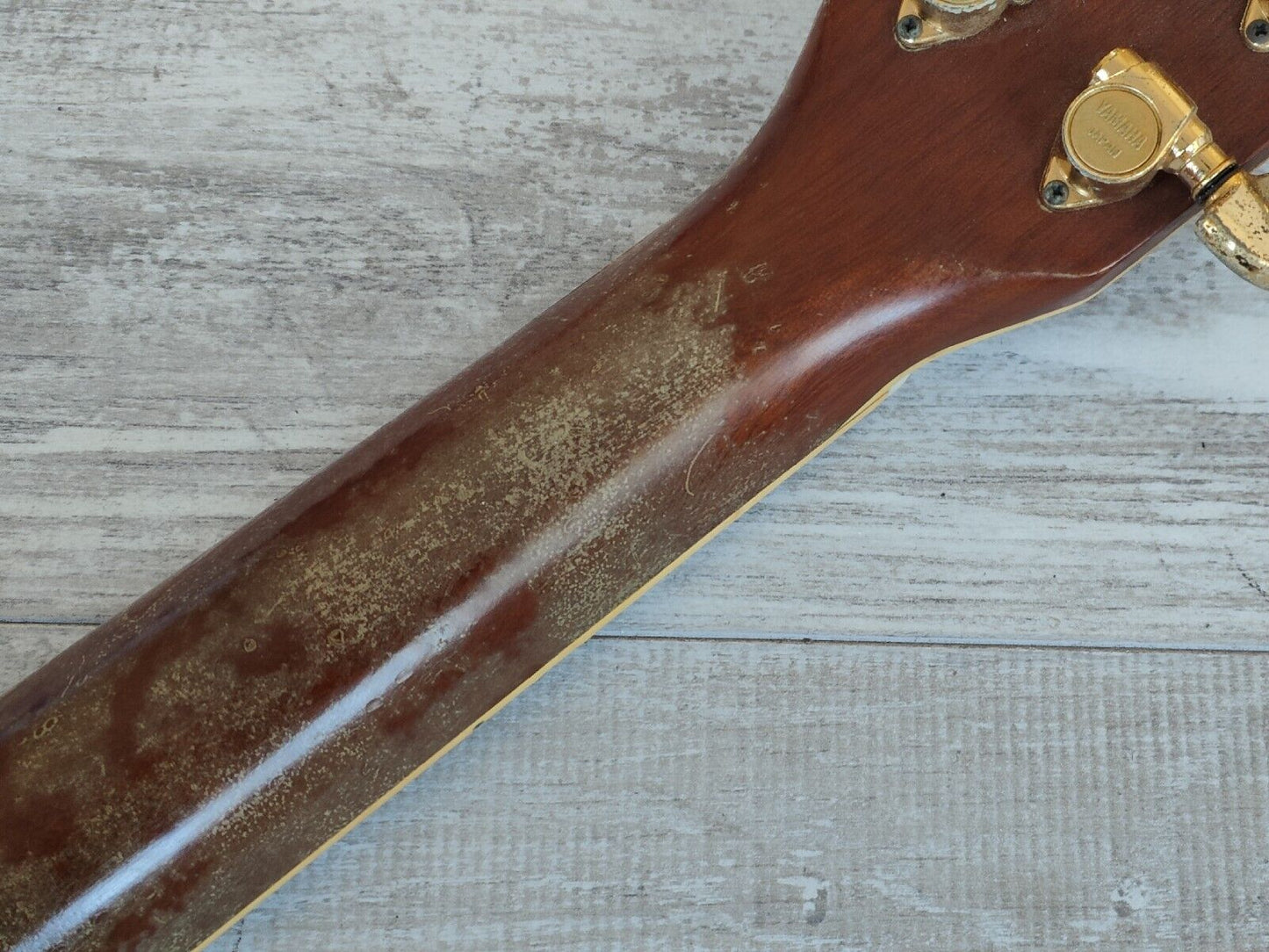 Well used vintage condition with some dings and wear as pictured, frets are used but were polished and play well, the neck is straight with a functional truss. Fretboard was oiled, has some fading under the clear coat on the back, sides and neck.