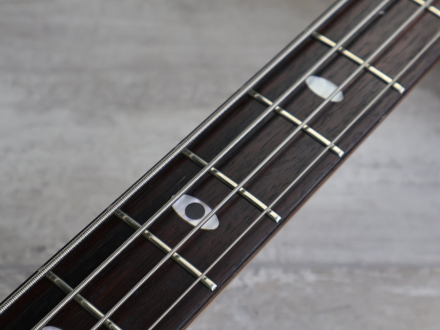 Wide 46mm brass nut with a reasonably slim neck profile, it's loaded with a pair of aftermarket bass humbuckers controlled by concentric volume/tone controls along with both a phase and killswitch mini toggle.