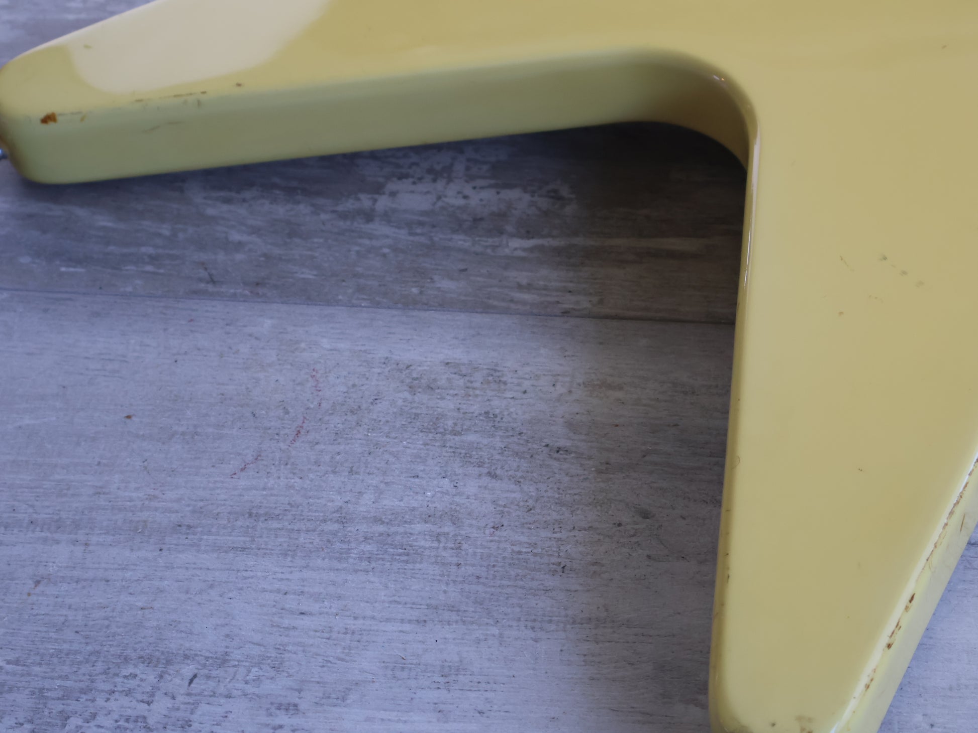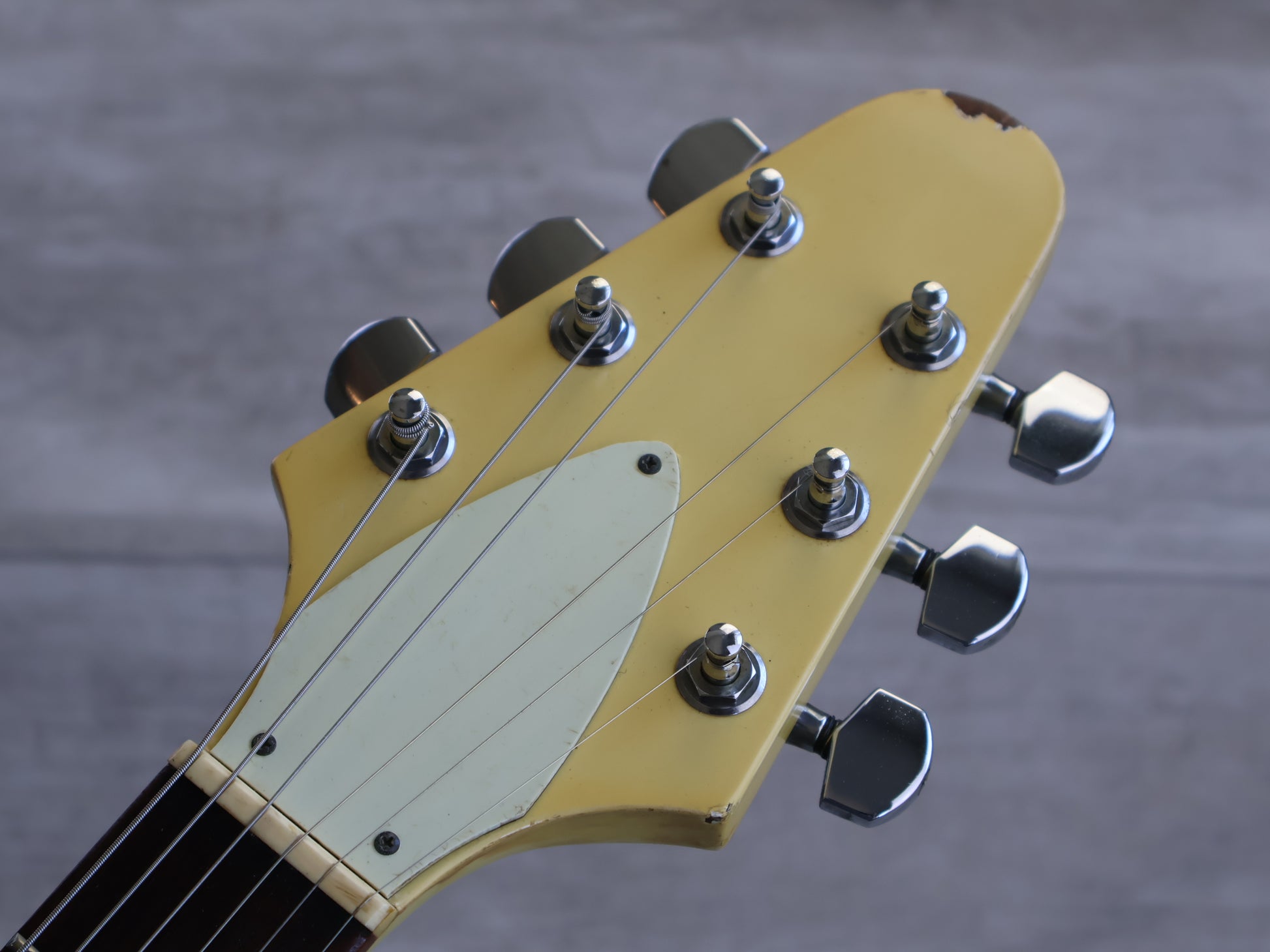 Made by the Fujigen factory in 1981, this is the Greco FV-600 '67 reissue Flying V. Mahogany body with a slim 60's profile mahogany neck and a 22 fret rosewood fingerboard with dot inlays, it weighs 3.2kg's. Loaded with aftermarket pickups (a Gotoh in the bridge and an unbranded neck pickup) and a set of Schaller tuners with the original Japanese wiring and Greco hardware.