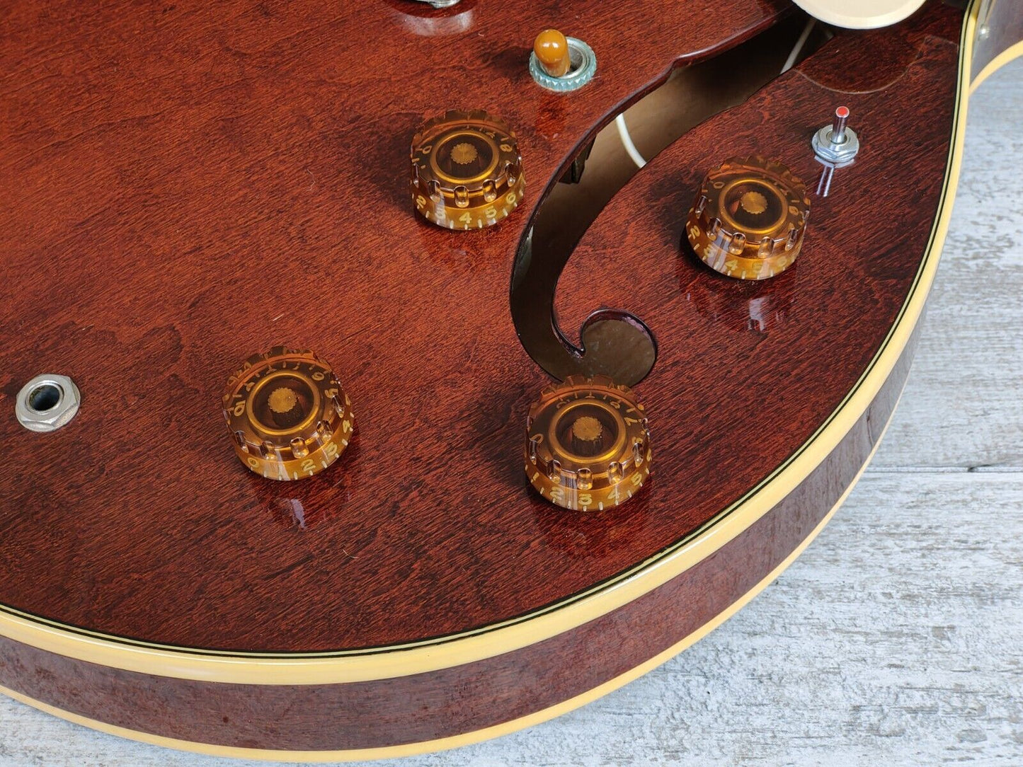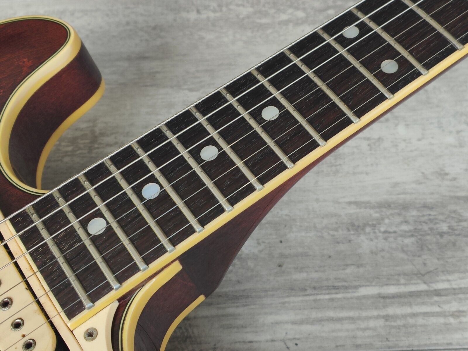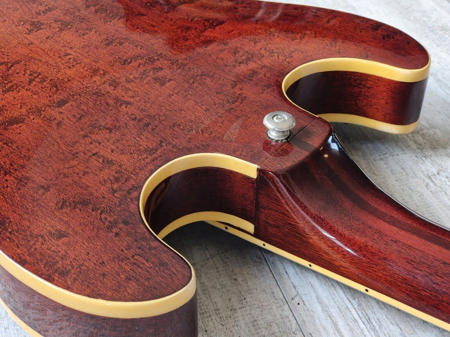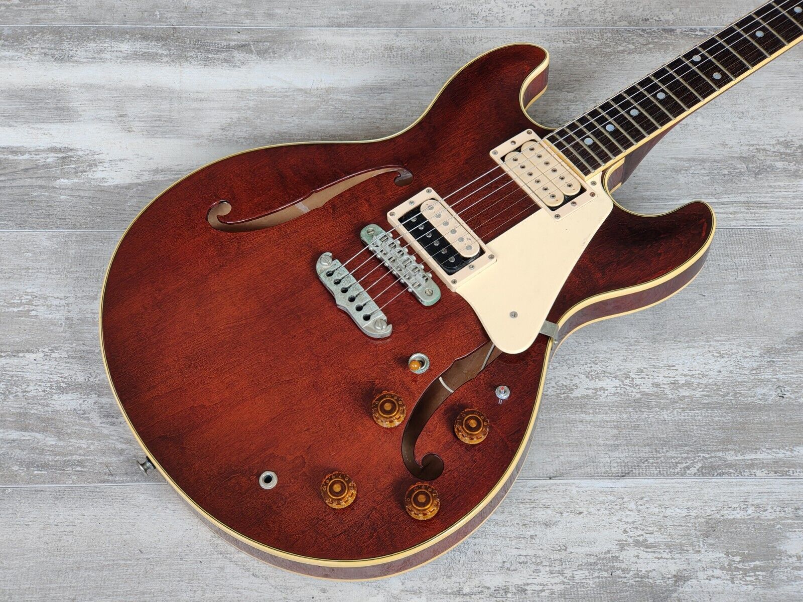Japanese made by the Matsumoku factory in 1982, TA-70 was a high end model from Aria Pro II's original Titan series of semi-hollowbody guitars. Featuring an arched maple top and back with maple sides, a laminate maple/mahogany centre block, a maple/mahogany set neck (similar to those used on Aria Pro II's neckthrough models) and a 22 fret rosewood fingerboard. 628mm scale length with a 43mm nut width, it weighs 3.7kg's. Loaded with the original MMK75 pickup in the bridge position and an aftermarket vintage Dimarzio Super Distortion in the neck, the hardware appears all original.