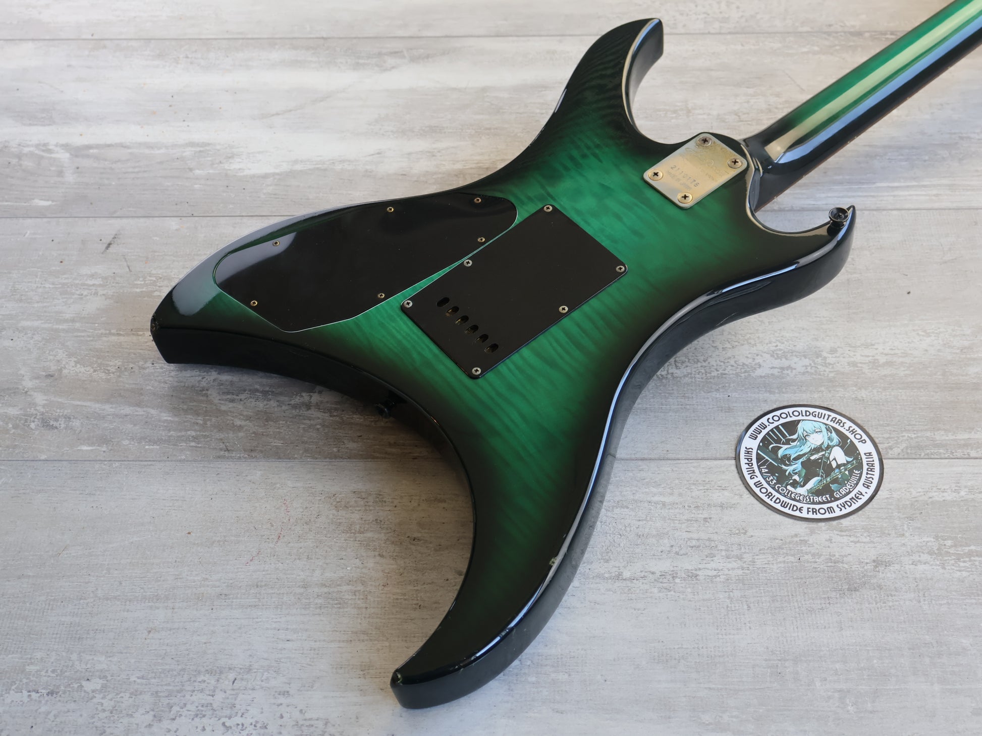 Made by the Matsumoku factory in late 1982 for release in Aria Pro II's 1983 catalog, the Urchin Deluxe was a new model in the U series and featured a brand new modern "Green Black Burst" finish. Solid alder body with a laminate flame top and back bolted to a maple neck with a 22 fret rosewood fingerboard (648mm scale length), it weighs 3.8kg's.