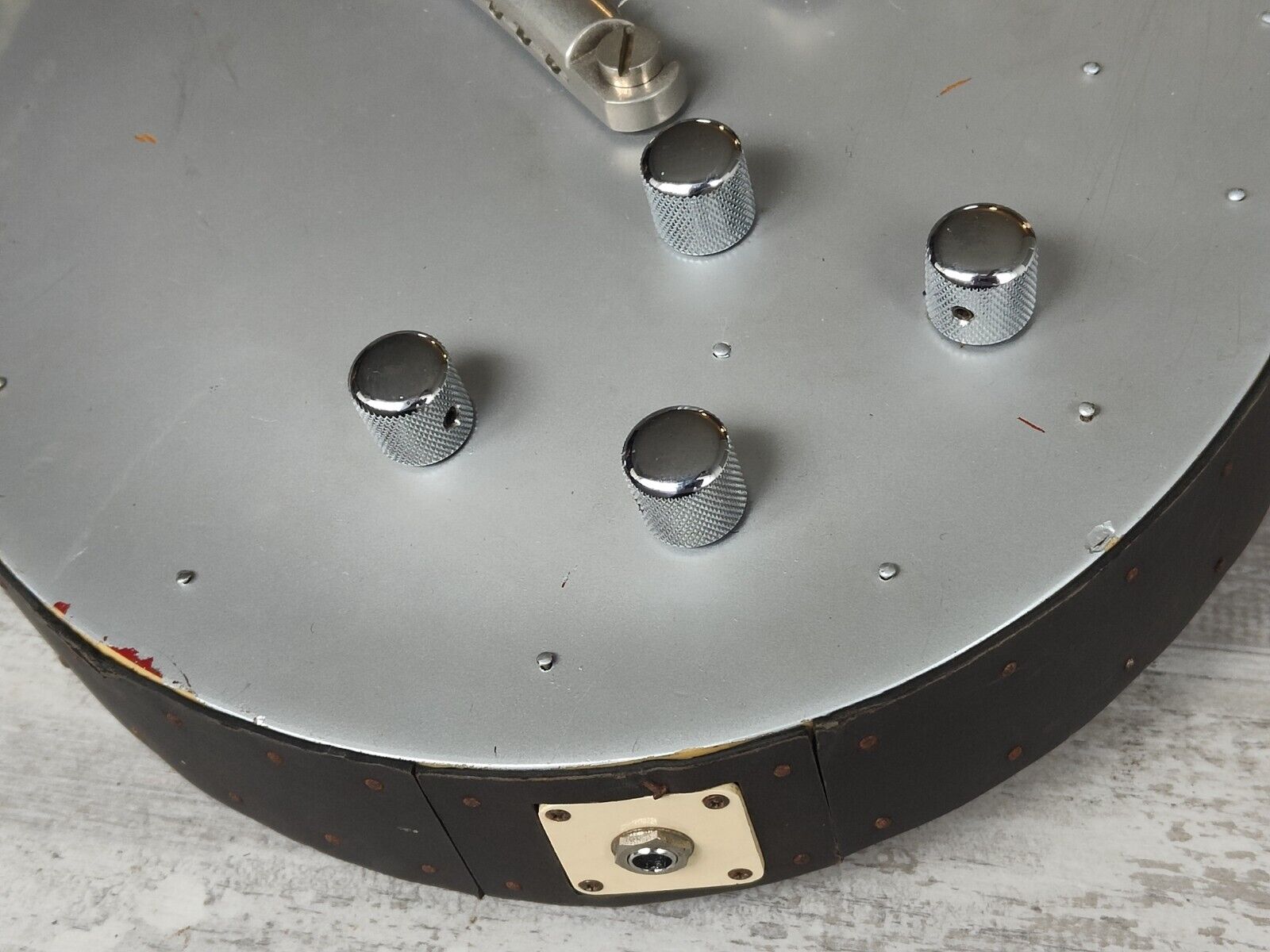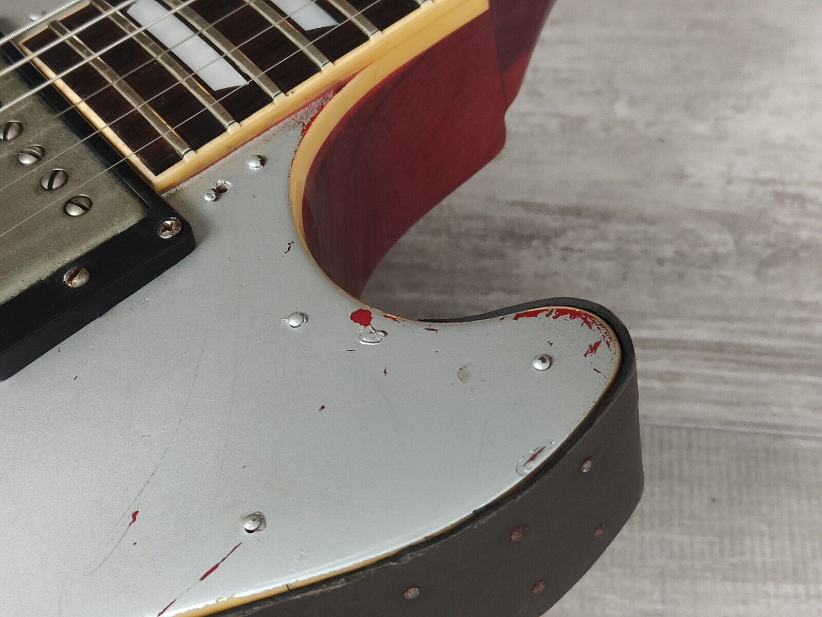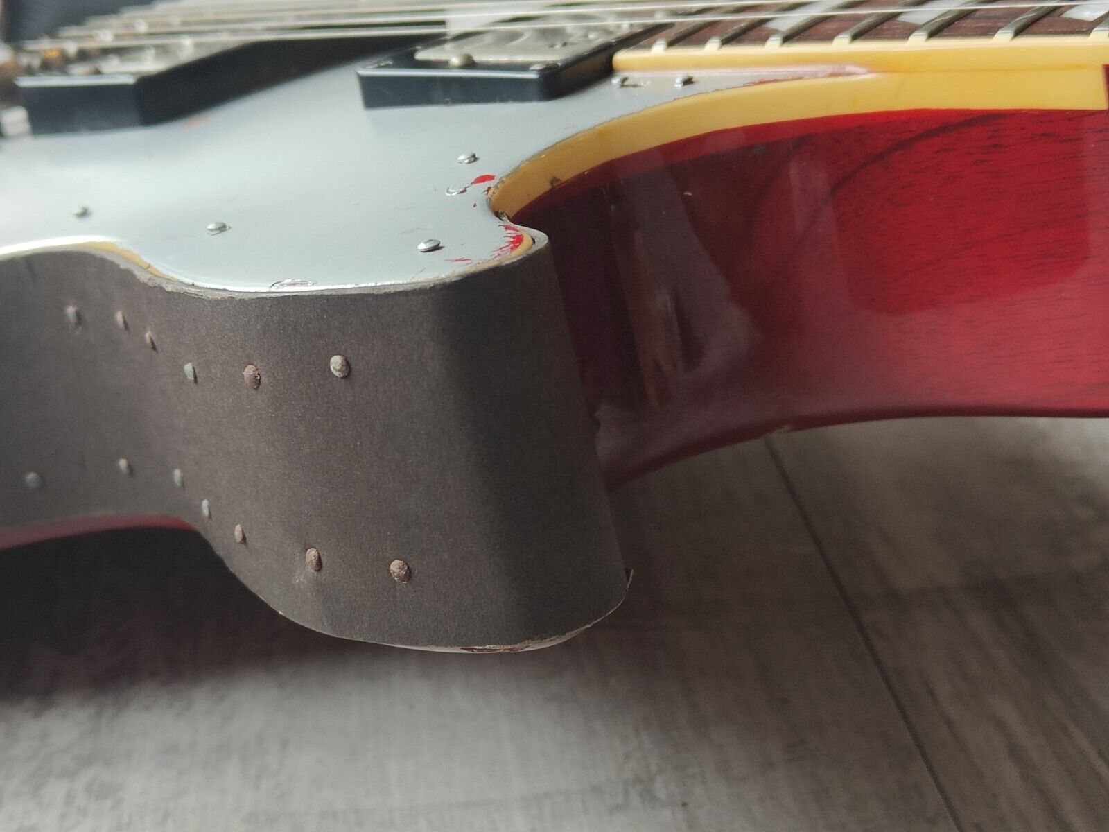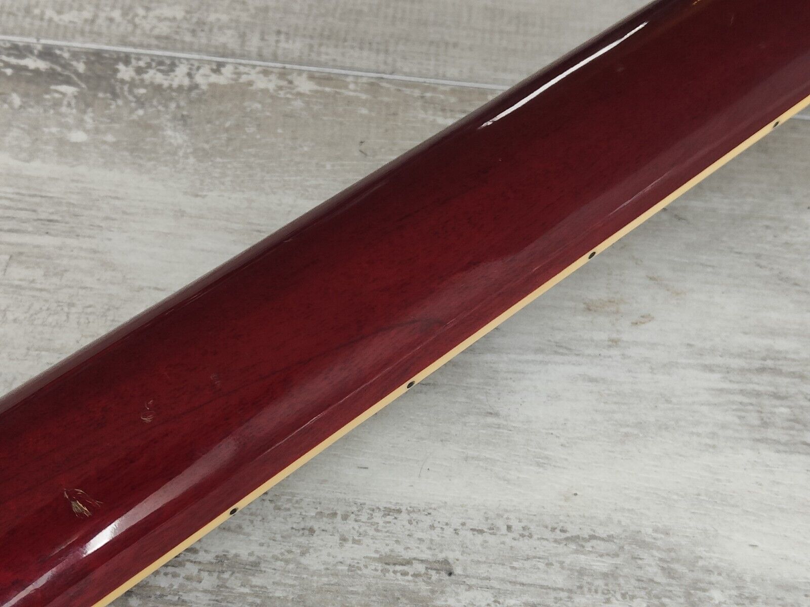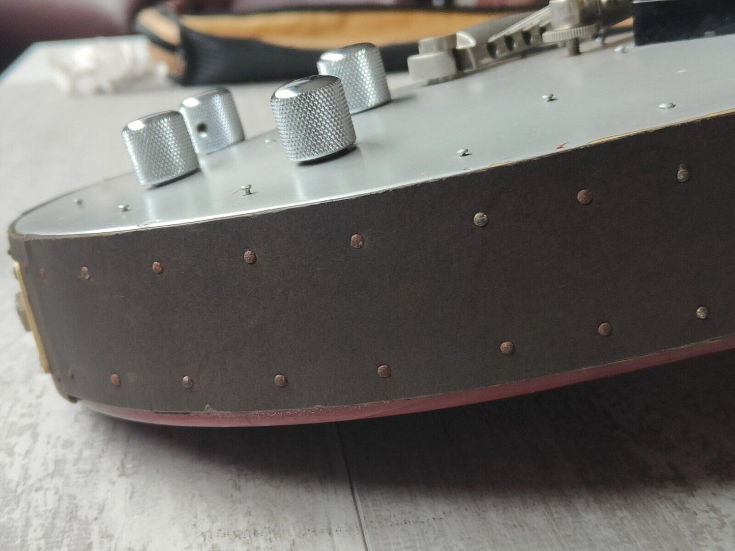 Japanese made Burny guitars are held in high regard in the guitar community and it's very easy to see why. Built in 1983, this RLG-50 Super Grade Les Paul has lived what i'm guessing is a fascinating life.. Slim profile on the mahogany neck, rosewood fingerboard, mahogany body that's had the top painted silver and leather riveted to the side, it weighs a hefty 4.3kg's and sounds huge with the stock humbuckers.