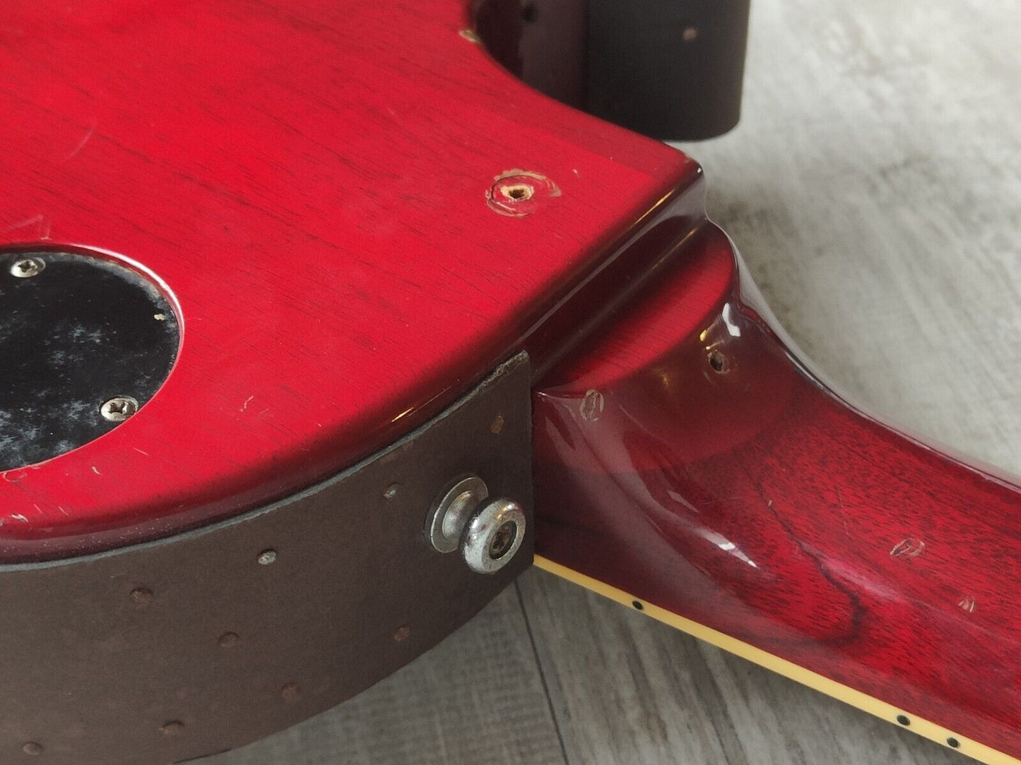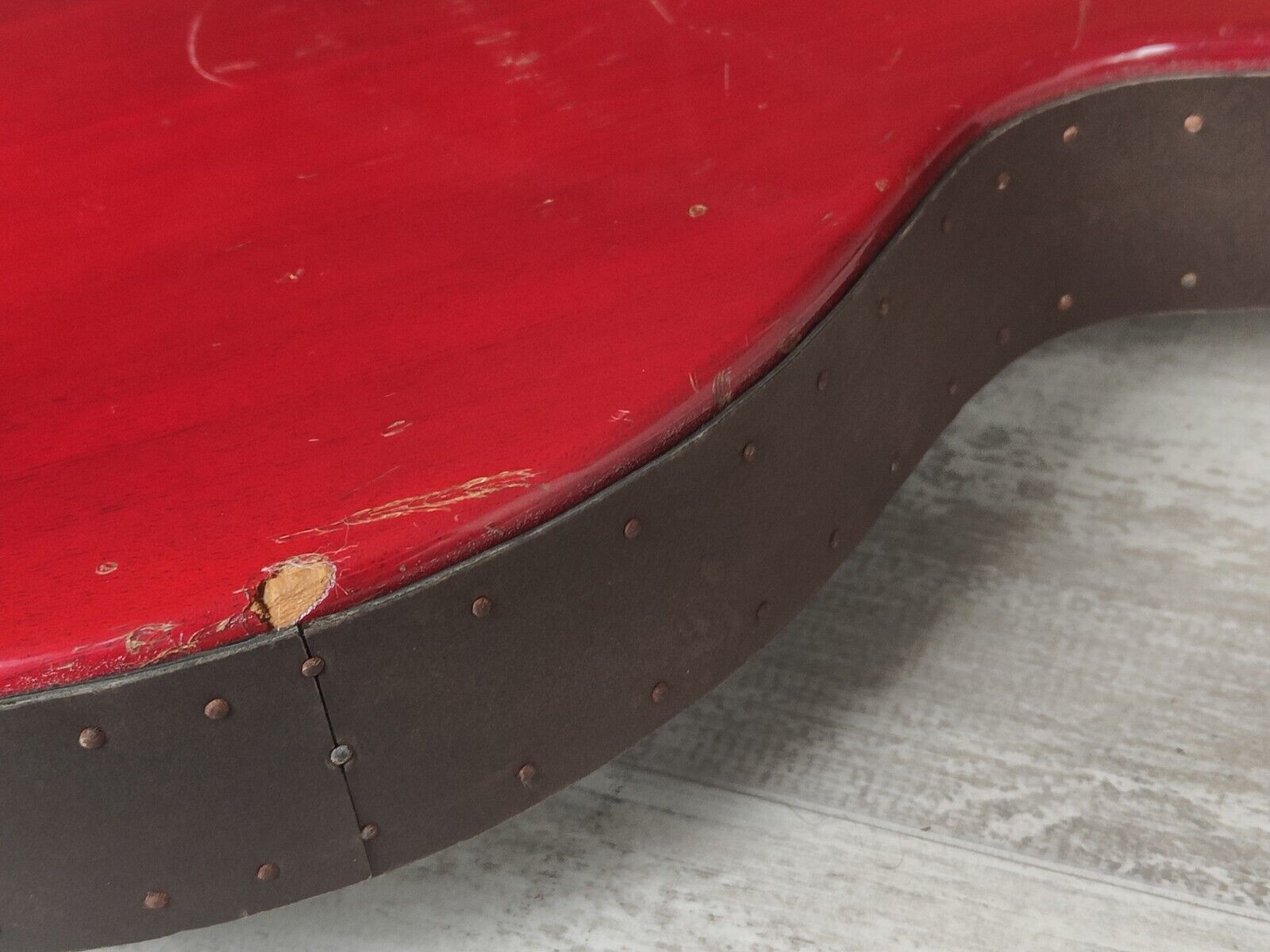 Players grade condition as pictured, given a setup and service prior to listing including a new output jack, a new nut, fretboard oil, fret polish and restring. The paint and leather is likely removable if you're into that sort of thing, or enjoy it as a very playable art installation.