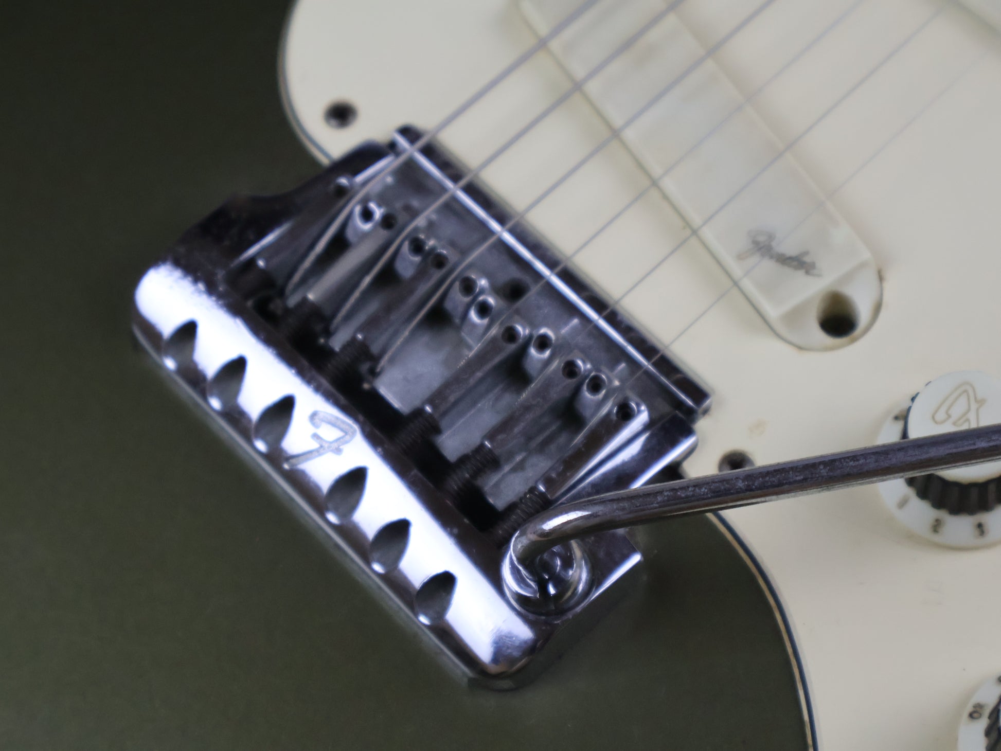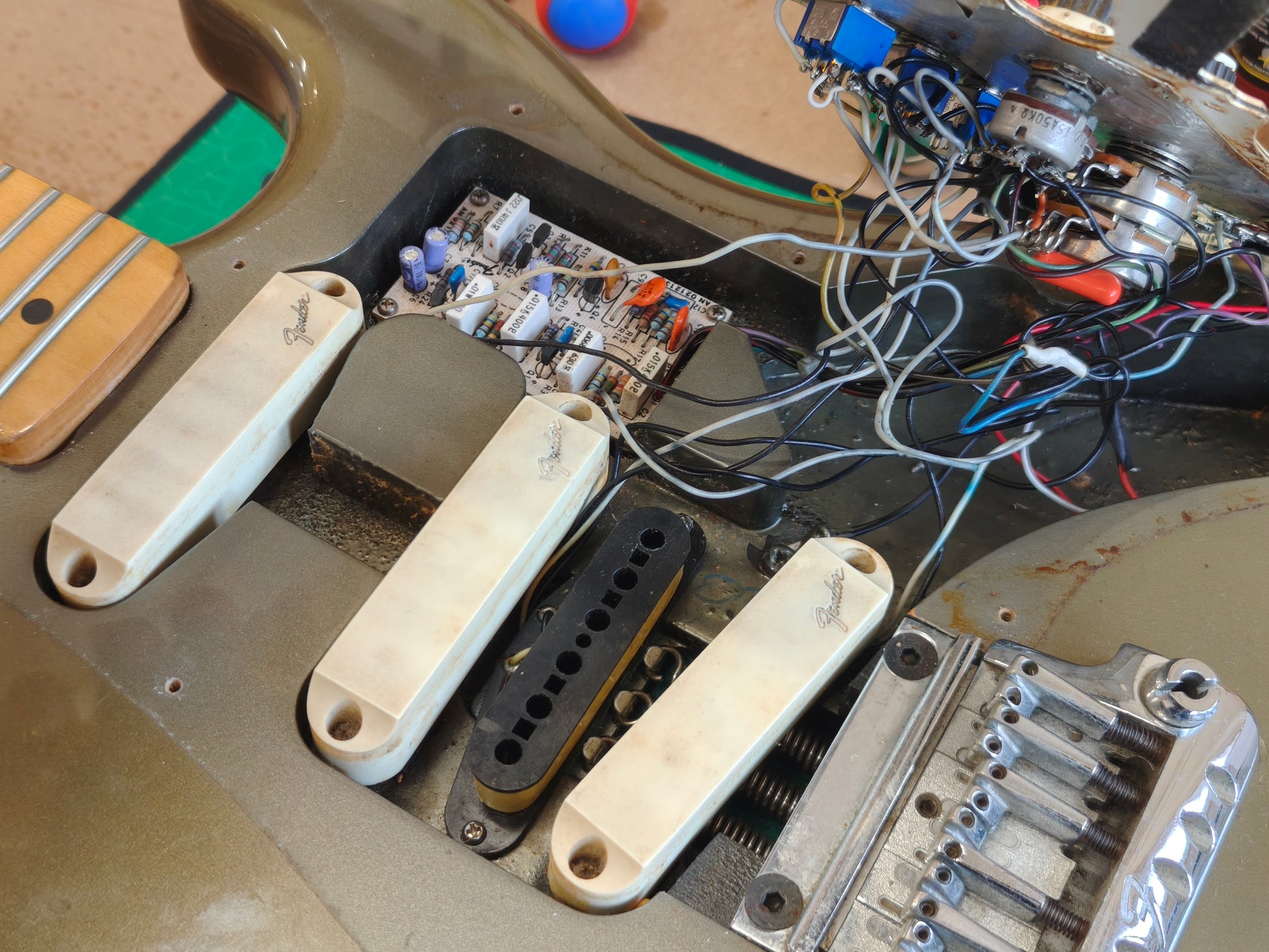 Made in the USA in the early 1980's before production moved to Japan, the American Elite Stratocaster was a short-lived design that led to the creation of the Eric Clapton signature models released a few years later. Alder body wearing a beautifully aged Satin Jade Pearl Metallic finish bolted to a 21 fret maple neck with nice big jumbo frets, it weighs 3.8kg's. Loaded with three Alnico II single coils and an internal dummy coil to kill the hum along with the original TBX treble/bass expander and MDX midrange booster, the push/push buttons were replaced at some point with mini toggles otherwise it looks to be all original.