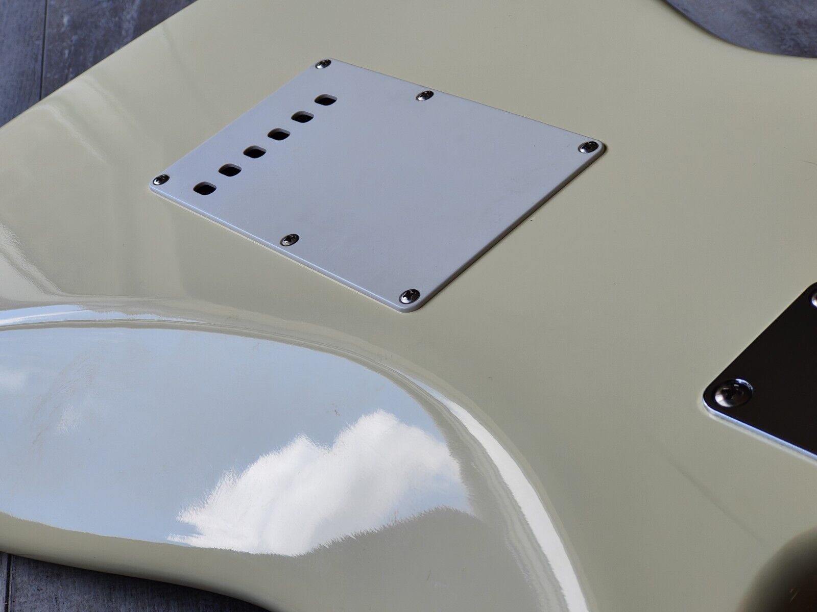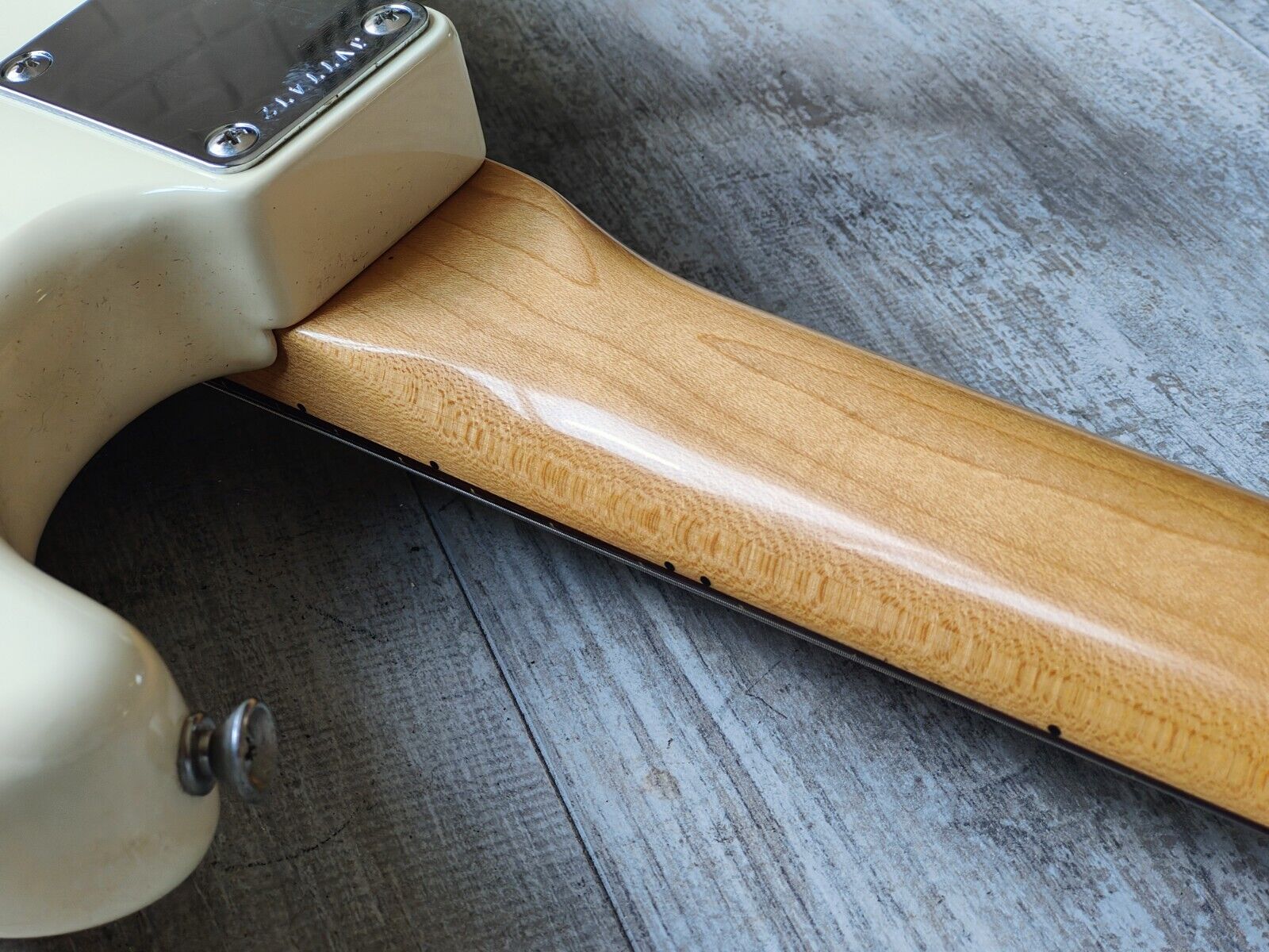 From the famous Fender Japan JV series of guitars made by the Fujigen factory in the early to mid 1980's, this is a very clean example of the Squier branded ST501 model. Olympic White finish on an alder body (with a matching headstock), a U shape maple neck with a 22 fret rosewood fingerboard (medium jumbo frets, 42.5mm nut width, 648mm scale length), it weighs 3.5kg's. Seemingly all original with Hod Rod alnico single coils and an End Rox tremolo system.