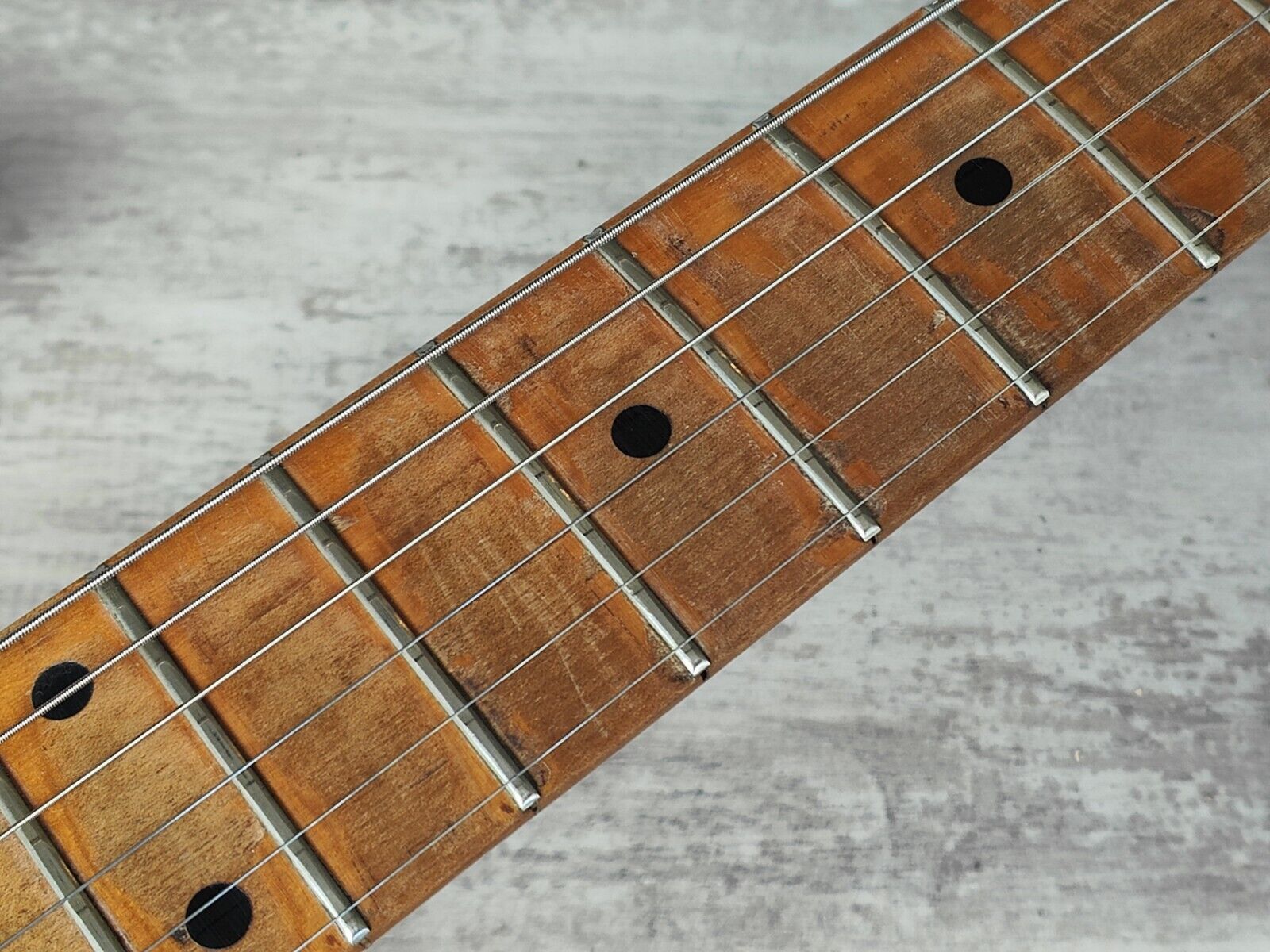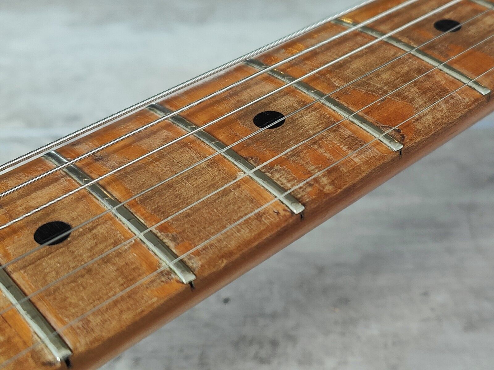 Heavily used vintage condition with loads of wear from plenty of professional level use. A few of the higher frets have been partially scalloped and the back of the neck feels very played and worn. The frets have some pitting and plenty of playwear but were polished prior to listing and play well, the truss was adjusted and the neck is straight. The logo on the headstock has worn off as pictured but the neck stamps prove it's originality.