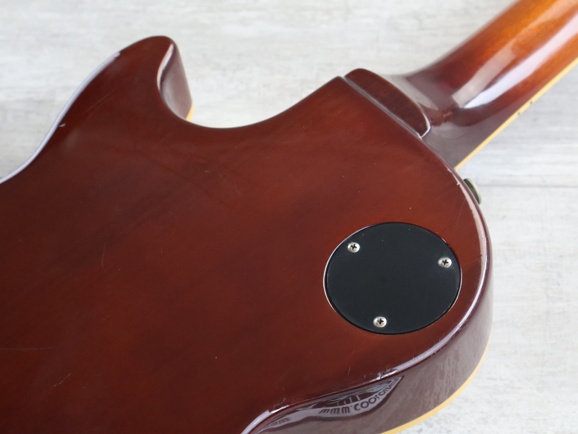 Made in Japan by Yamaha in the mid 1980's, the LP-400 was the entry level Les Paul model sold to the Japanese market featuring the full Gibson aesthetic. Agathis body with a maple top and brown sunburst finish, set mahogany neck with a 22 fret rosewood fingerboard (13.75" radius, slim 60's profile), weighs 4.1kg's. Yamaha Alnico V humbuckers with Yamaha branded button-style vintage tuners, it appears all original except for missing pickguard.
