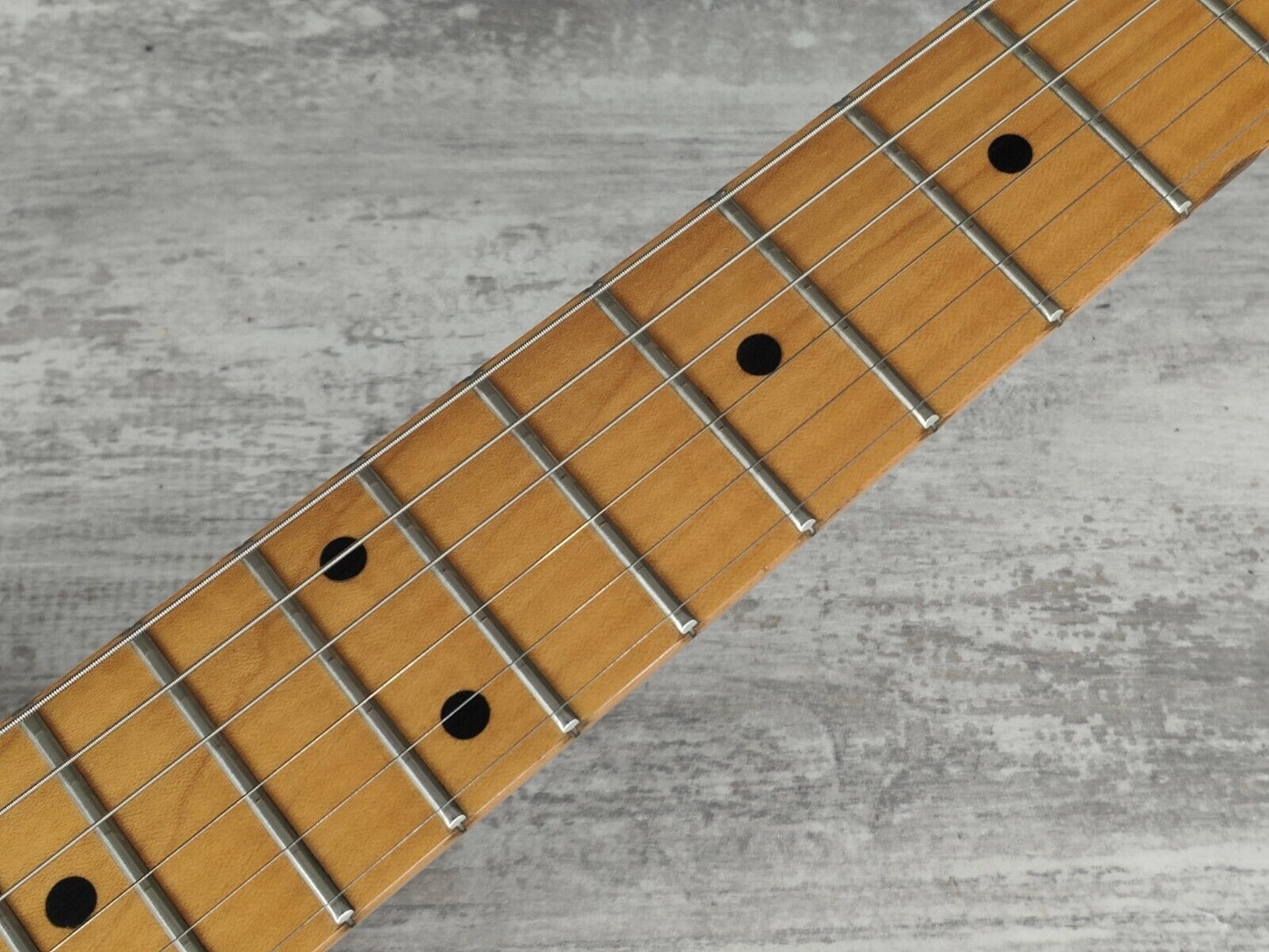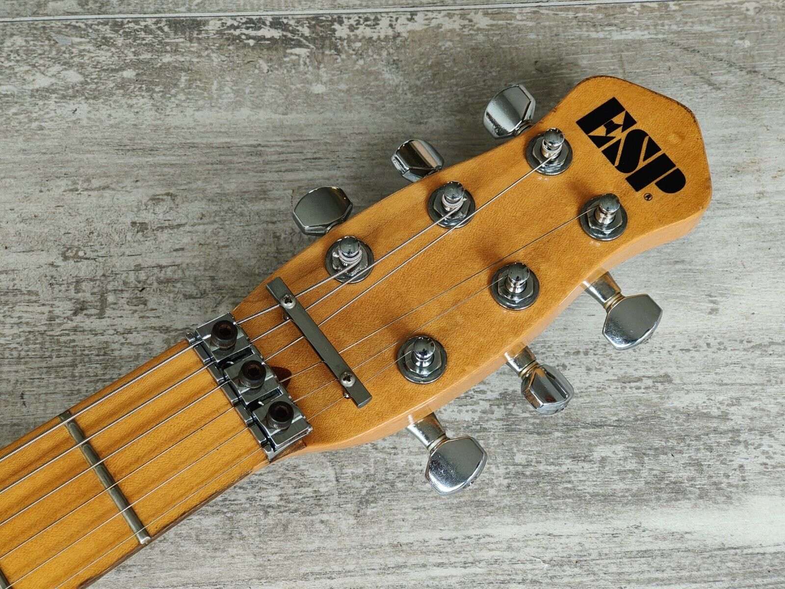 Made in Japan in around 1984 (based on the CTS pot codes and the overall specs/style of the guitar and stamps), this is likely one of ESP's short-run models based on the guitar Akira Takasaki (of LOUNDESS) used throughout the 80's including the bands US dates in 1985. Solid alder body with a maple neck (pronounced V profile, 22 frets), it weighs 3.5kg's. Loaded with a pair of ESP branded humbuckers and a top-mounted locking tremolo system along with the traditional 6IL tuners mounted in a 3x3 layout. Single volume knob with a 3-way pickup selector and a straight-to-output mini toggle that bypasses the volume knob.