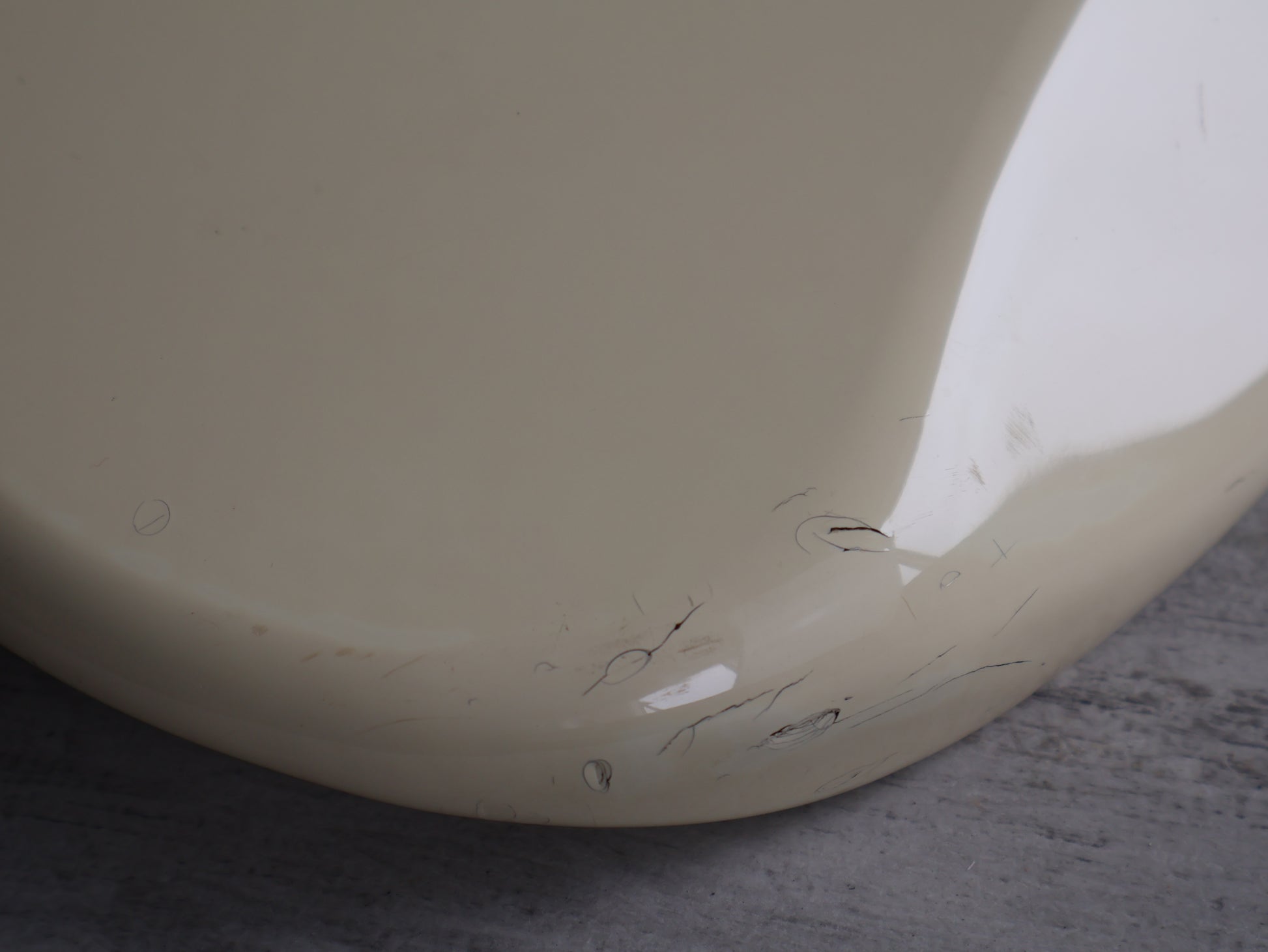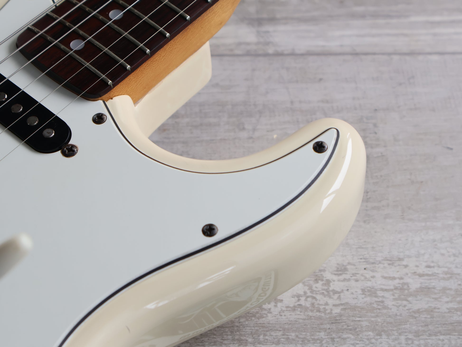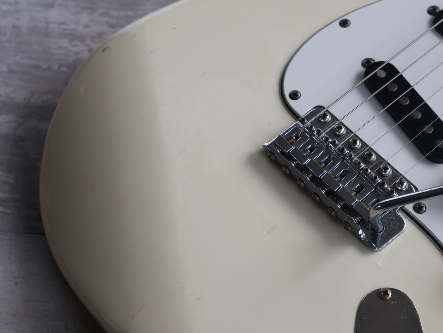 Solid basswood body wearing a stained/faded Olympic White finish bolted to a maple neck with a 21 fret rosewood fingerboard, it weighs 3.6kg's. Looks to be all original as pictured with Fender branded tuners, full sized pots, a 6-point tremolo system and three-bolt neck plate with micro-tilt system.