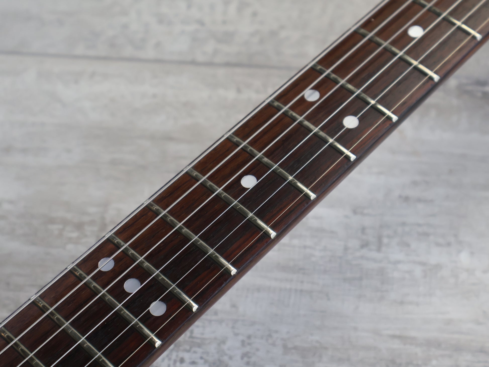 Made by the Fujigen factory in 1984, the BM-80 was the production model that was introduced after the success of the limited run BM-900 of the late 1970's. Bound mahogany body with a nice slim 60's style mahogany neck, 24 fret rosewood fingerboard, it weighs 4.2kg's. Loaded with three pickups made by Maxon exclusively for this model controlled by three individual on/off toggles and three phase switches along with master volume and tone knobs.
