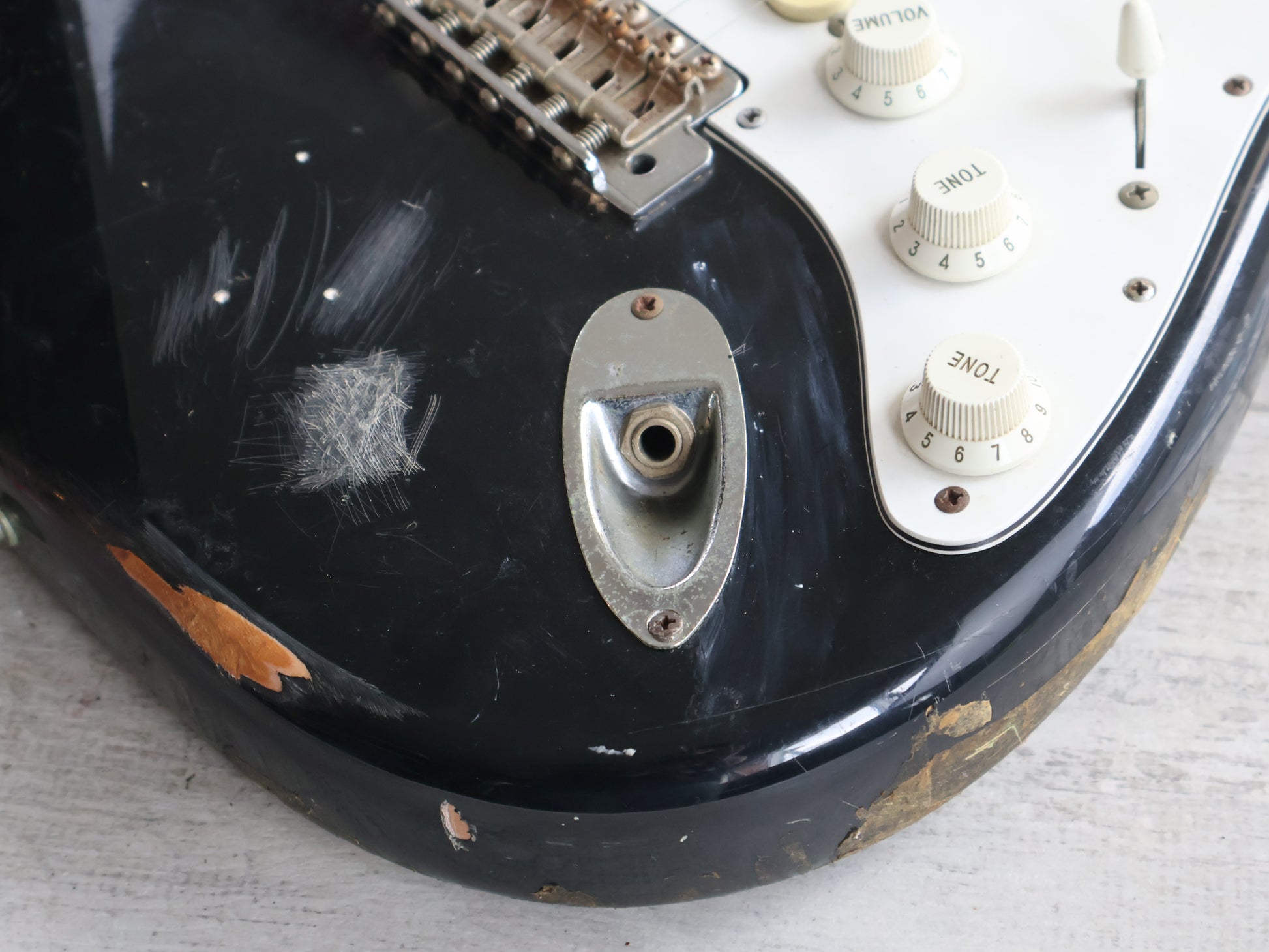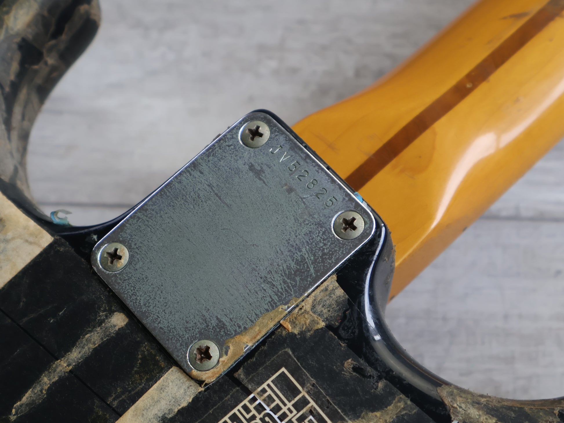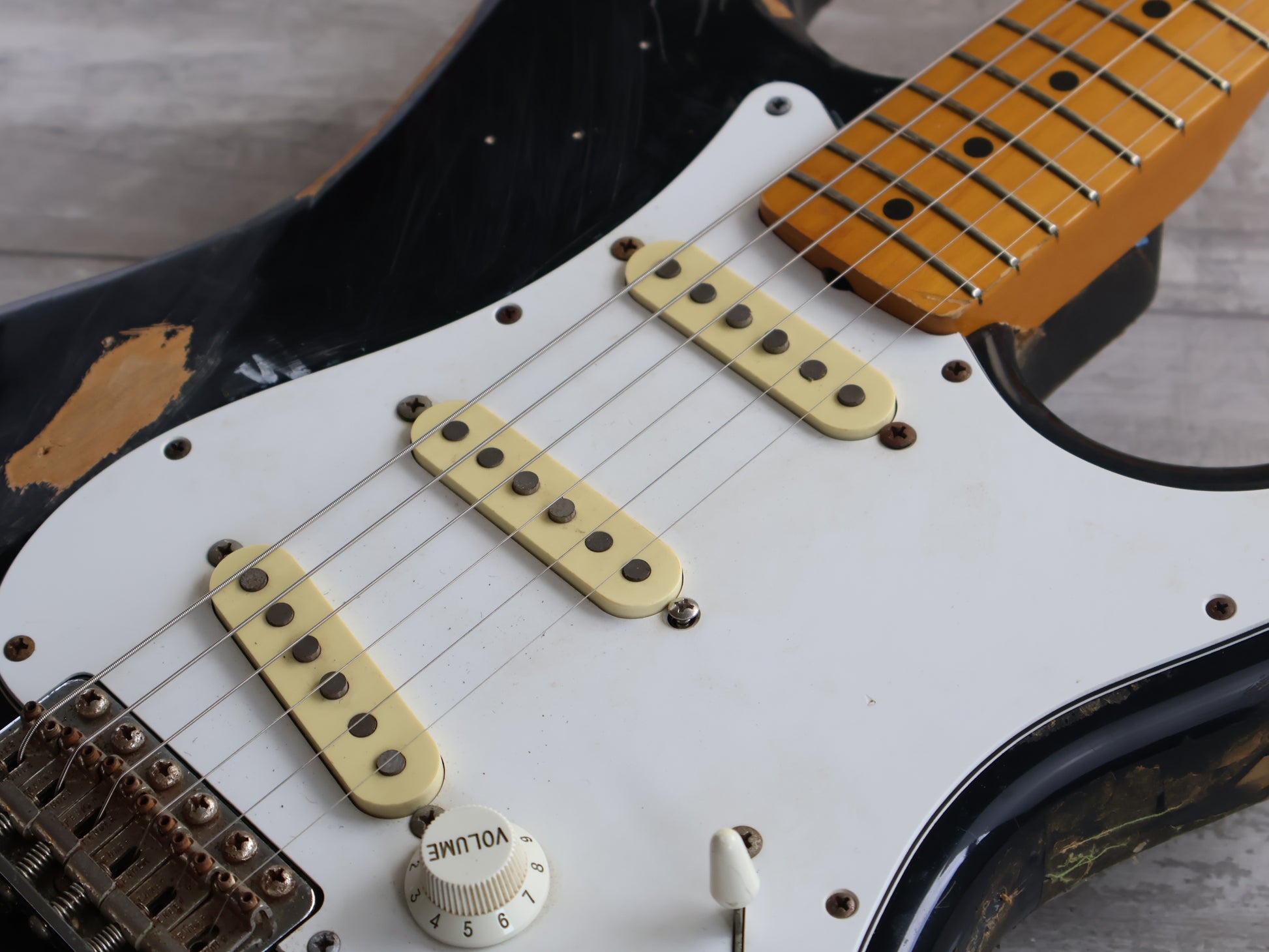 Part of the acclaimed "JV" series of guitars made by the Fujigen factory in Japan in the early 1980's, this is a Squier SST-30 model from the 1984 catalog. Heavy relic black finish on a basswood body with a very nice 21 fret maple neck, it weighs 3.6kg's.