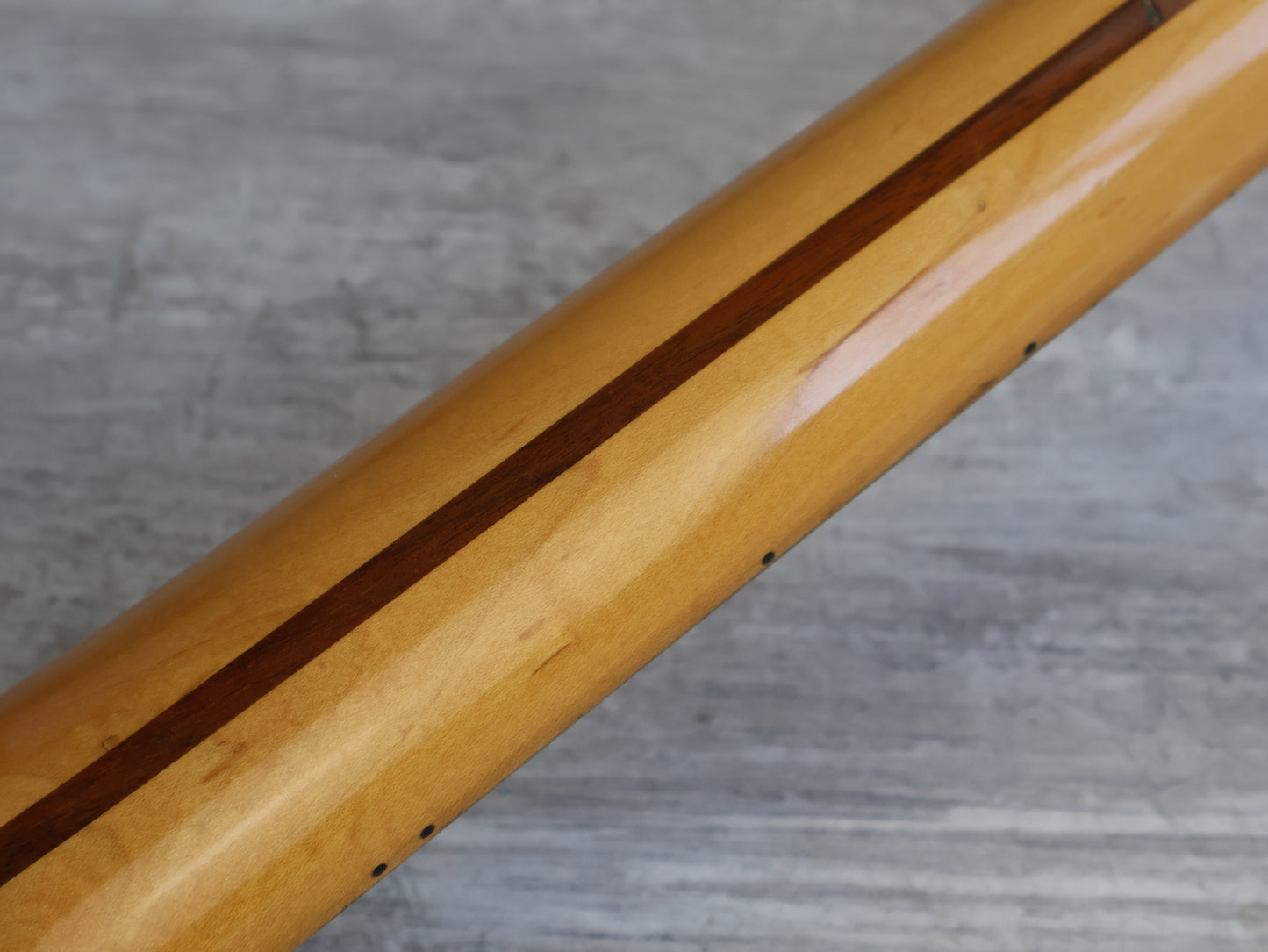 Made in Japan in 1984, the TSS-38 Silver Star was one of Tokai’s replicas of the CBS era Fender Stratocaster. Large headstock with a bullet truss and tilt adjuster on a three-bolt neck plate, it weighs 3.5kg’s. Alder body with a gloss black finish, one piece maple neck with a comfortable rounded C profile (40mm nut width), 21 fret maple fingerboard. Loaded with the original Tokai SS-HOT alnico pickups in the neck and middle positions and a generic rail humbucker in the bridge.