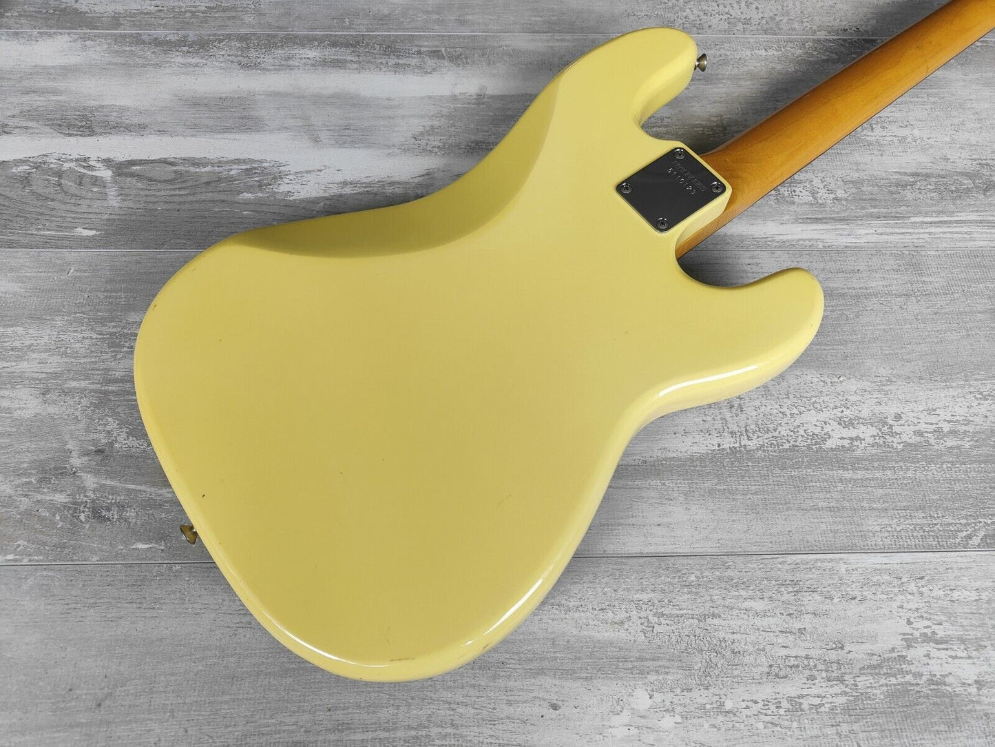 Made by the Matsumoku factory for Fernandes in late 1985, the PB-40L was part of a short run of LH basses built in limited numbers. Vintage white finish on an alder body with a maple neck (7.25" radius, 40mm nut width), it weighs 4.2kg's. Appears all original with four-screw full sized tuners, a Japanese P-bass pickup and volume/tone knobs, the original white finish has faded nicely to a near cream aesthetic.