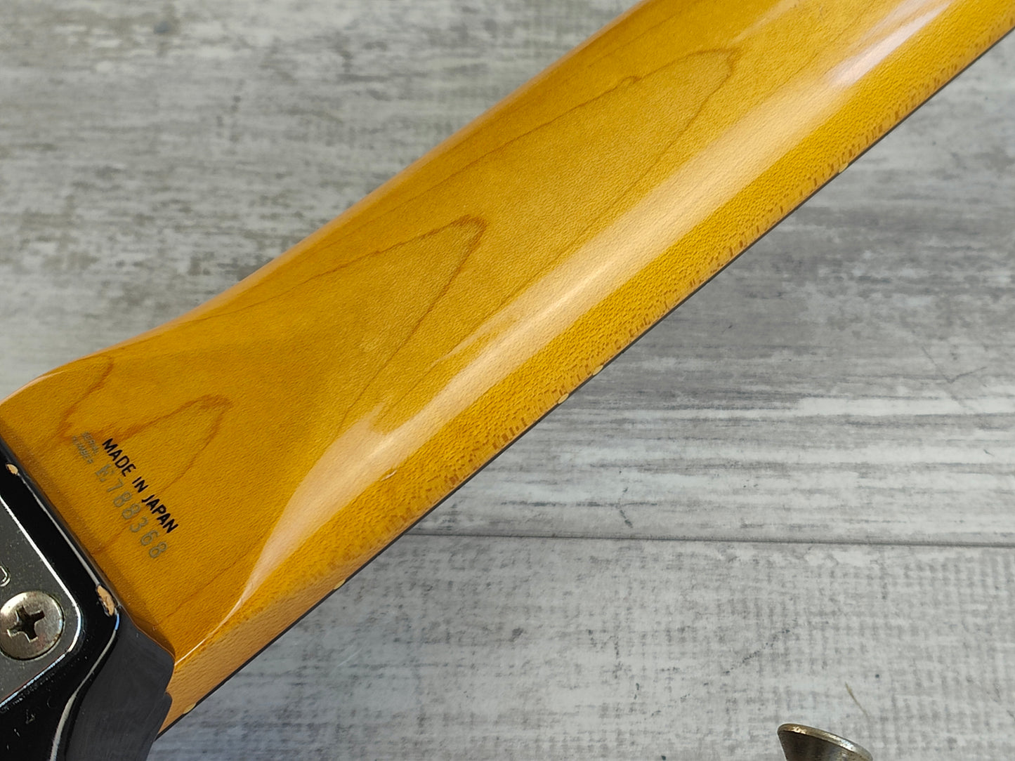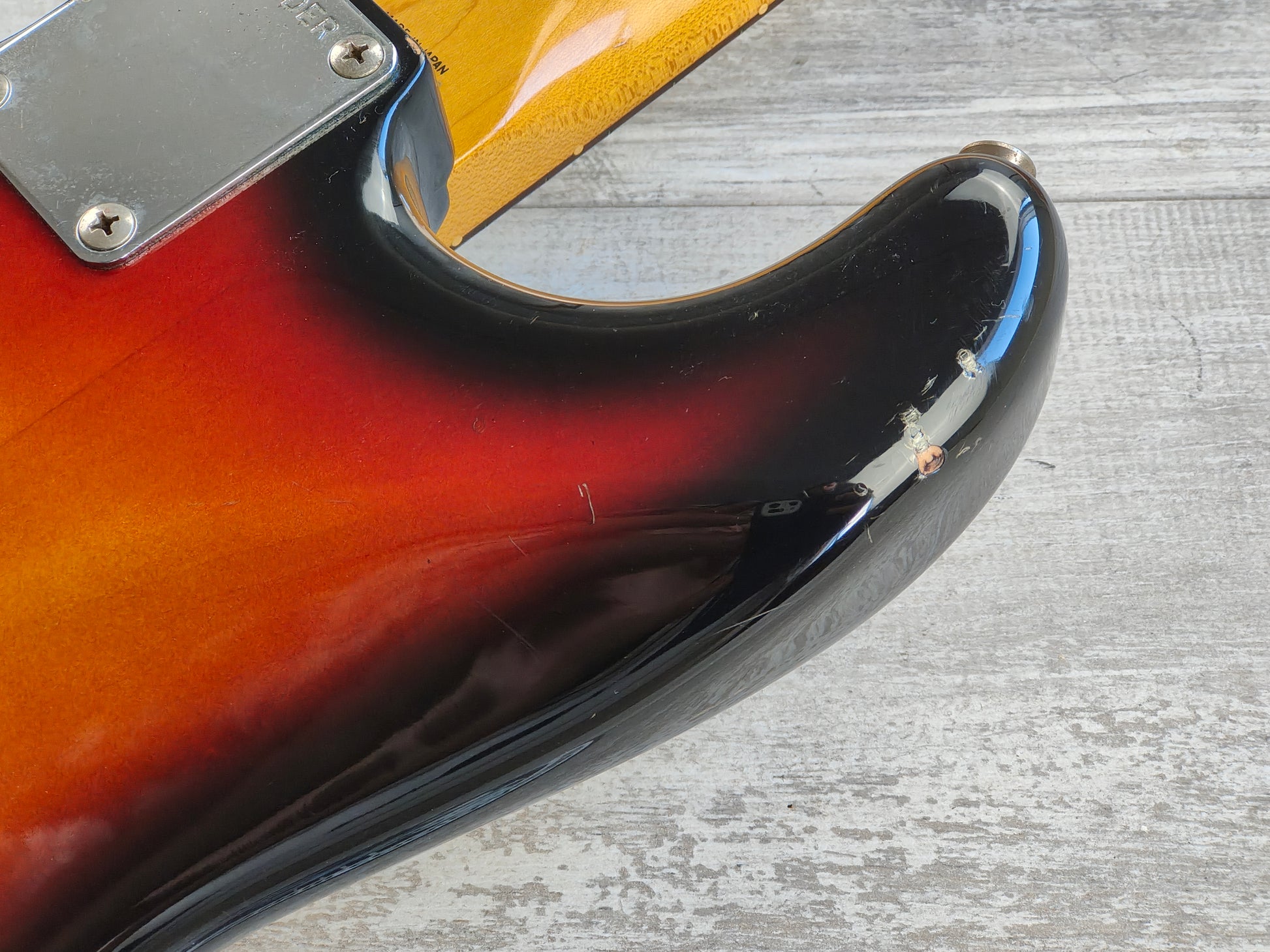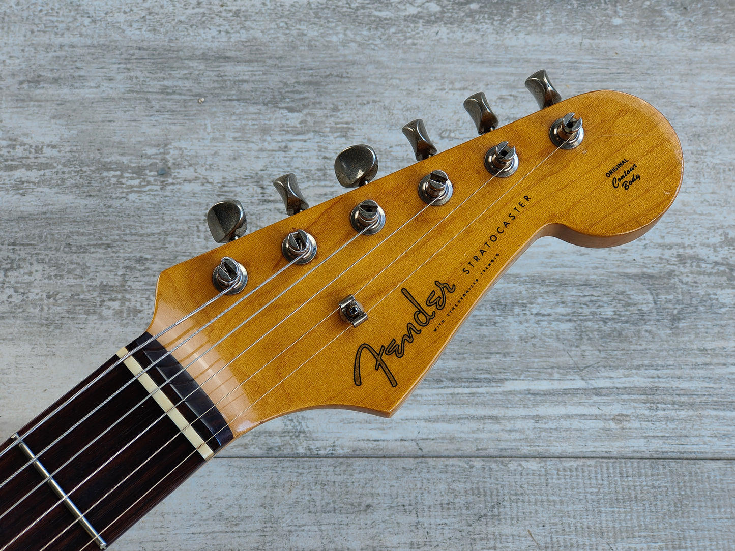 Made by the Fujigen factory in 1987 as part of Fender Japan's famous "E Series". The ST62-55 was a '62 reissue model featuring a basswood body with a three-tone sunburst finish bolted to a maple neck shaped with the classic slim C neck profile (7.25" radius, 43mm nut, 648mm scale length), it weighs 3.4kg's. Looks to be close to all original under the pickguard with three Fender Japan alnico single coils.