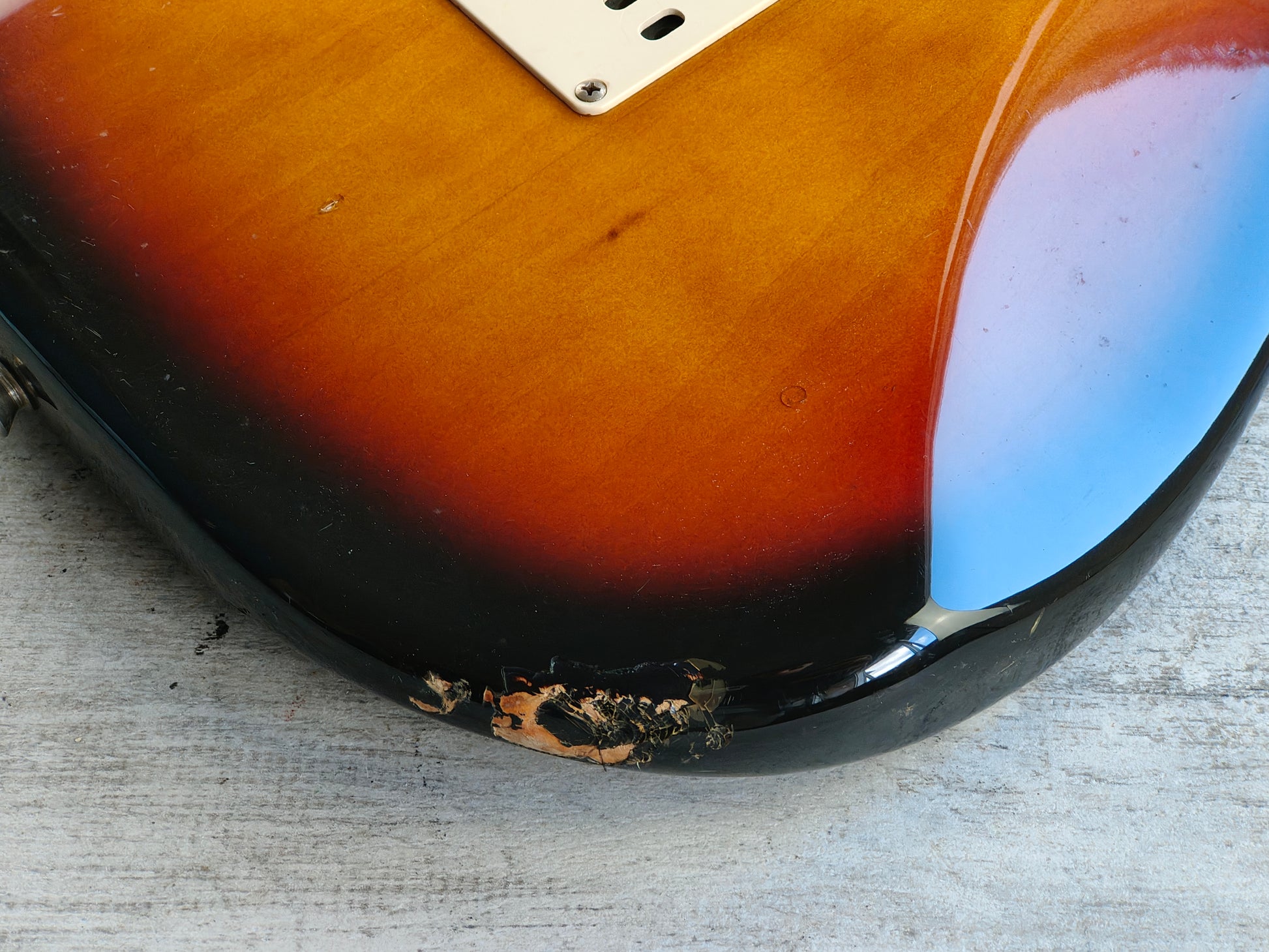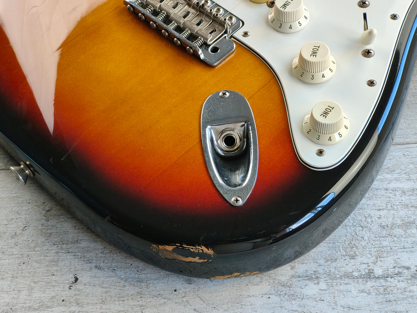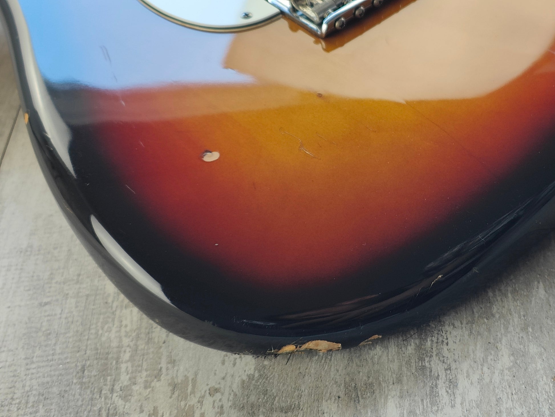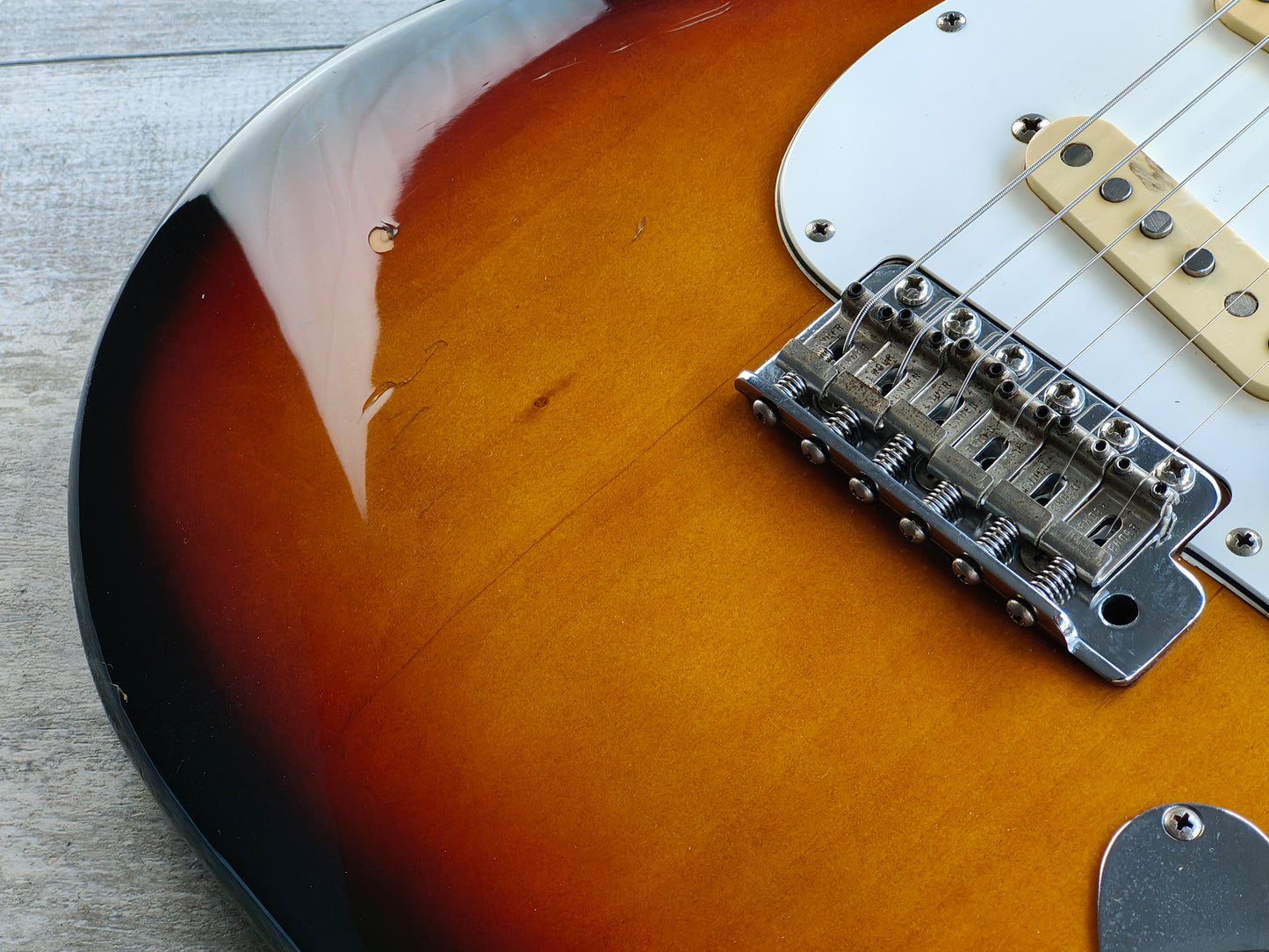 Made by the Fujigen factory in 1987 as part of Fender Japan's famous "E Series". The ST62-55 was a '62 reissue model featuring a basswood body with a three-tone sunburst finish bolted to a maple neck shaped with the classic slim C neck profile (7.25" radius, 43mm nut, 648mm scale length), it weighs 3.4kg's. Looks to be close to all original under the pickguard with three Fender Japan alnico single coils.