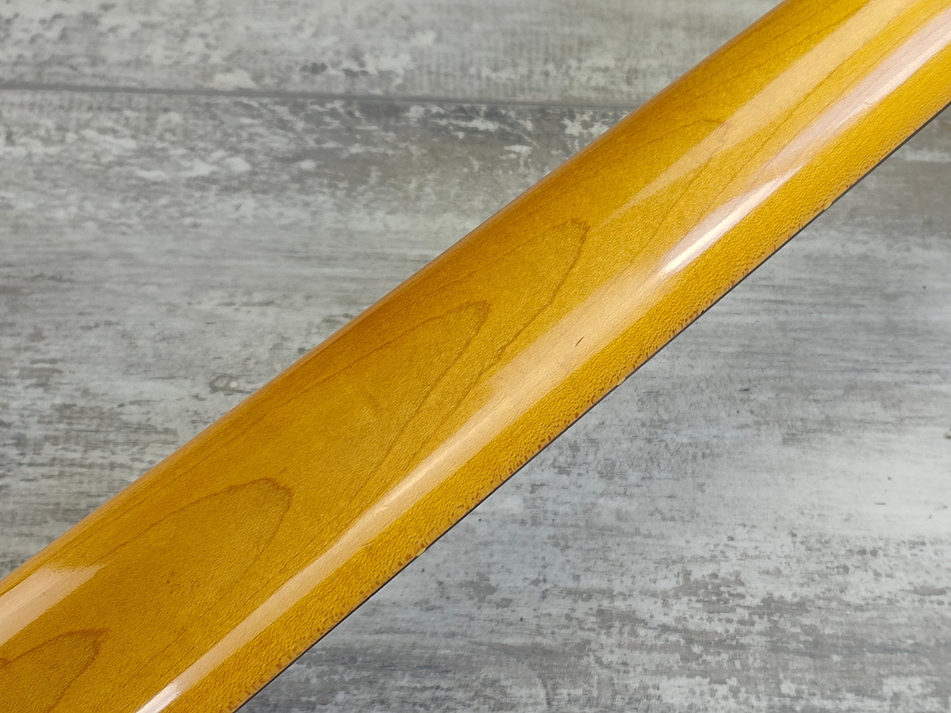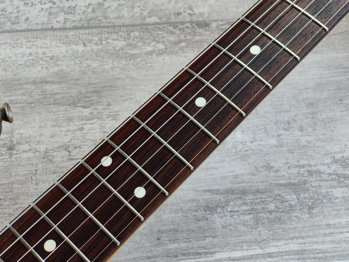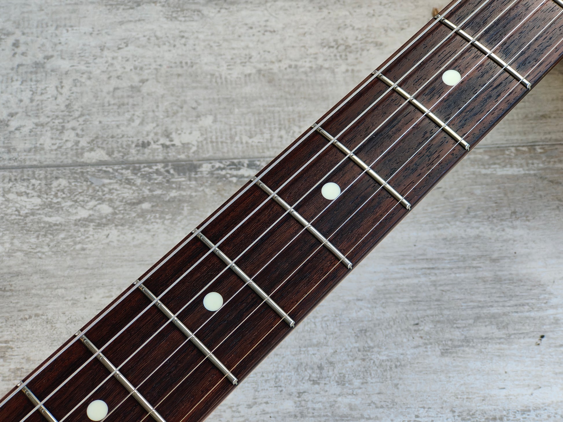 Given a basic setup and service prior to listing including a fret polish, fretboard oil and truss adjustment, there's some light wear to the frets but they still play smooth and the straight neck plays well.