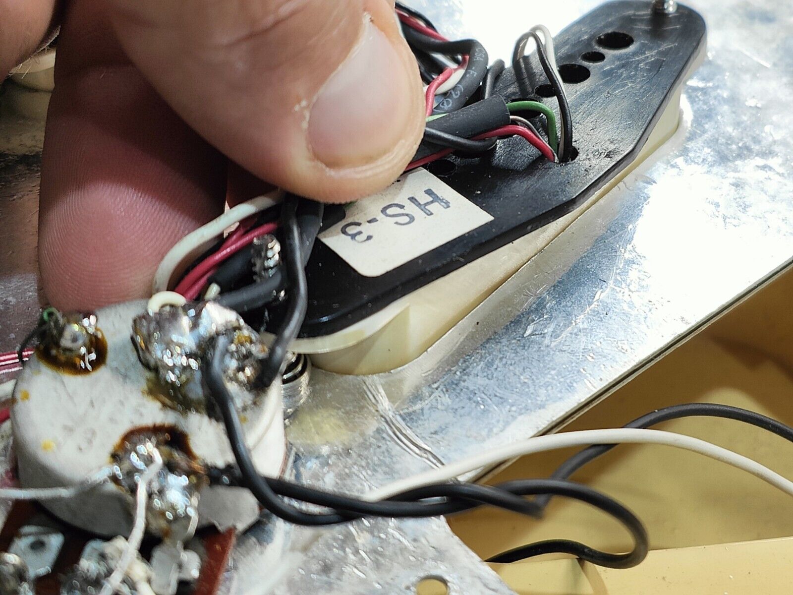 This one dates to 1987 and is built with a basswood body bolted to a maple neck that's fully scalloped from the 12th fret onwards, it weighs 3.5kg's. It's loaded with the original Fender Japan tuners with a Wilkinson tremolo system and two Dimarzio HS-3's flanking a Fender Japan middle pickup (master volume/control knobs with a dummy tone knob that's not wired).