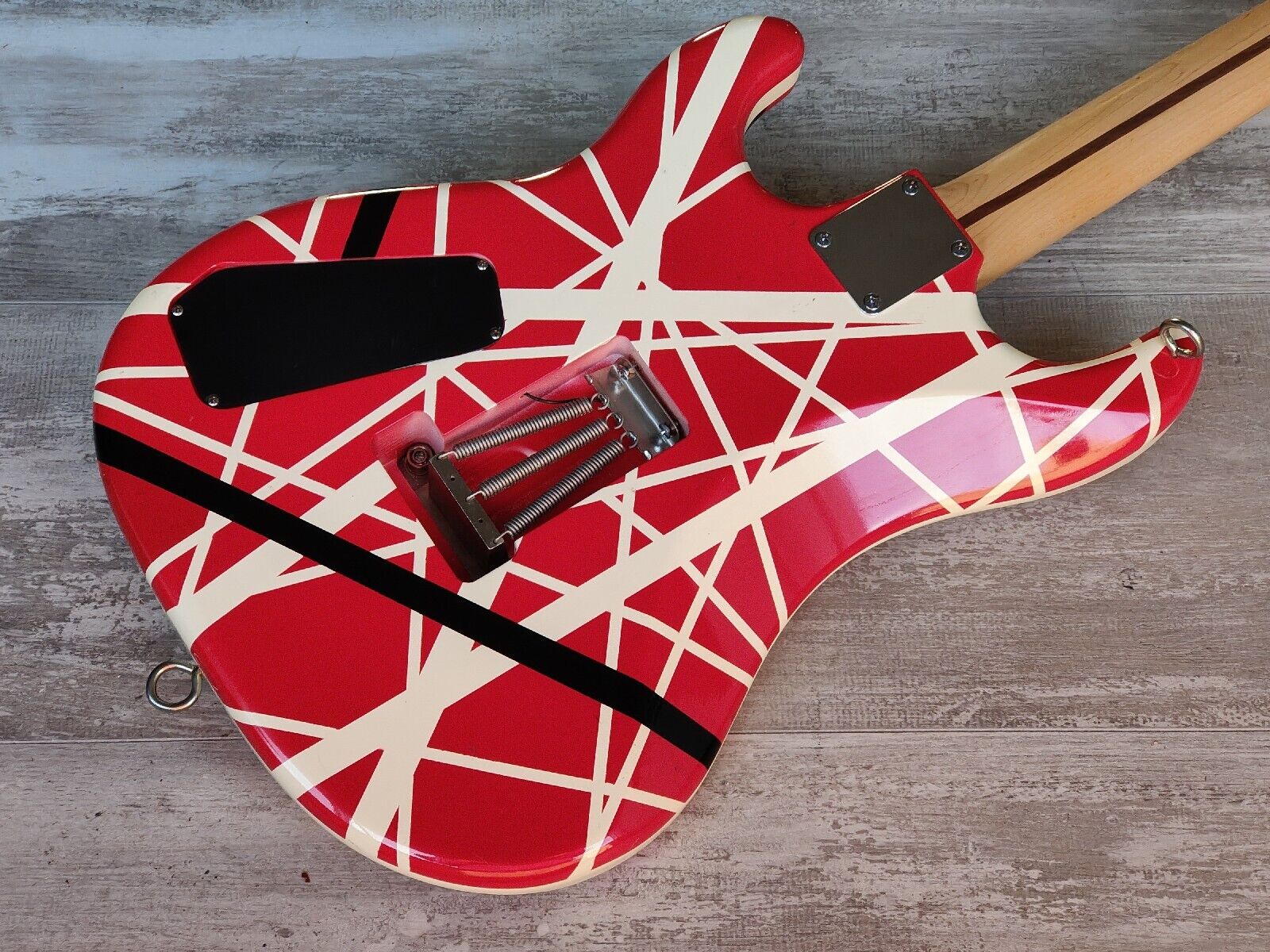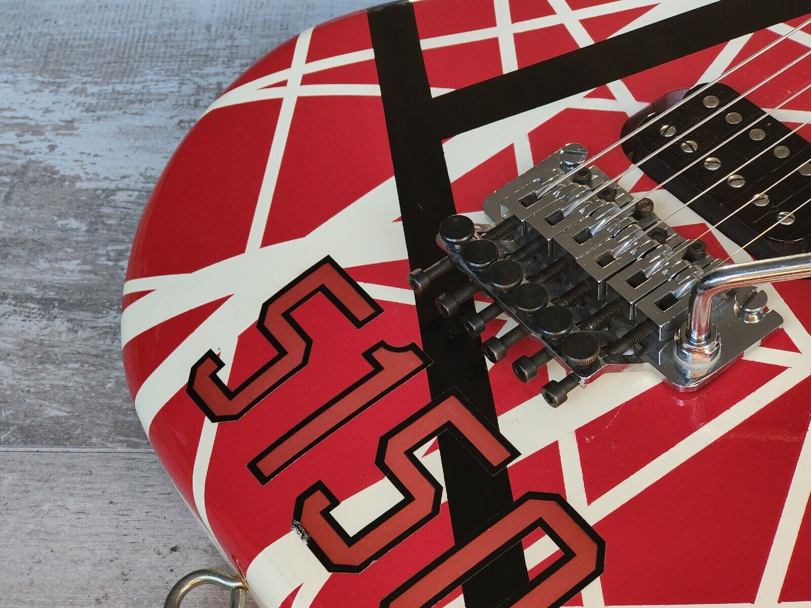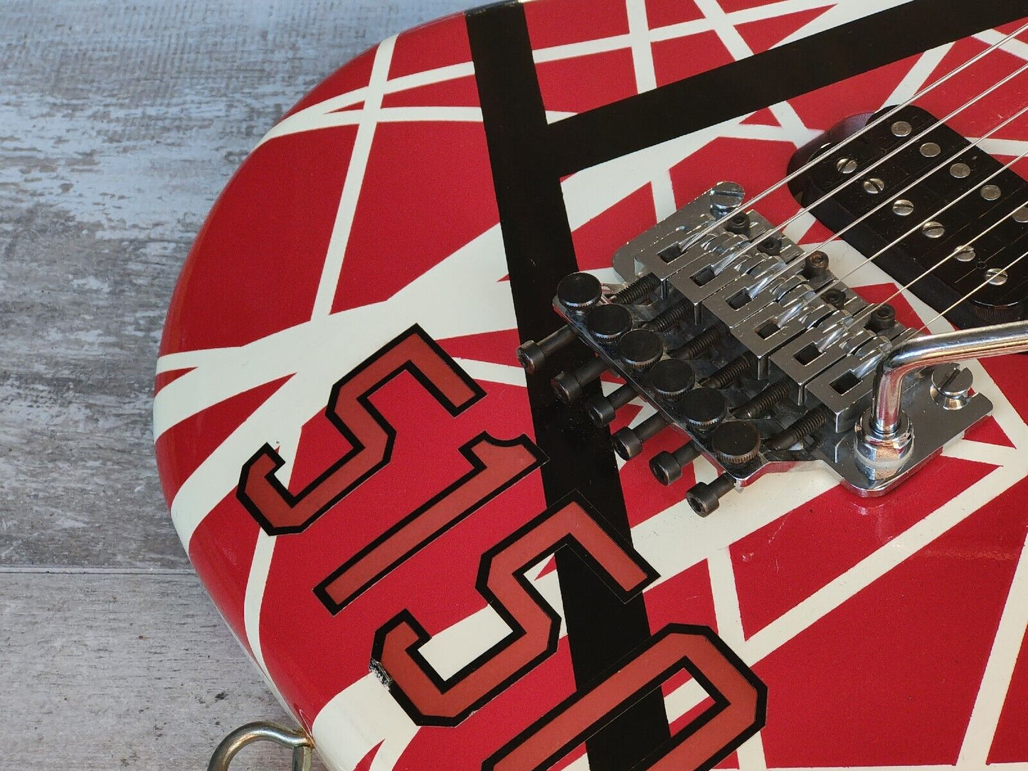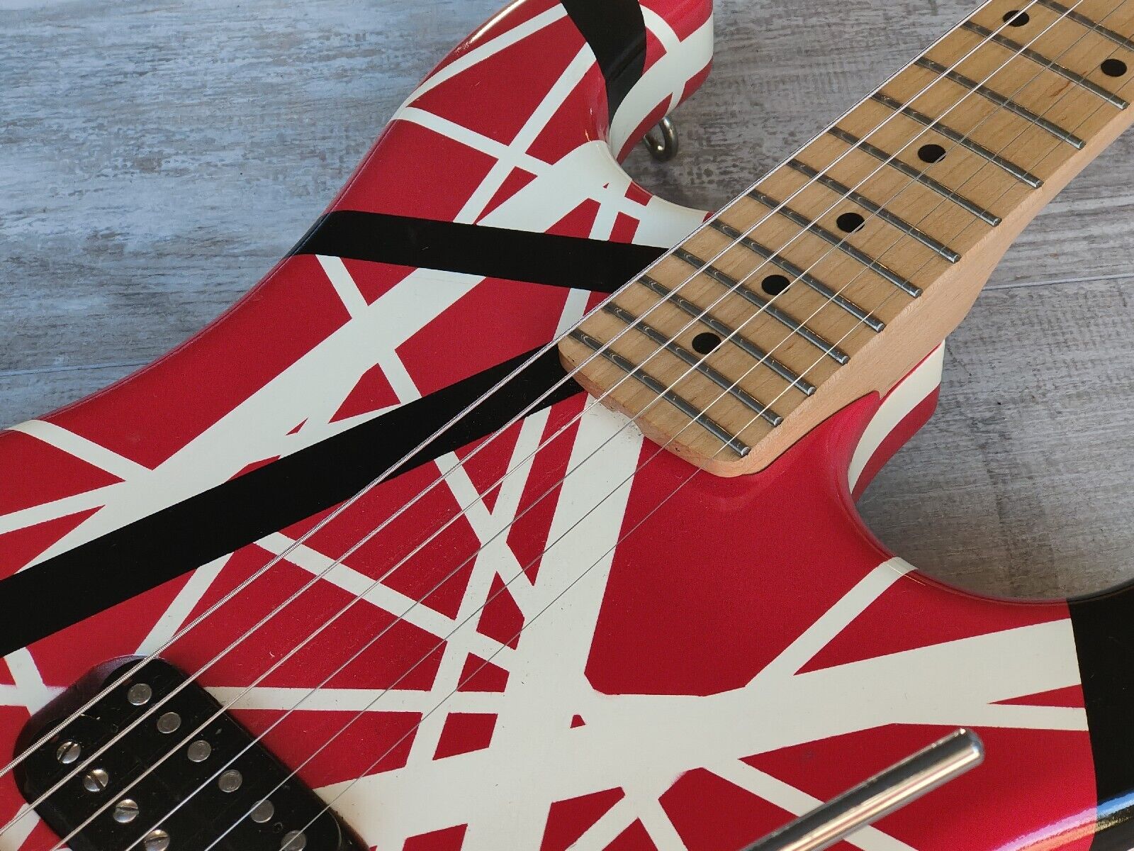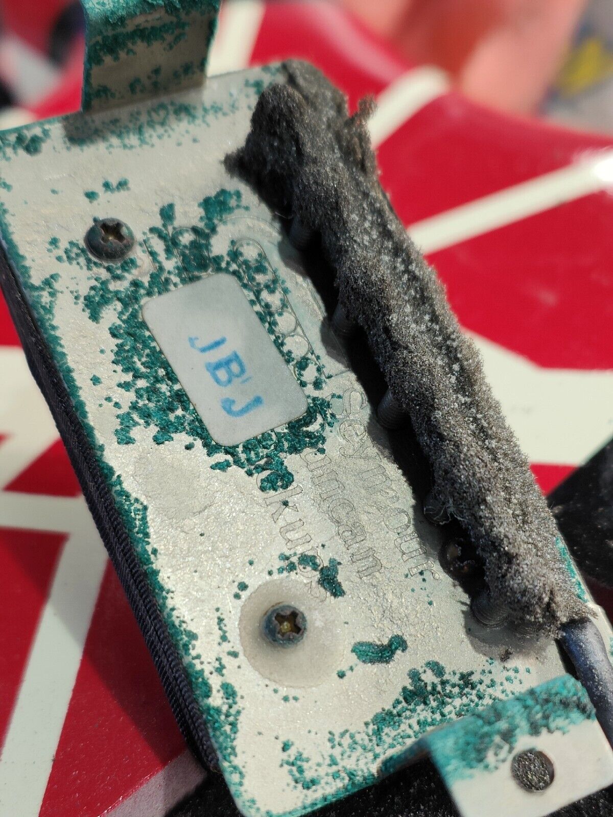 We just had this imported from Japan and it's an incredibly impressive guitar that's shrouded with mystery. No branding anywhere (other than "VH" pencilled on the neck heel), it appears to be a two-piece ash body with a bolt-on maple neck (22 frets, 648mm scale length), it weighs 4.2kg's. Loaded with a full-sized Japanese volume pot (dated to 1988), USA made Floyd Rose and a JBJ stickered Seymour Duncan humbucker, professional grade components for what feels like a professional level guitar.