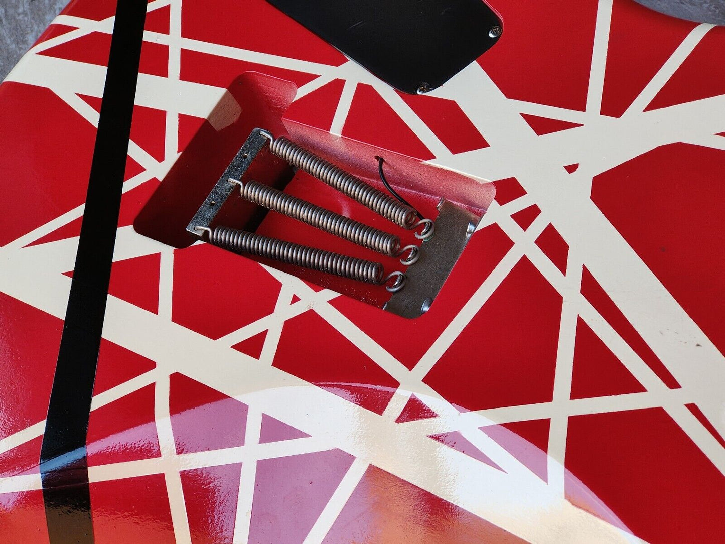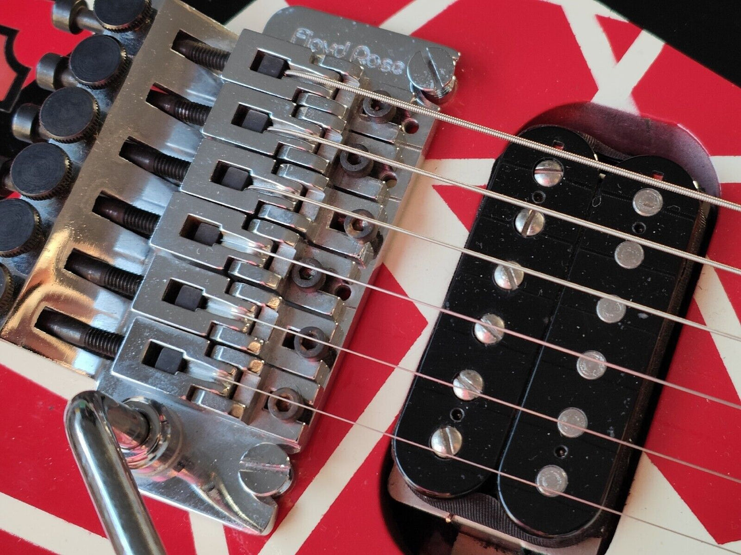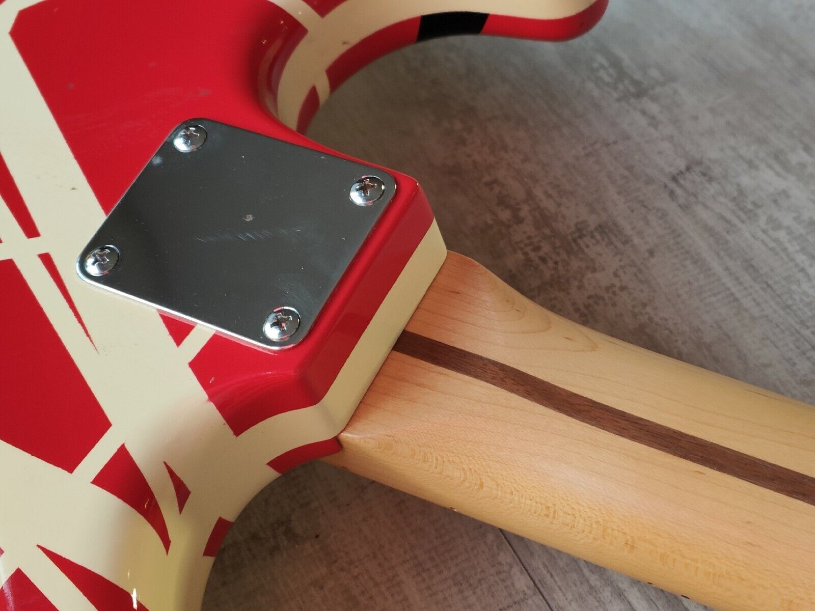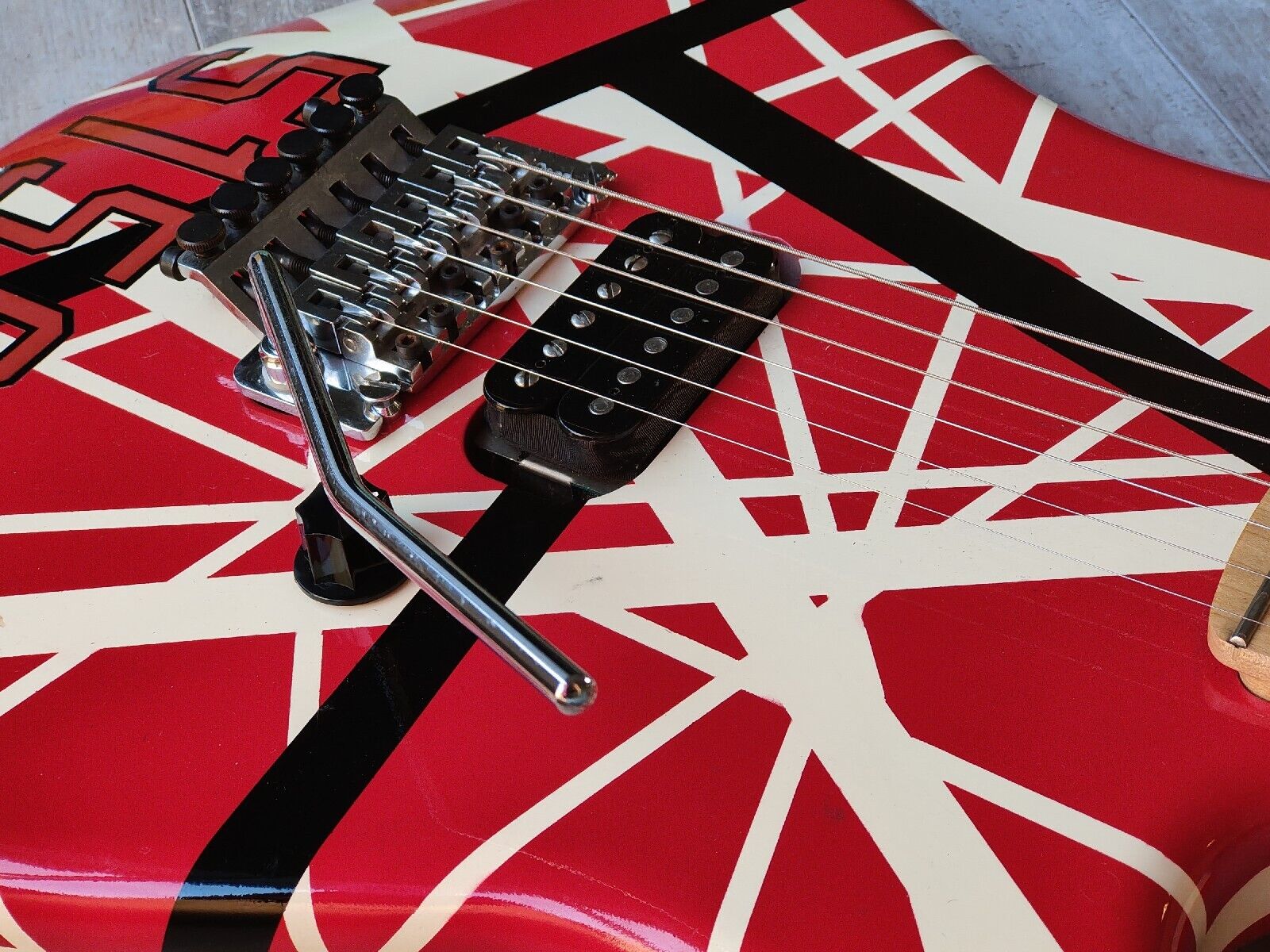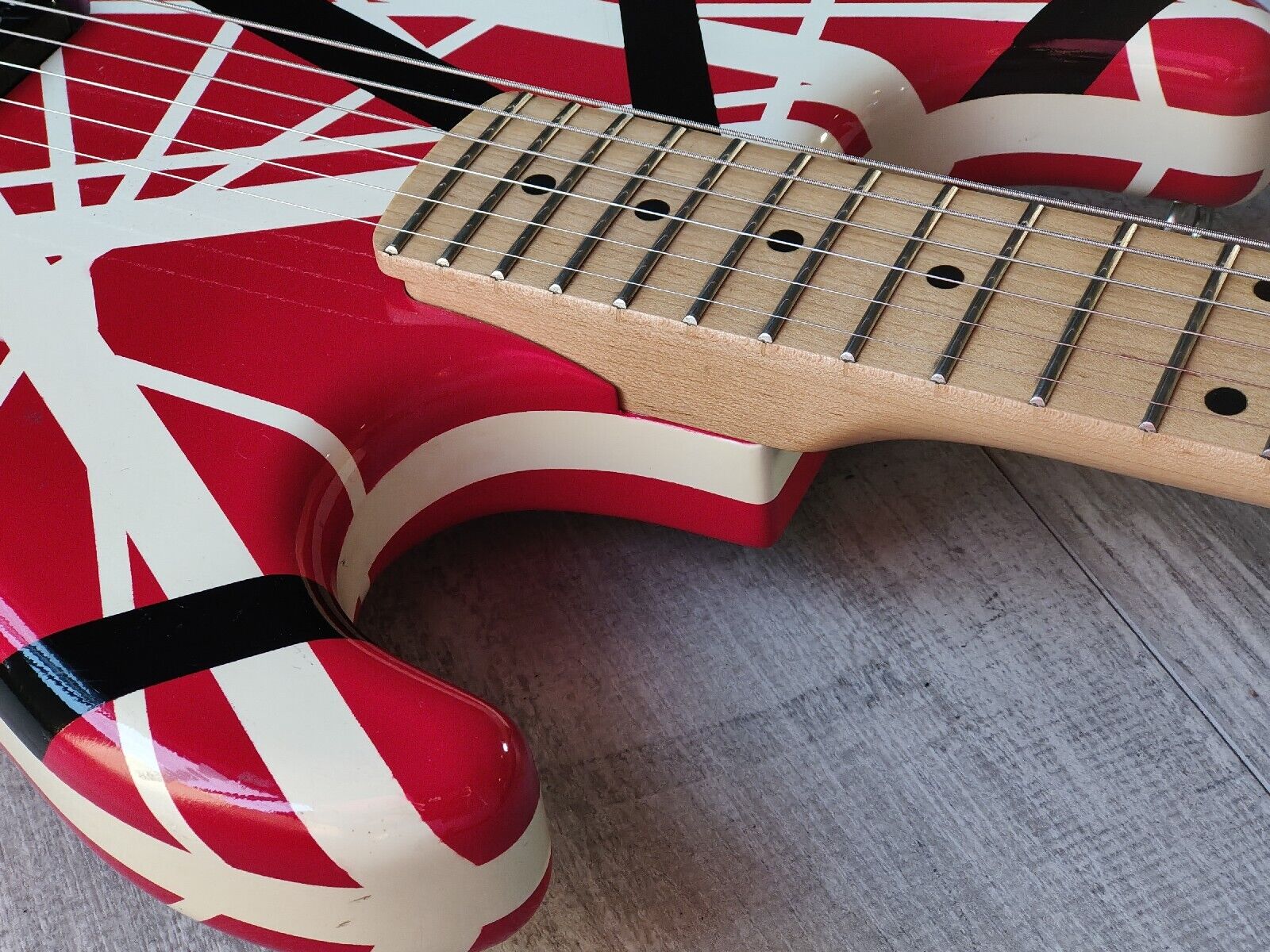 We just had this imported from Japan and it's an incredibly impressive guitar that's shrouded with mystery. No branding anywhere (other than "VH" pencilled on the neck heel), it appears to be a two-piece ash body with a bolt-on maple neck (22 frets, 648mm scale length), it weighs 4.2kg's. Loaded with a full-sized Japanese volume pot (dated to 1988), USA made Floyd Rose and a JBJ stickered Seymour Duncan humbucker, professional grade components for what feels like a professional level guitar.