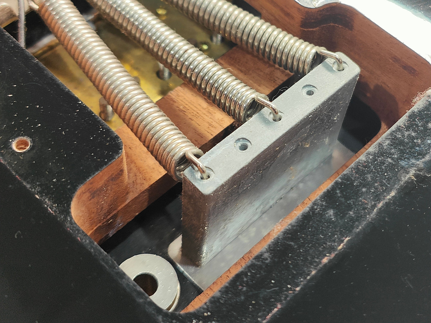 This one seems to have been professionally loaded with a Fernandes FRT-7 Floyd Rose system, either custom ordered by a store in the late 80's or modified by the factory for a customer. The FRT-7 system has a locking plate, allowing you to block the tremolo with only a few turns of an Allen key.