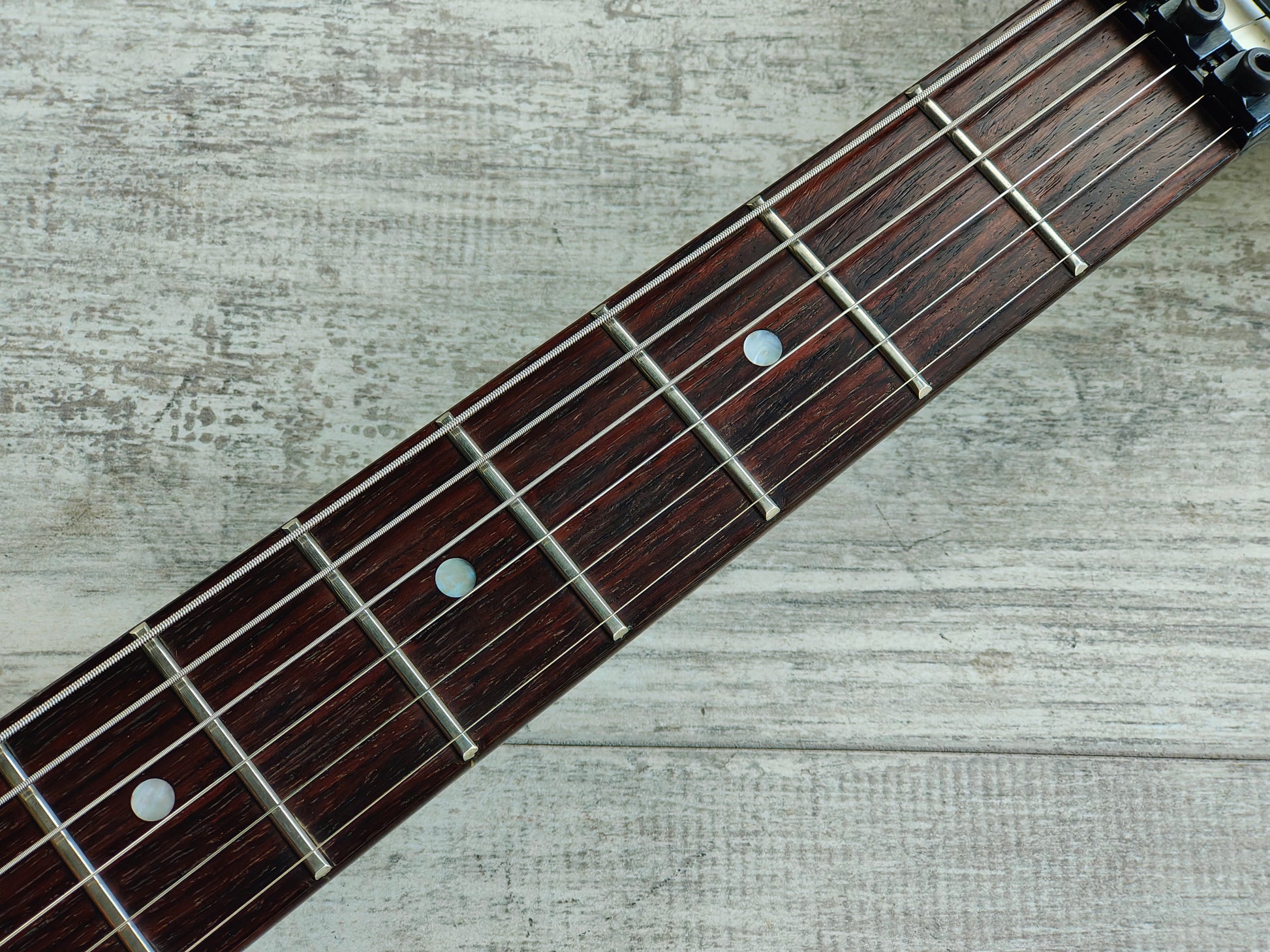 Made in Japan by Burny in 1989, the RFV-75 was aimed at replicating the '74 model Gibson Flying V. With a solid mahogany body set to a slim mahogany neck and a 22 fret rosewood fingerboard (41mm nut width, 628mm scale length), it weighs just under 3kg's. Loaded with a pair of VH-1 humbuckers controlled by two volume knobs and a master tone control along with a three-way selector.