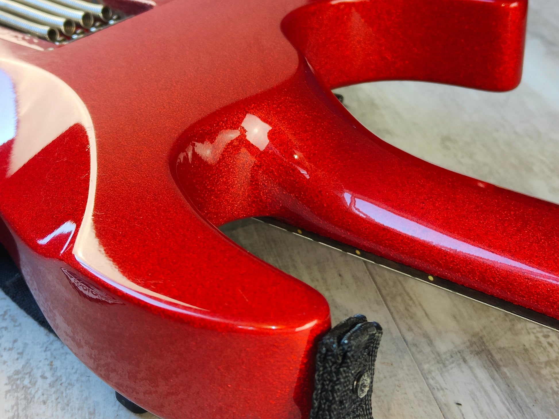 One of the highest end models available in Charvel Jackson's 1989 Japanese catalog, the Model 5A is a simple shredder's dream. Neckthrough construction wearing a bright metallic red flake finish, it features a maple neck with poplar wings and a 24 fret rosewood fingerboard (12-16" compound radius, 648mm scale length, 43mm nut width) and weighs 3.7kg's.