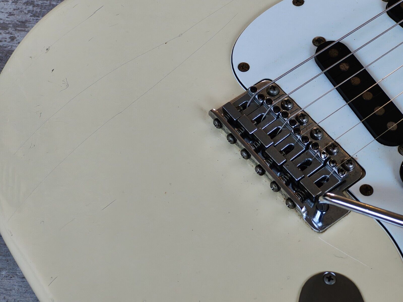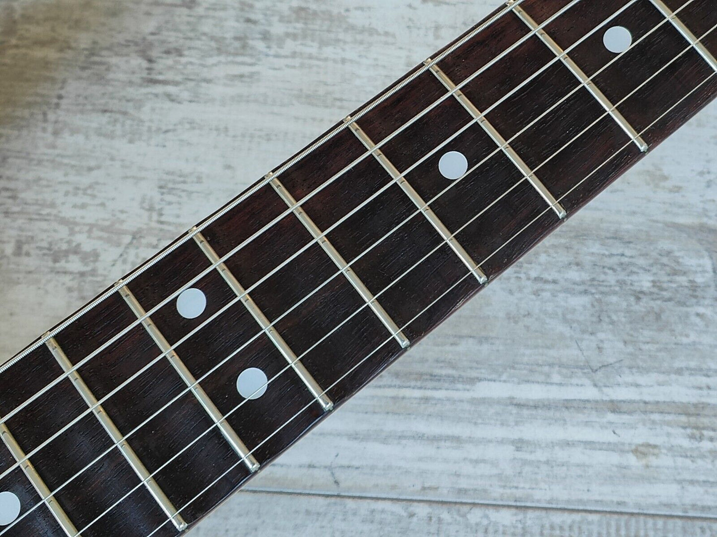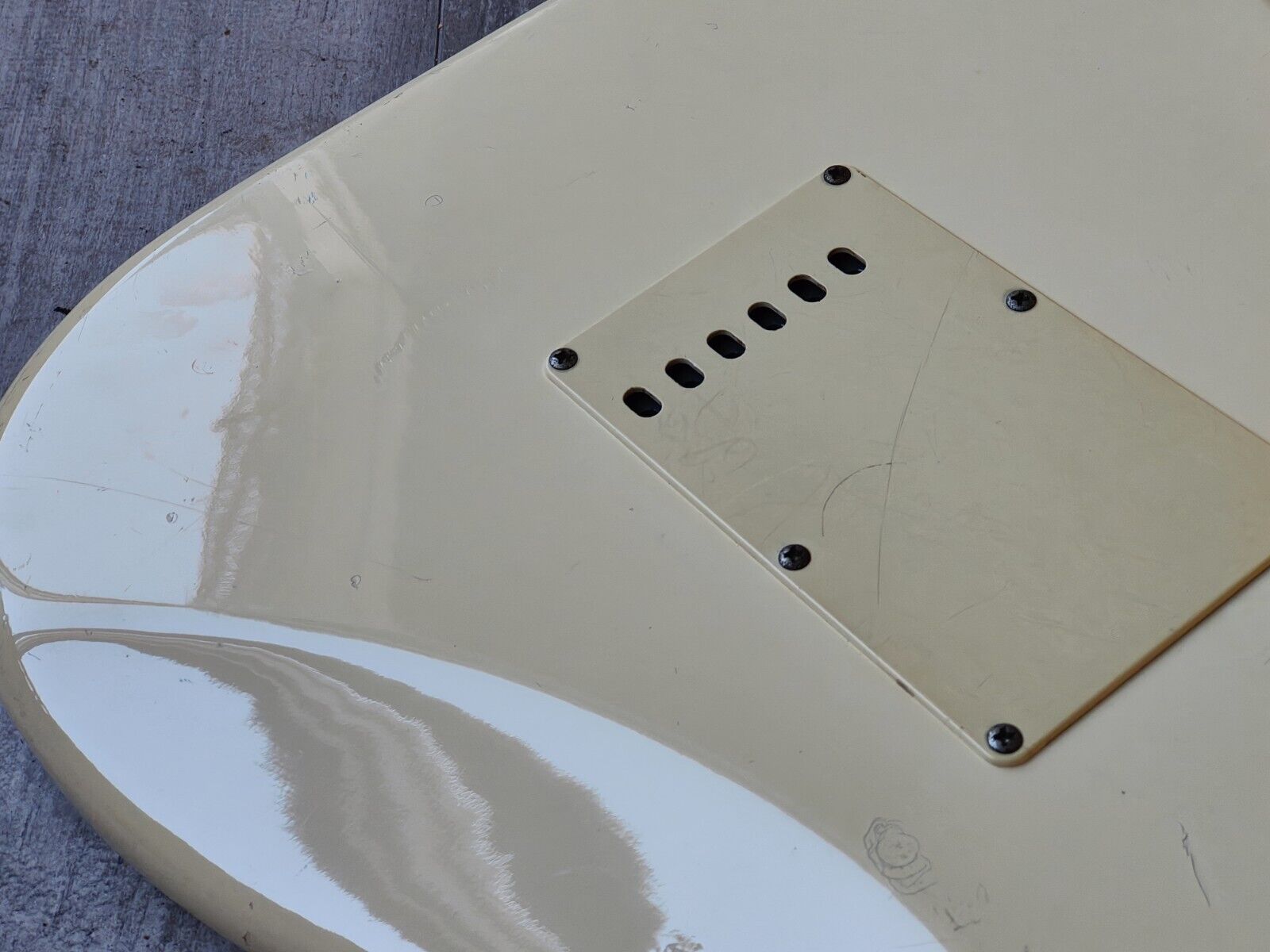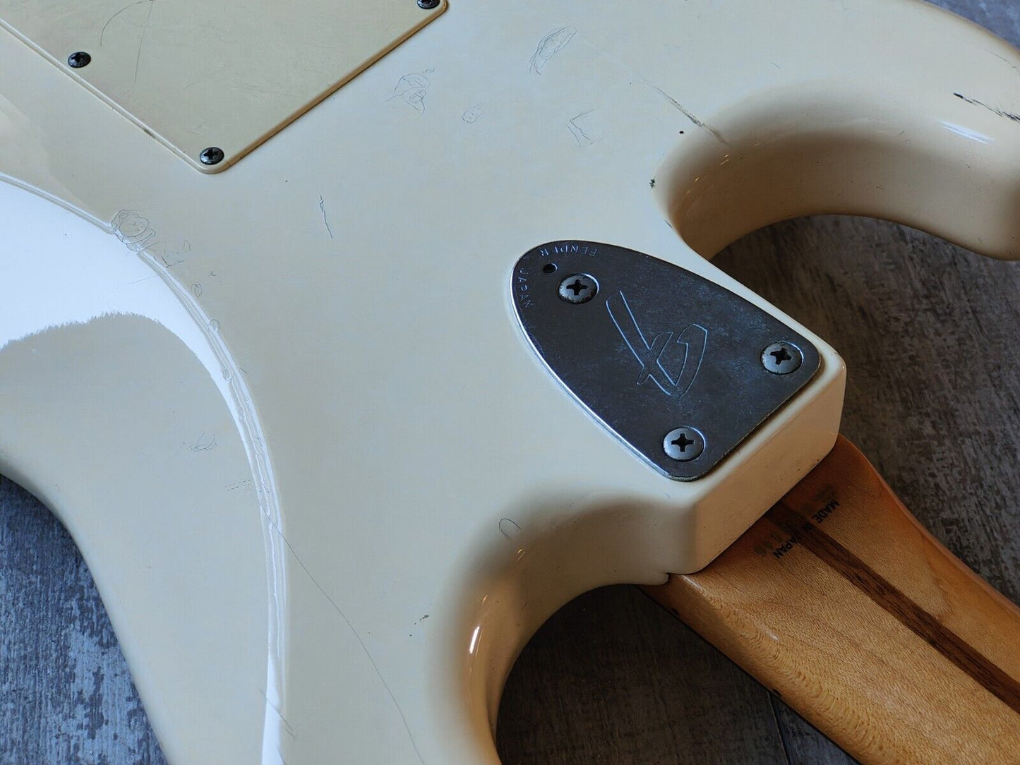 Part of the famous "E Series" of guitars made by the Fujigen factory in the mid to late 1980's, this is a rare "unofficial" Richie Blackmore model in Olympic White. This one dates to 1989 (based on the pot codes) and is built with a basswood body bolted to a maple neck and a factory "Blackmore" style scalloped rosewood fingerboard. 7.25" radius with a nice slim C profile neck, weighs 3.5kg's.