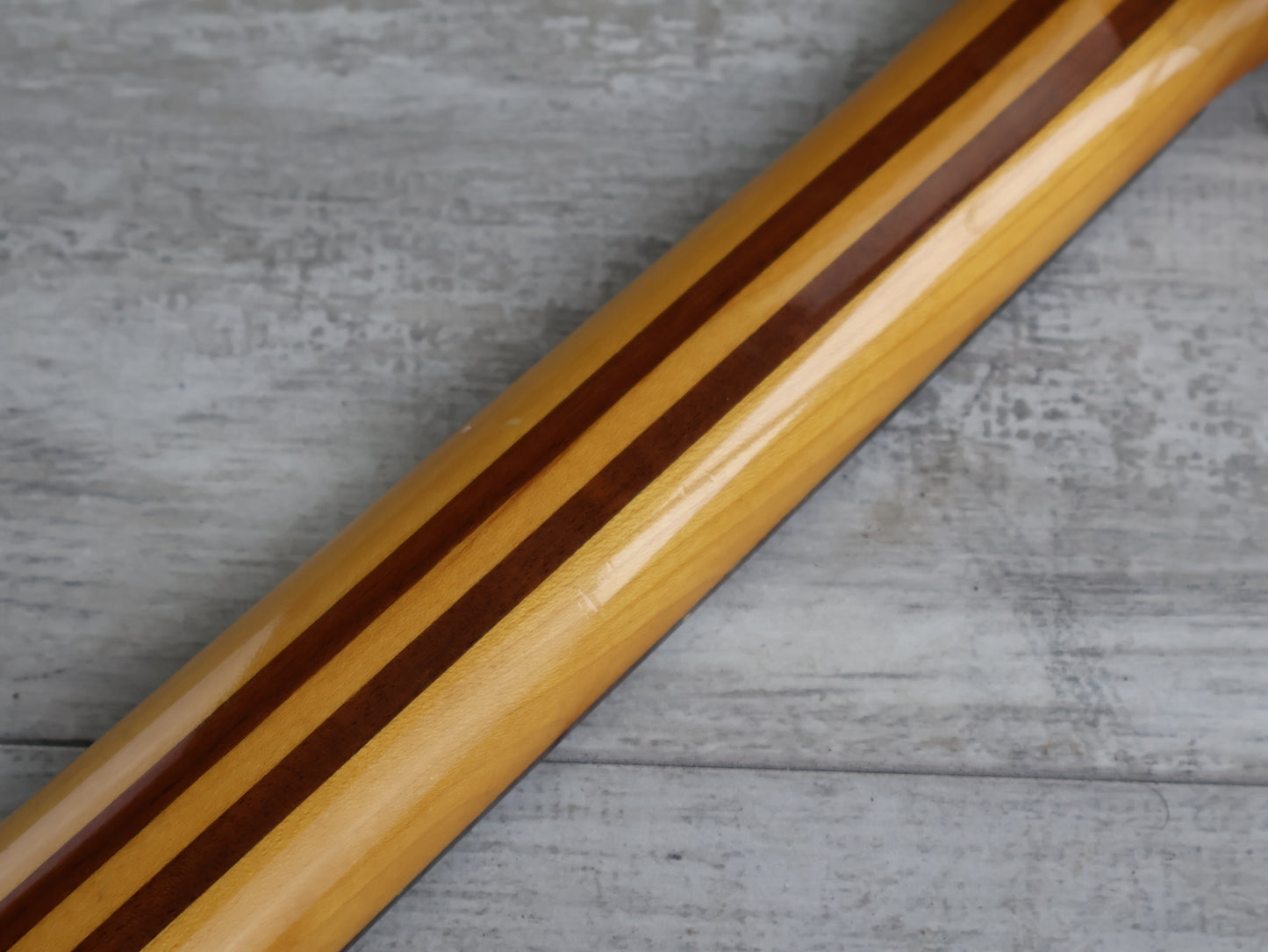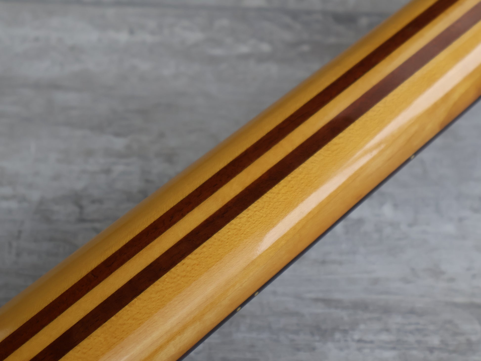 The Aria Pro II SB-800 was a Japanese made bass that was one of the few SB models continuing the neckthrough legacy after the closure of the Matsumoku factory. Favoured by bass legends including Cliff Burton, Jack Bruce and John Taylor, the SB-800 features a Sen ash body, a smooth maple/walnut transmit neck (and heel-less cutaway) and a rosewood 24 fret fingerboard (42mm brass nut with a reasonably slim neck profile, 34" scale length). Weighs just over 3.8kg's.