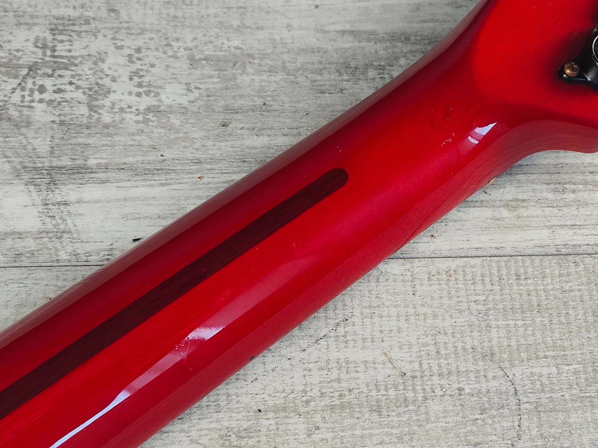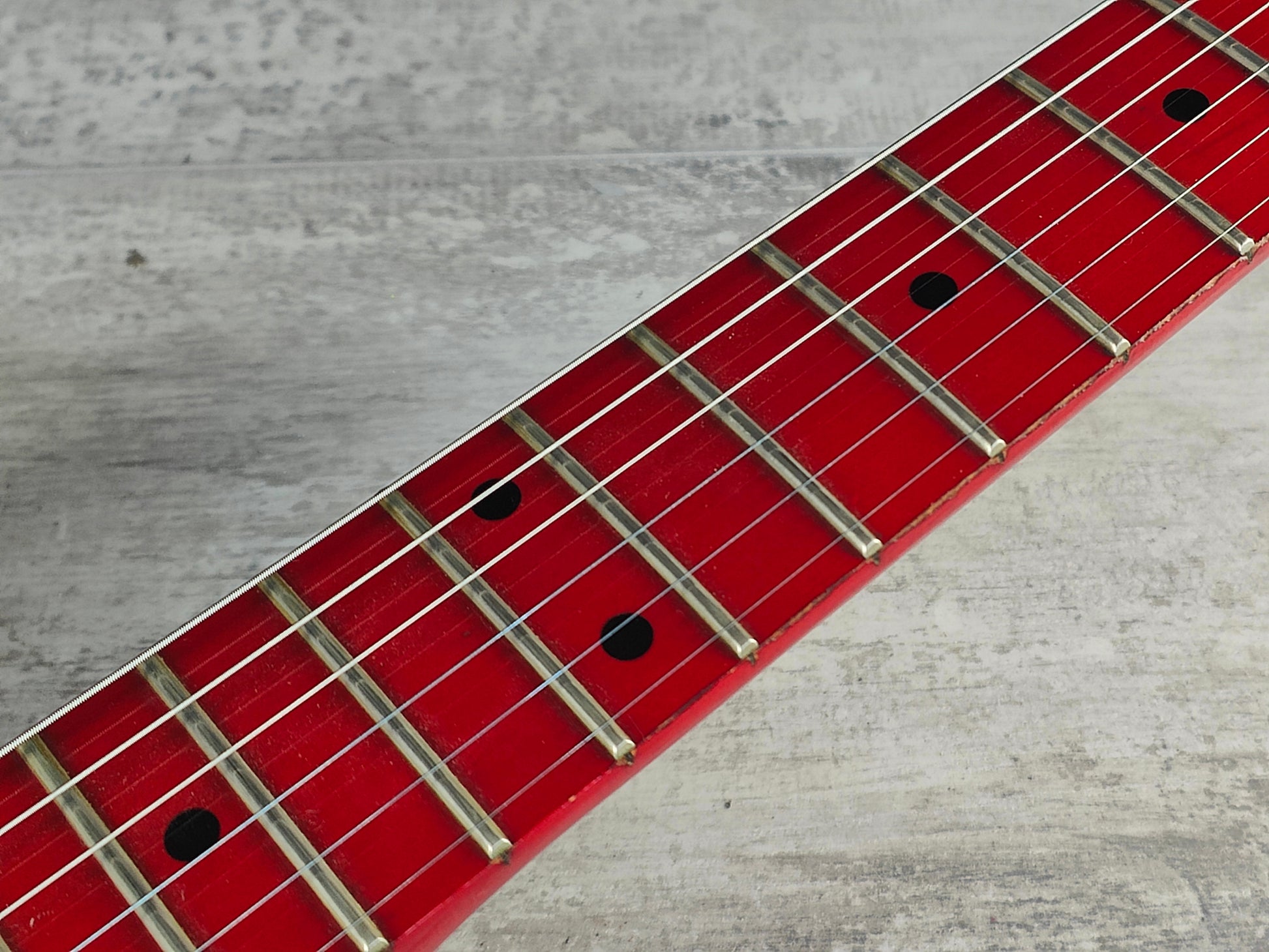 Made in Japan by Morris and sold under the Bill Lawrence name, this incredibly aesthetic Telecaster was a signature model for Kaori Okui and was built in 1990. Transparent red finish on a sen ash body with a stained maple neck/fingerboard, it weighs 3.7kg's. The neck has a '54 profile with a slight V shape , 22 frets with a 648mm scale length. This one has a Fernandes Dog Fighter humbucker in the bridge position and a generic Telecaster pickup in the neck along with some black Gotoh tuners, otherwise it appears to be original.