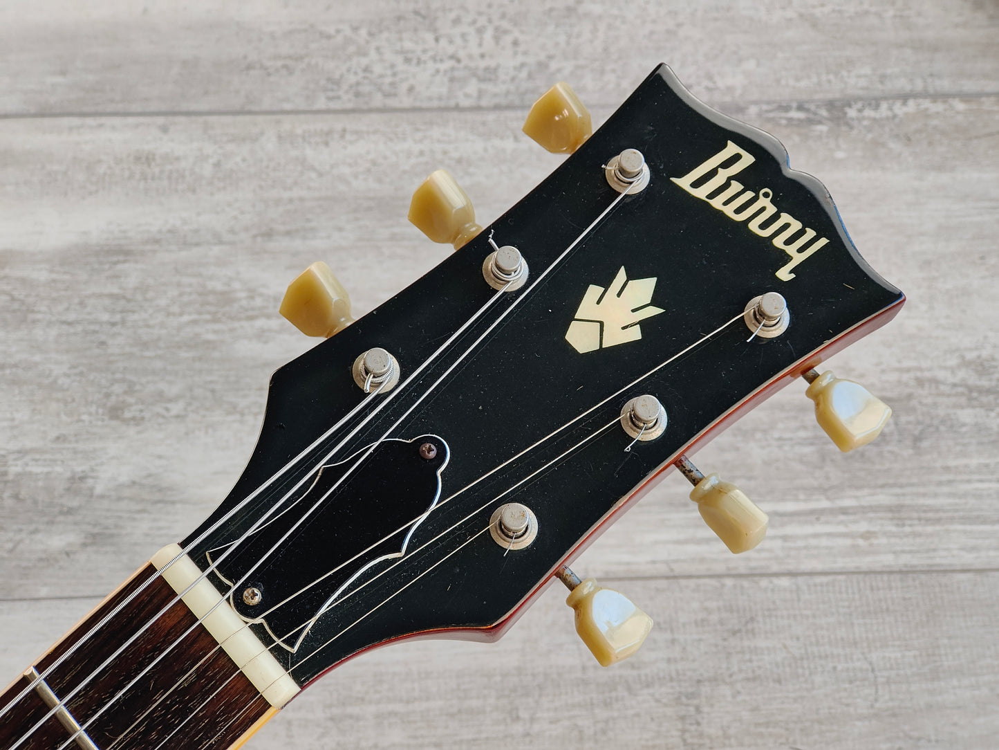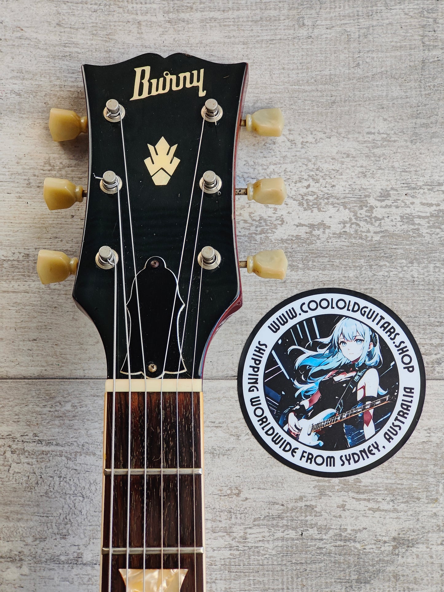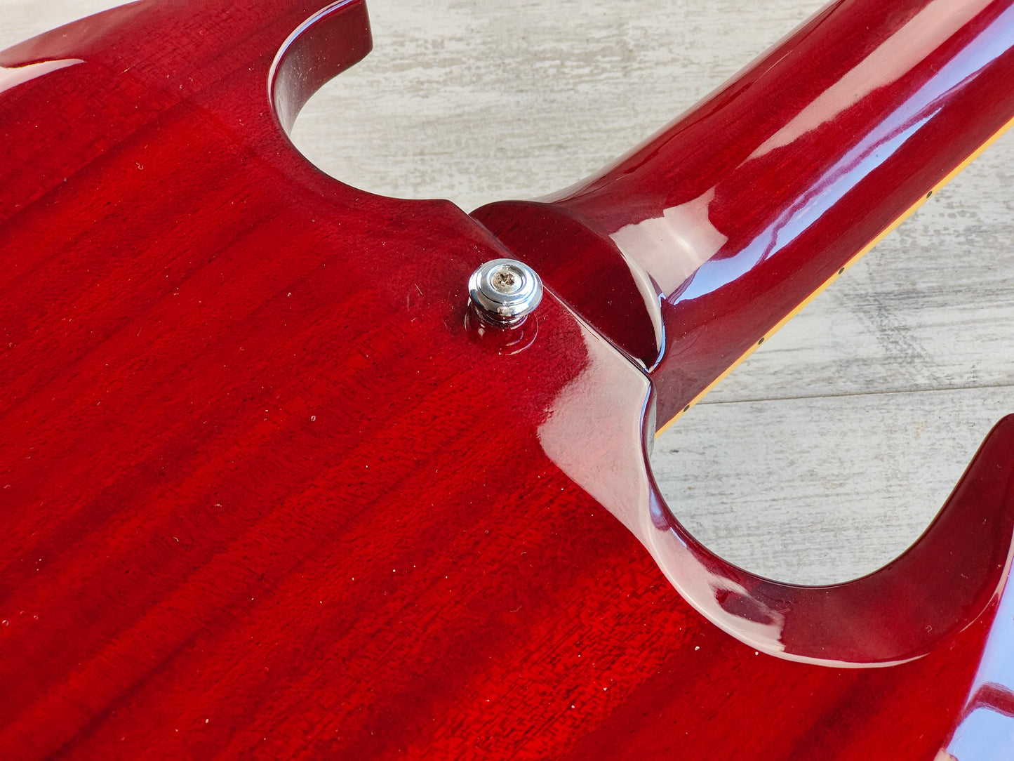 Made in Japan in 1990, the RSG-60 was Burny's version of the classic '63 model Gibson SG. Wearing a Cherry Red polyurethane finish, it features an African Mahogany bevelled body set to a comfortable medium C profile mahogany neck, 22 fret rosewood fingerboard (9.5" radius, 43mm nut width) and weighs a very nimble 2.7kg's.