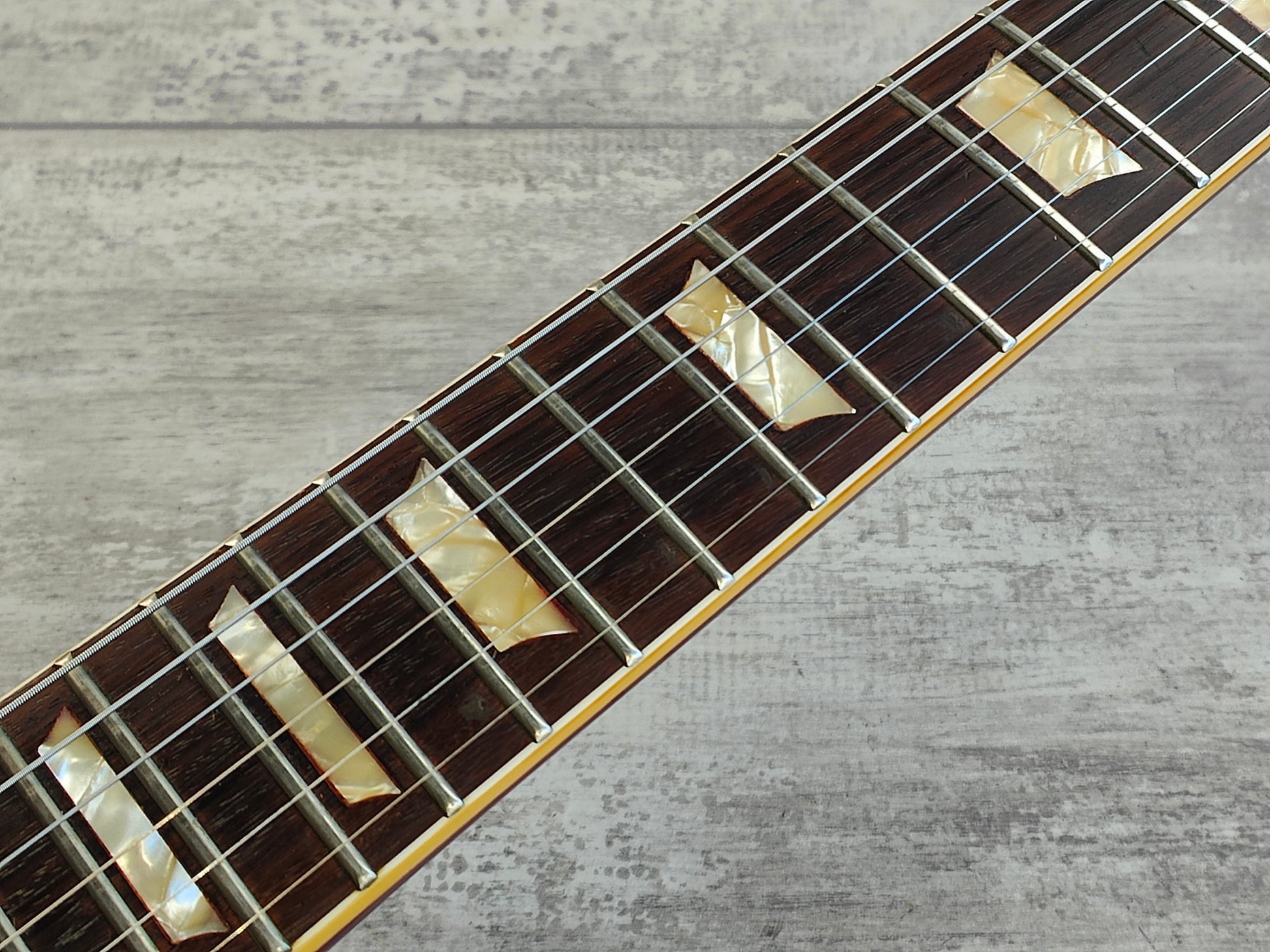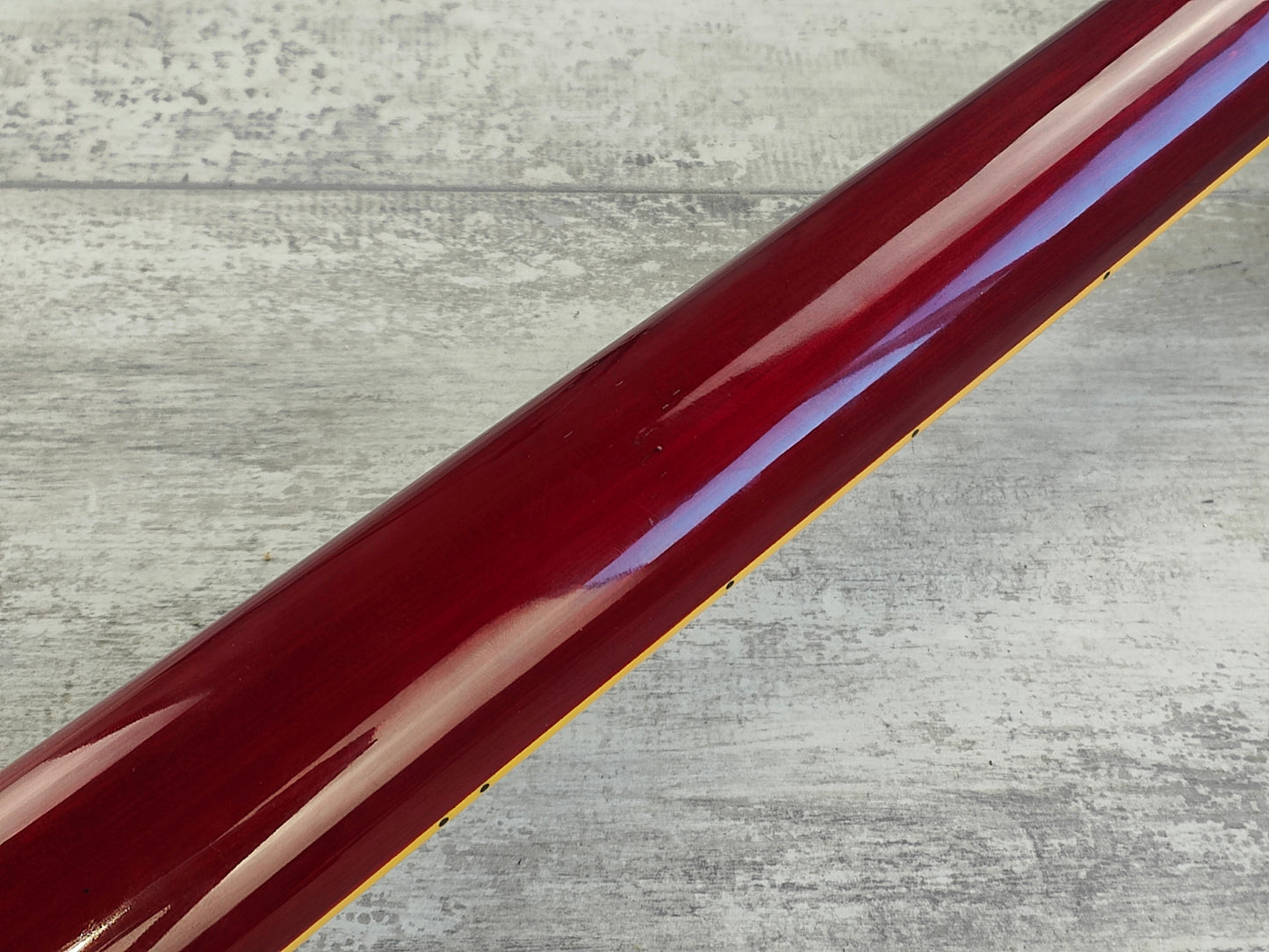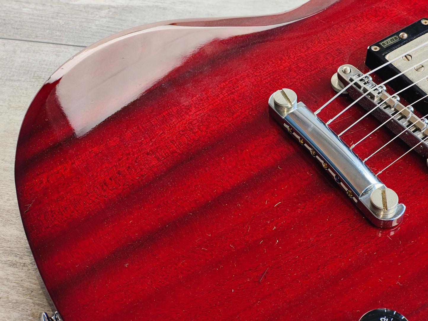 Made in Japan in 1990, the RSG-60 was Burny's version of the classic '63 model Gibson SG. Wearing a Cherry Red polyurethane finish, it features an African Mahogany bevelled body set to a comfortable medium C profile mahogany neck, 22 fret rosewood fingerboard (9.5" radius, 43mm nut width) and weighs a very nimble 2.7kg's.