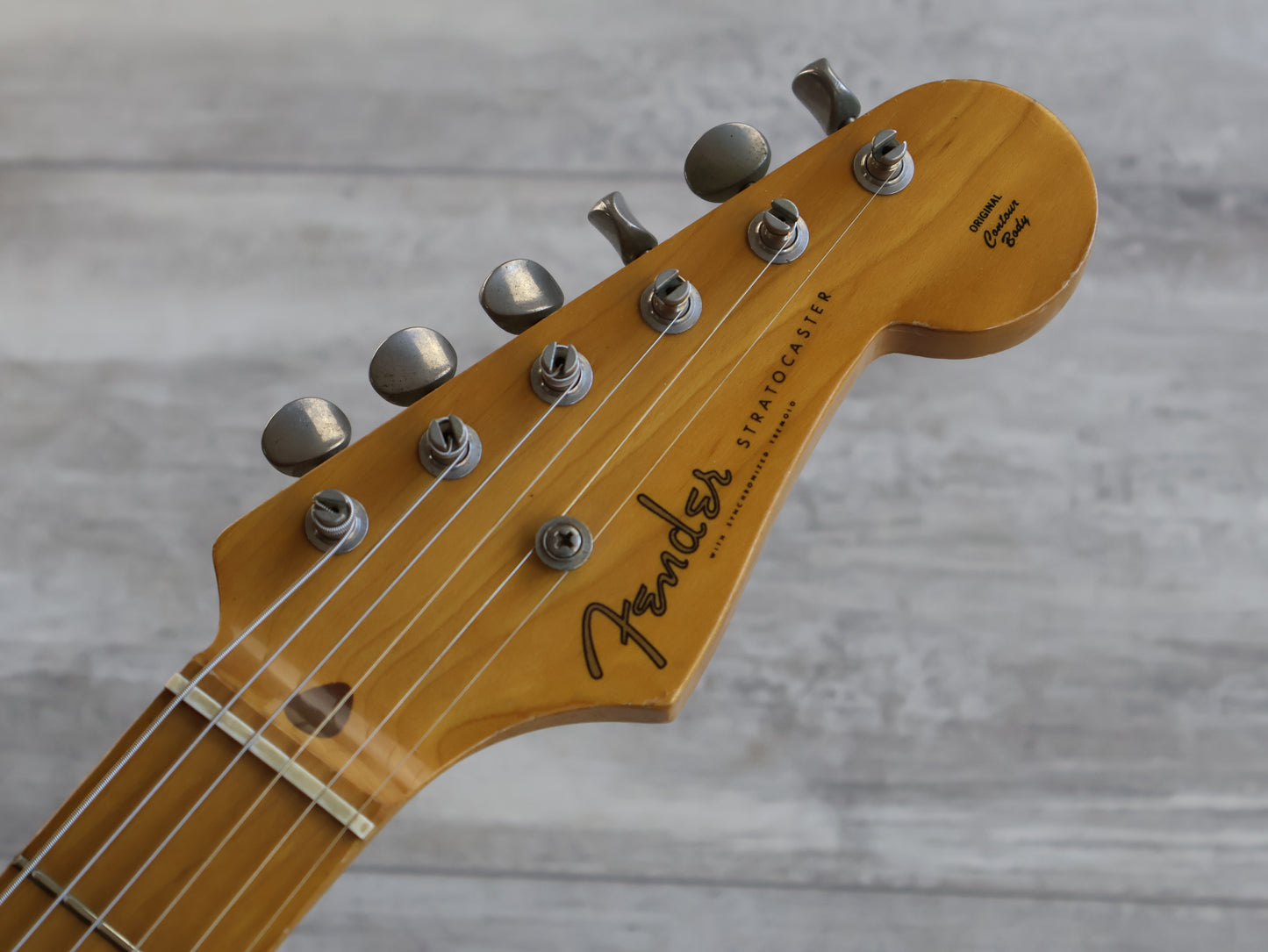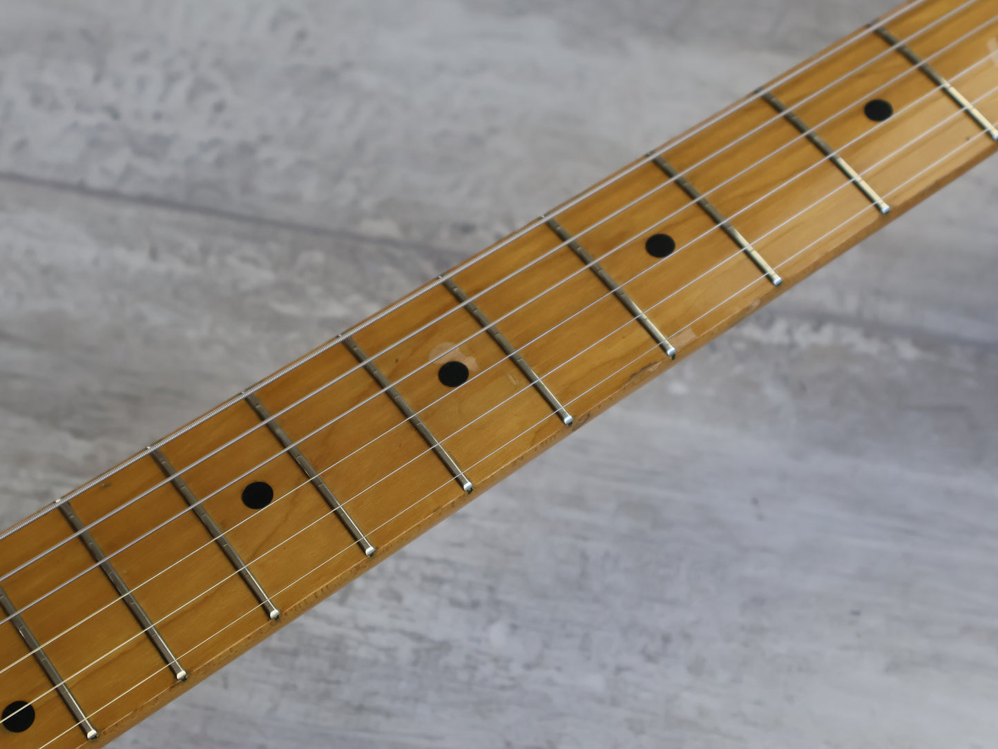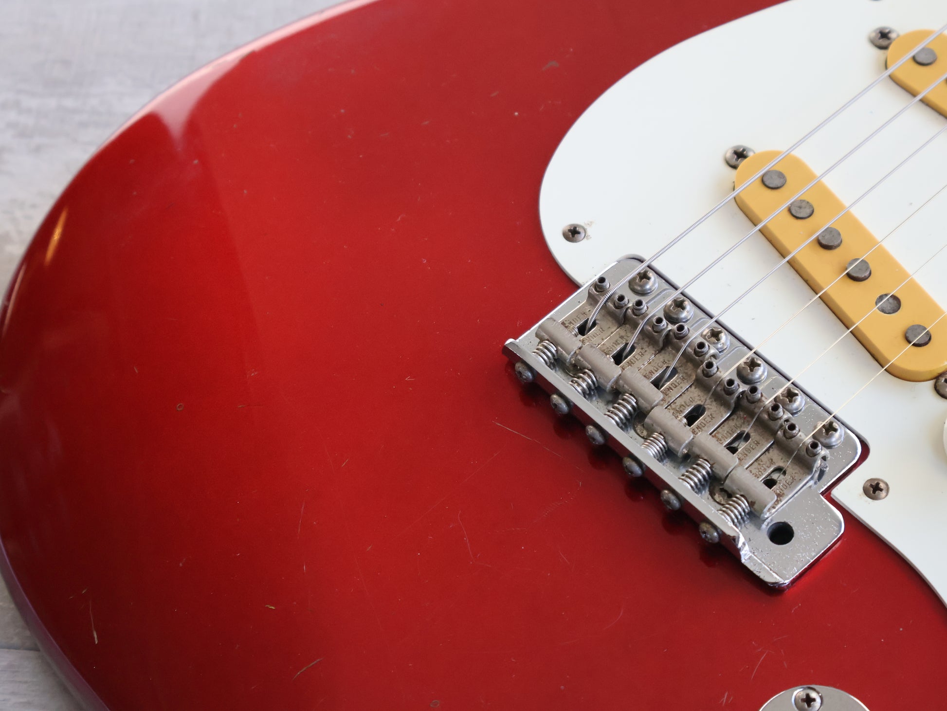 Japanese made by the Fujigen factory in 1991, the ST54-650 was a premium model from the Fender Japan catalog. Alder body with a Candy Apple Red finish, one-piece maple neck with a '54 V profile and 7.25" radius, loaded with some replacement pickups (including a HS-3 in the neck position) controlled by a 5-way selector, weighs 3.4kg's.