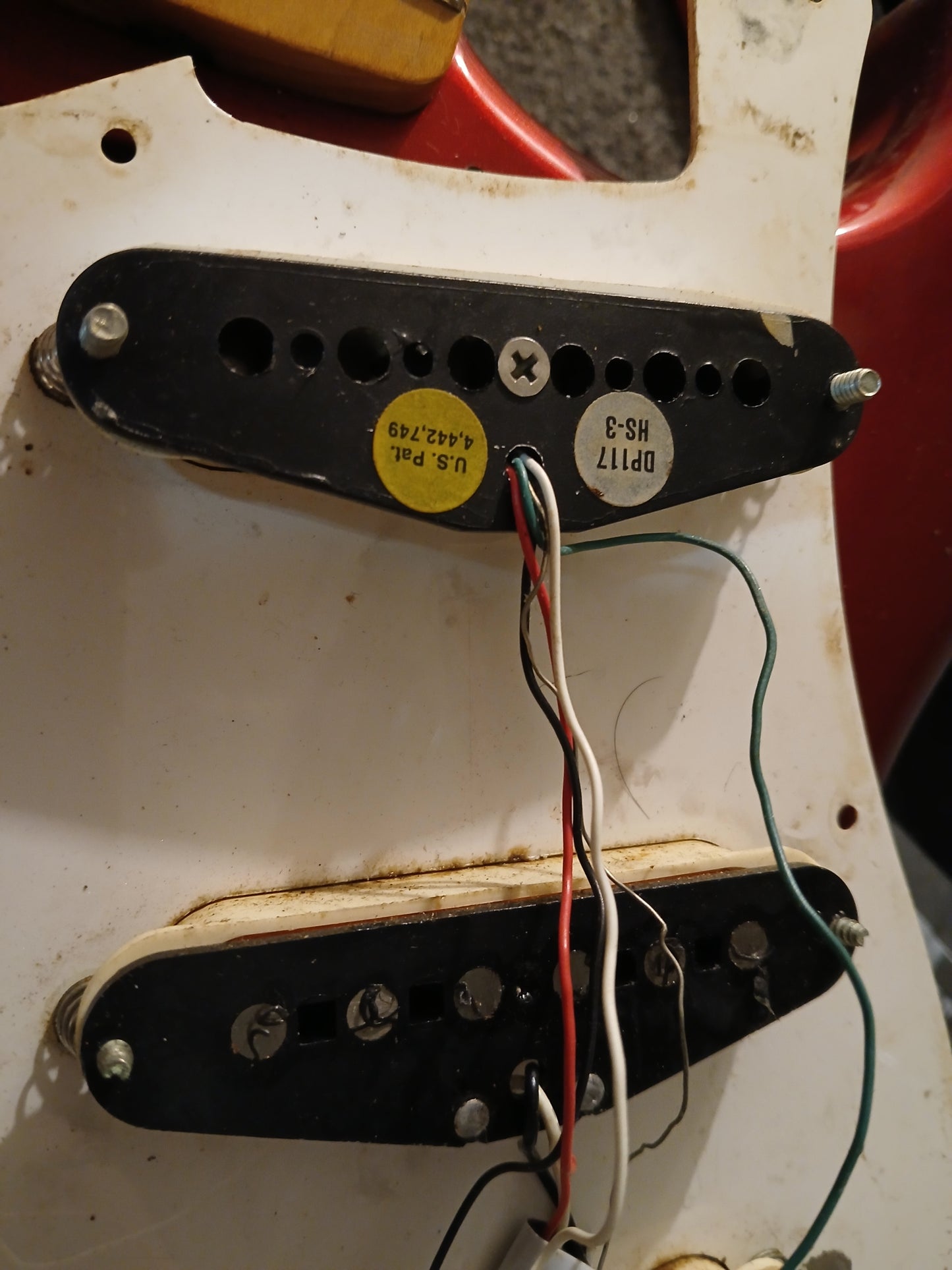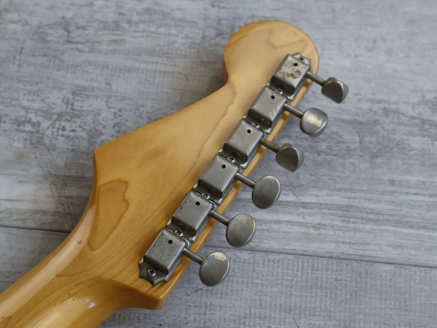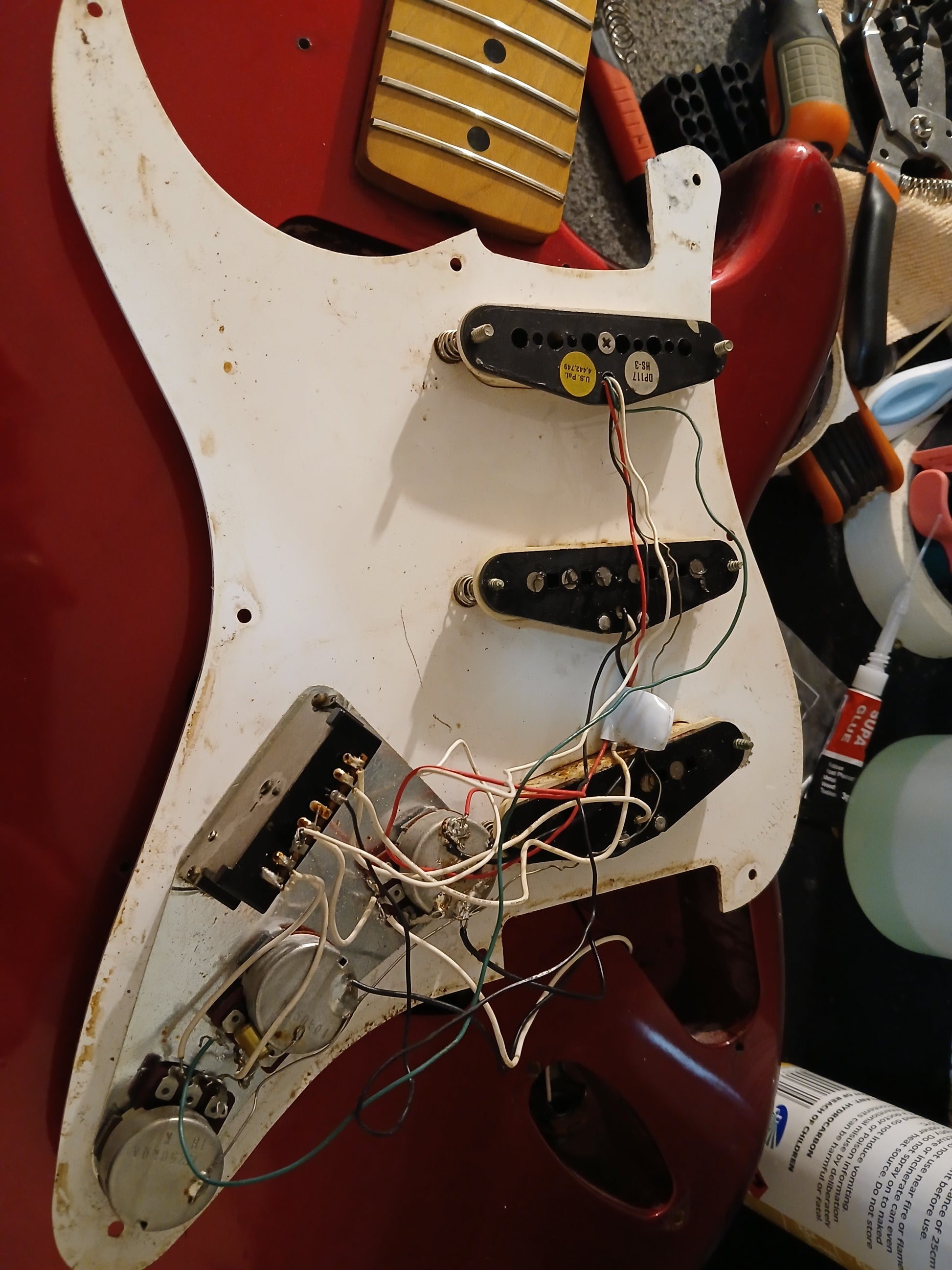 Japanese made by the Fujigen factory in 1991, the ST54-650 was a premium model from the Fender Japan catalog. Alder body with a Candy Apple Red finish, one-piece maple neck with a '54 V profile and 7.25" radius, loaded with some replacement pickups (including a HS-3 in the neck position) controlled by a 5-way selector, weighs 3.4kg's.