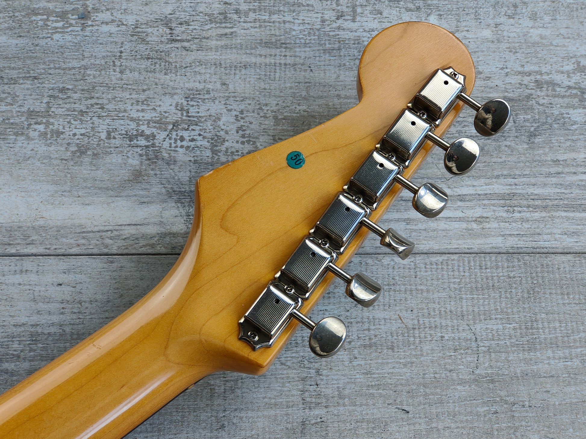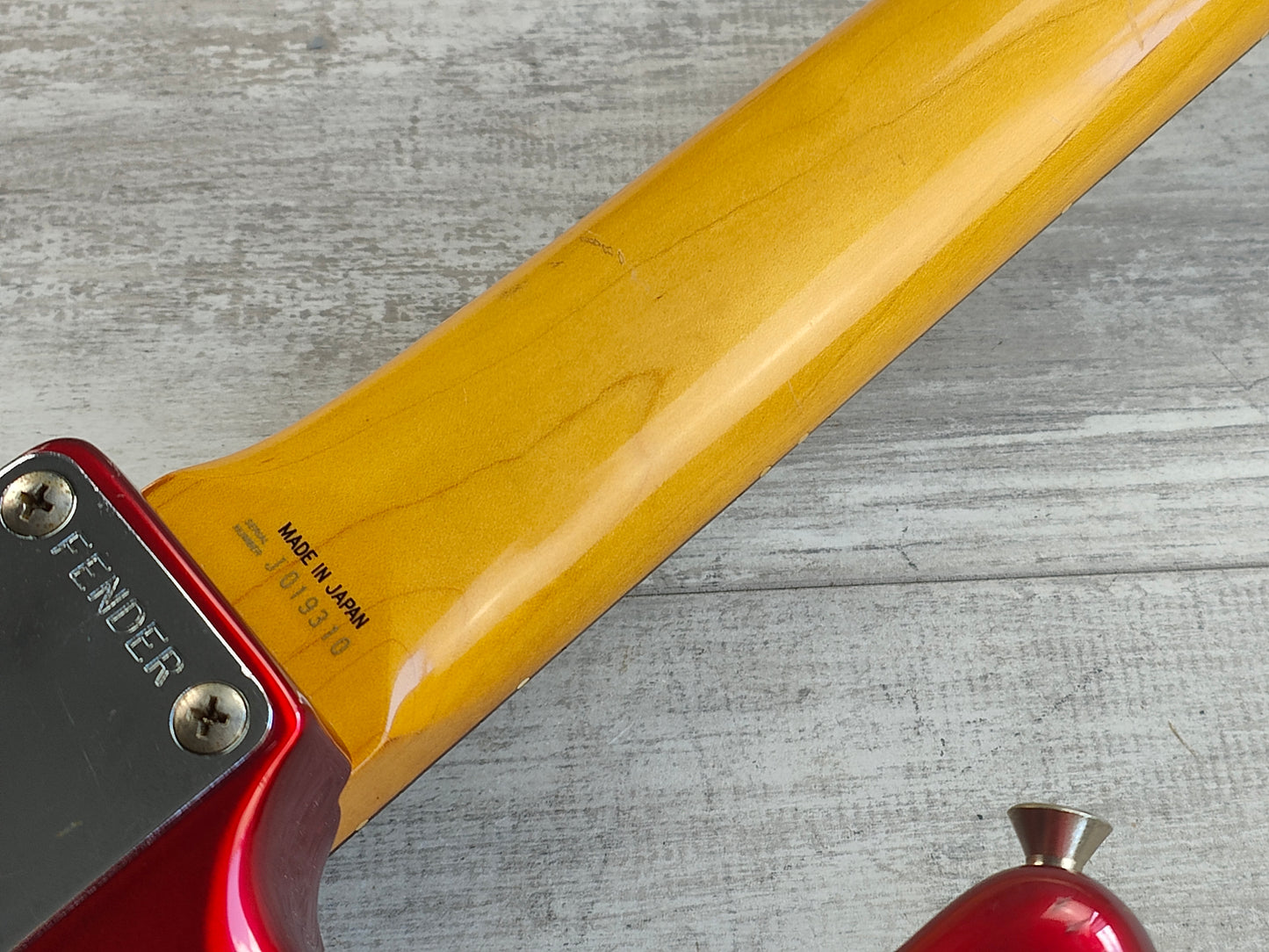 Made by the Fujigen factory in 1990, the ST62-500 was a '62 reissue model featuring a Candy Apple Red finish on a basswood body bolted to a maple neck shaped with the classic slim C neck profile (7.25" radius, 43mm nut, 648mm scale length) and weighs 3.3kg's. Looks to be all original under the pickguard with three Fender Japan ST-Vintage single coils.
