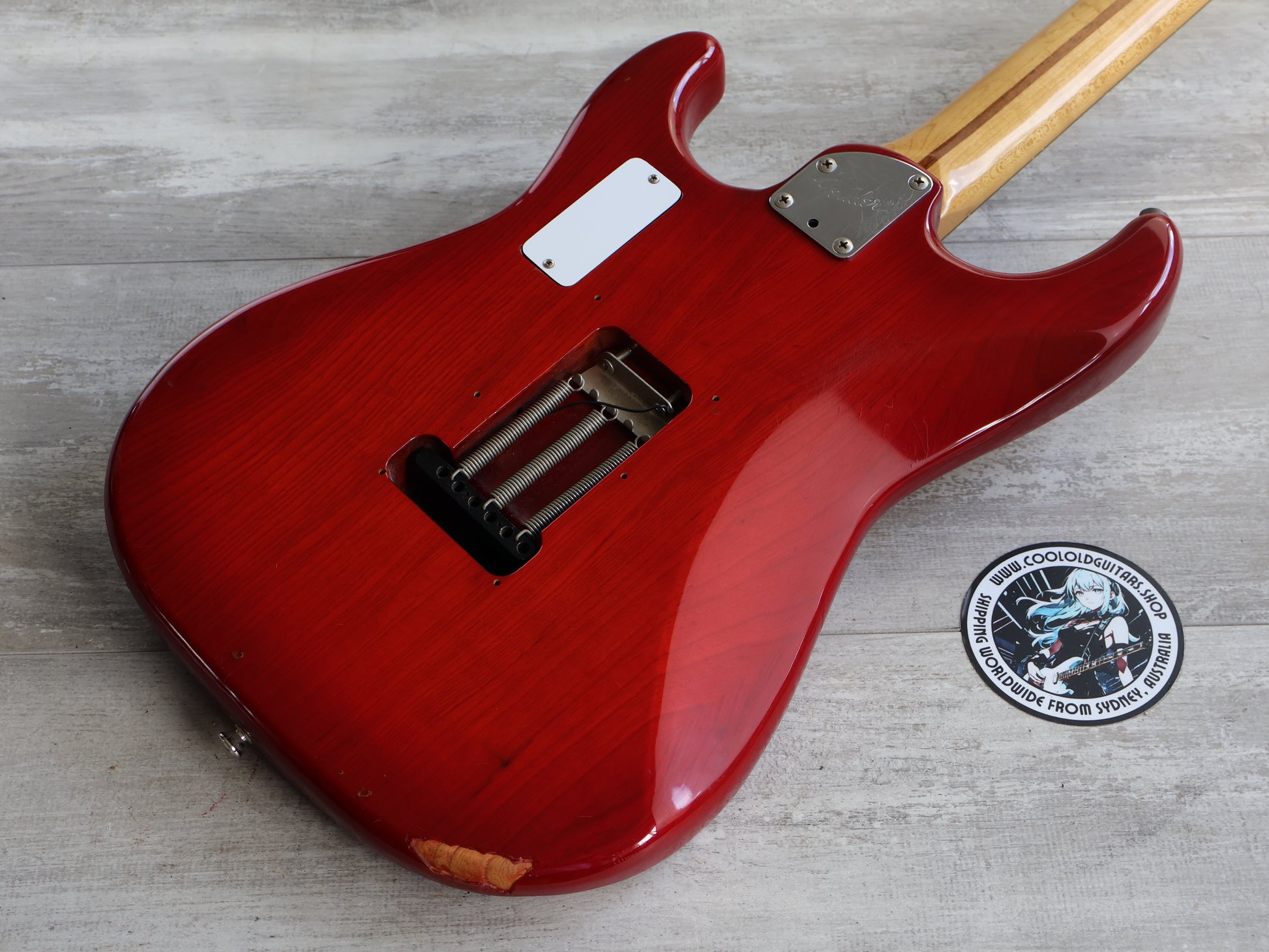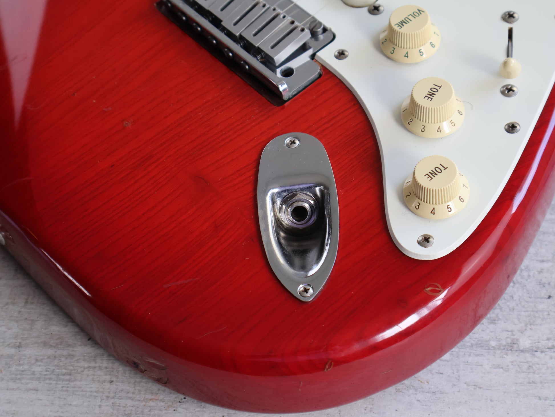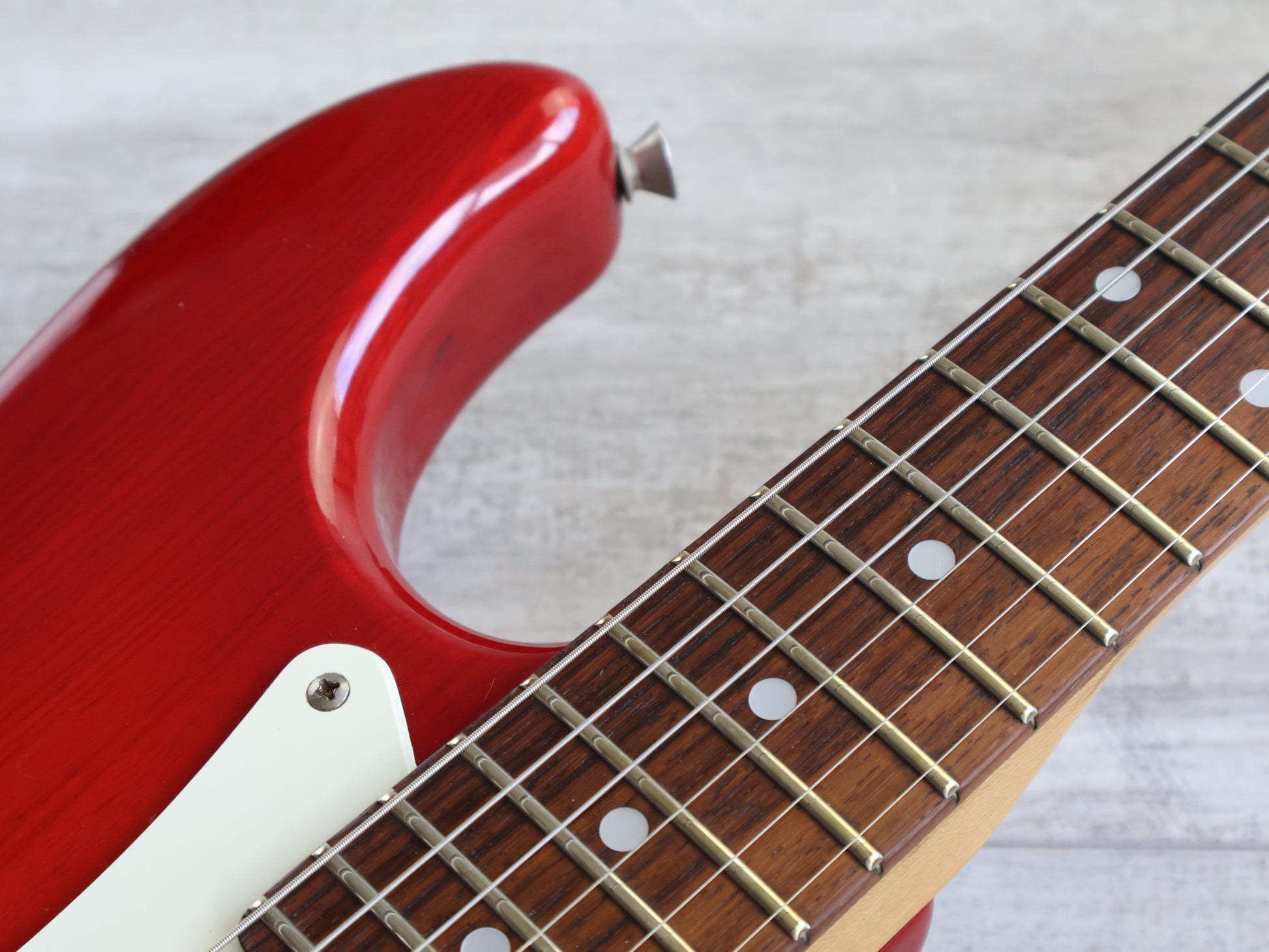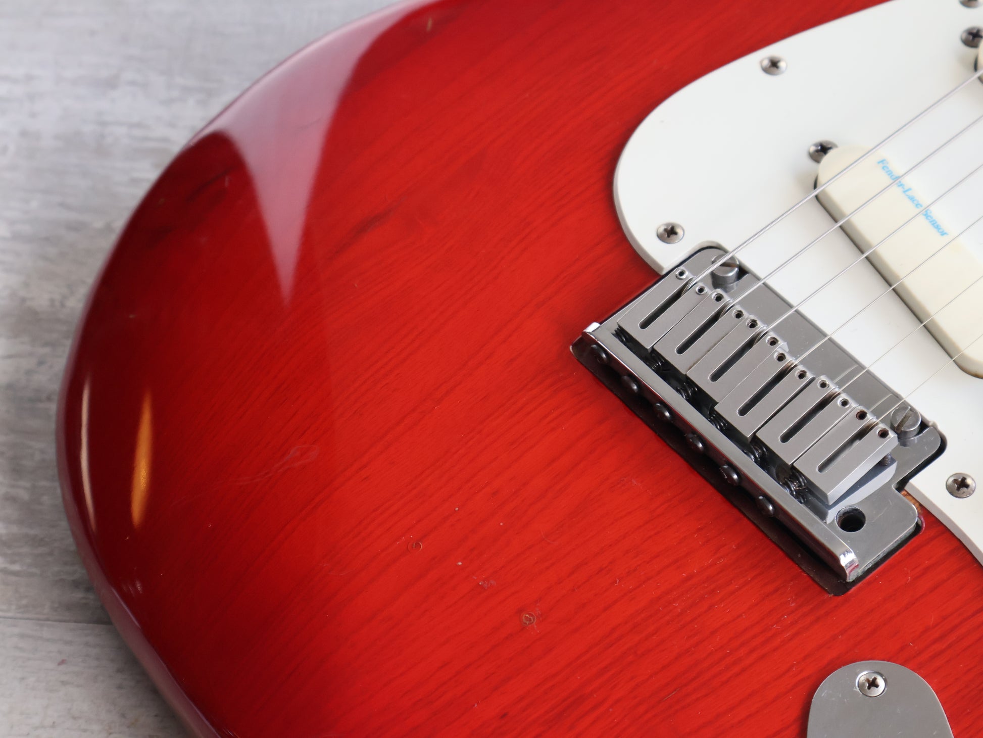 Ash body with a transparent red finish bolted to a satin feel maple neck with a 22 fret rosewood fingerboard (648mm scale length, 10" radius, 42mm nut width), it weighs 3.8kg's. Factory loaded with three Lace Sensor single coils and the famous "Clapton" mid boost circuit controlled by a 5-way selector and a "American Standard" bridge system, it's a very premium guitar in terms of both feel and tone.