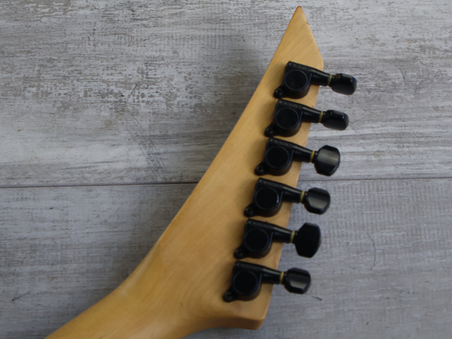 Made in Japan by Fernandes in 1990, the TEJ is an ultra-modern variation on the Fender Telecaster design. Basswood body bolted to a painted maple neck with a 22 fret rosewood fingerboard (13.75" radius, 648mm scale length, 43mm nut width), it weighs 3.5kg's.