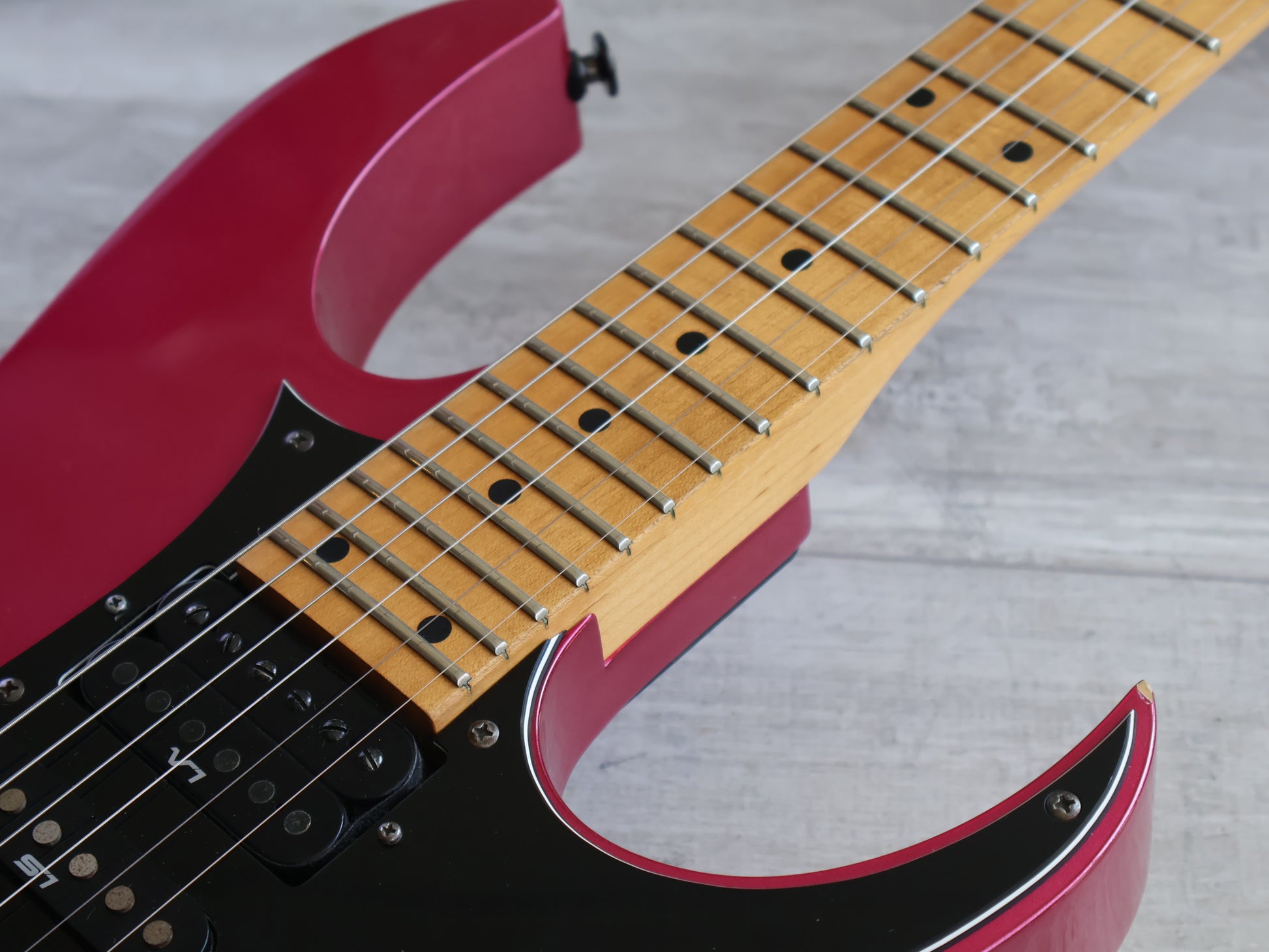 Japanese made in 1990, this is one of the early model RG-550's from Ibanez and wears the rare and highly sought after Coral Mist Metallic finish that was only used for one year. Basswood body with a slim maple neck and a 24 fret maple fingerboard with dot inlays, weighs 3.5kg's. This one has the original Ibanez V1/S1/V2 pickups, the original Floyd Rose Edge system and original Gotoh tuners.