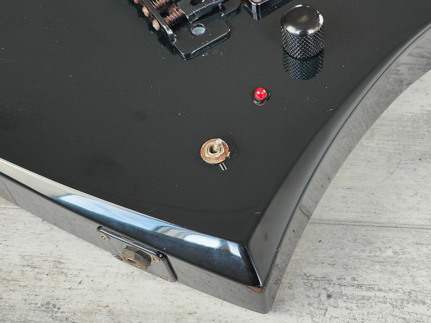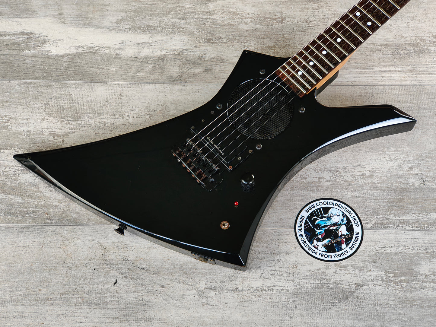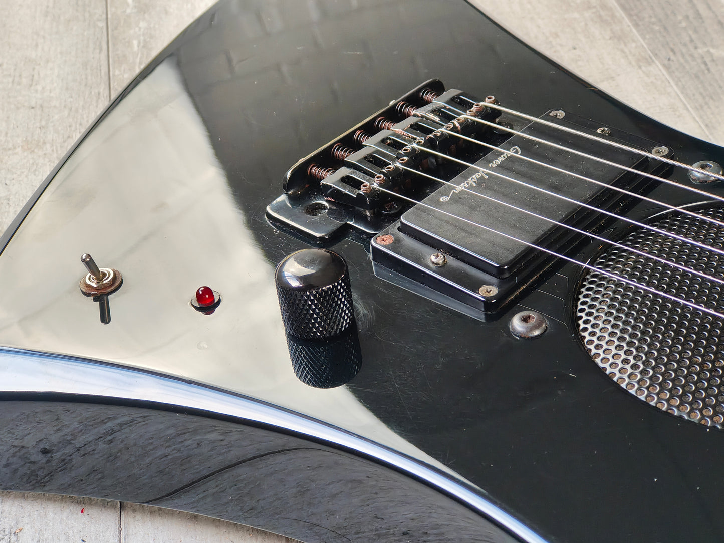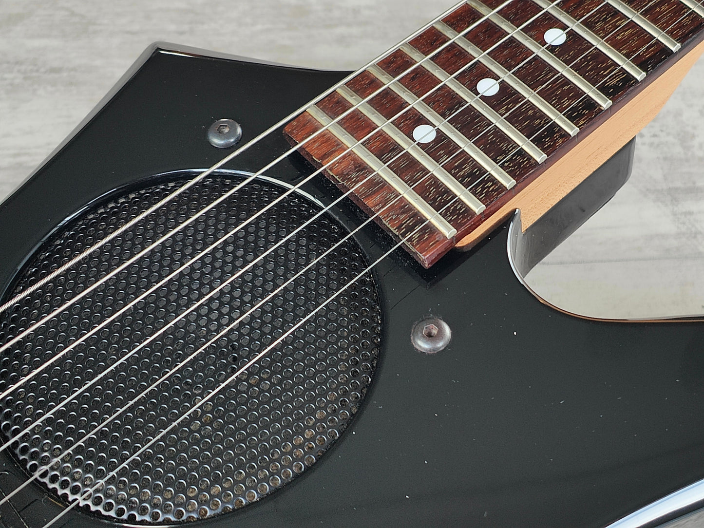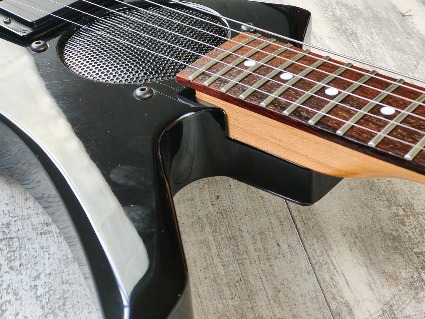 Made in Japan by Jackson in the 1990's, this is a very rare short-scale Kelly model with a built in speaker/amplifier for all your mobile metal fantasies. Seemingly one of only 300 made, it features a 610mm scale rosewood fingerboard with 22 frets, slim maple neck profile and a compact Kelly shaped body (seemingly poplar).