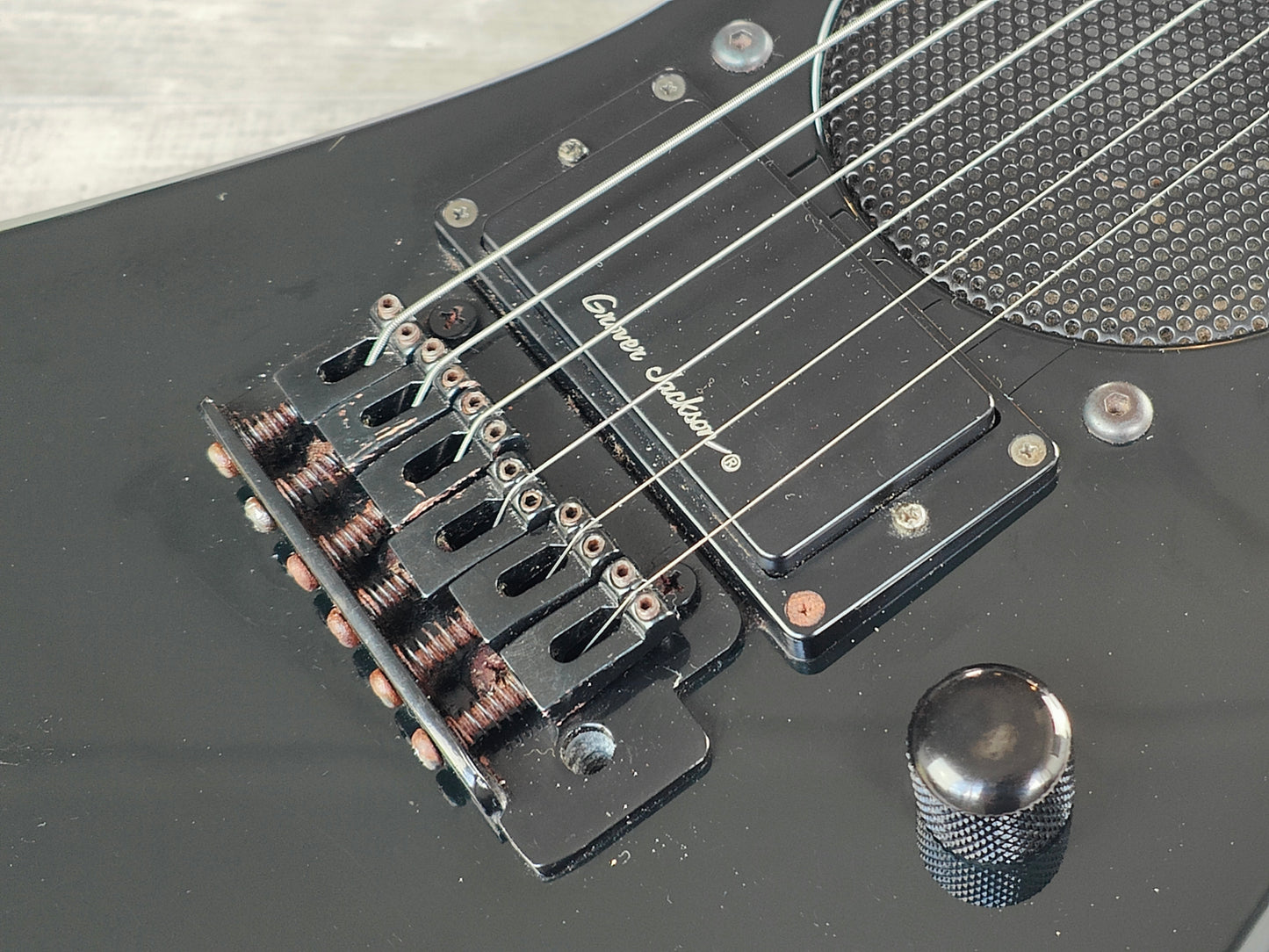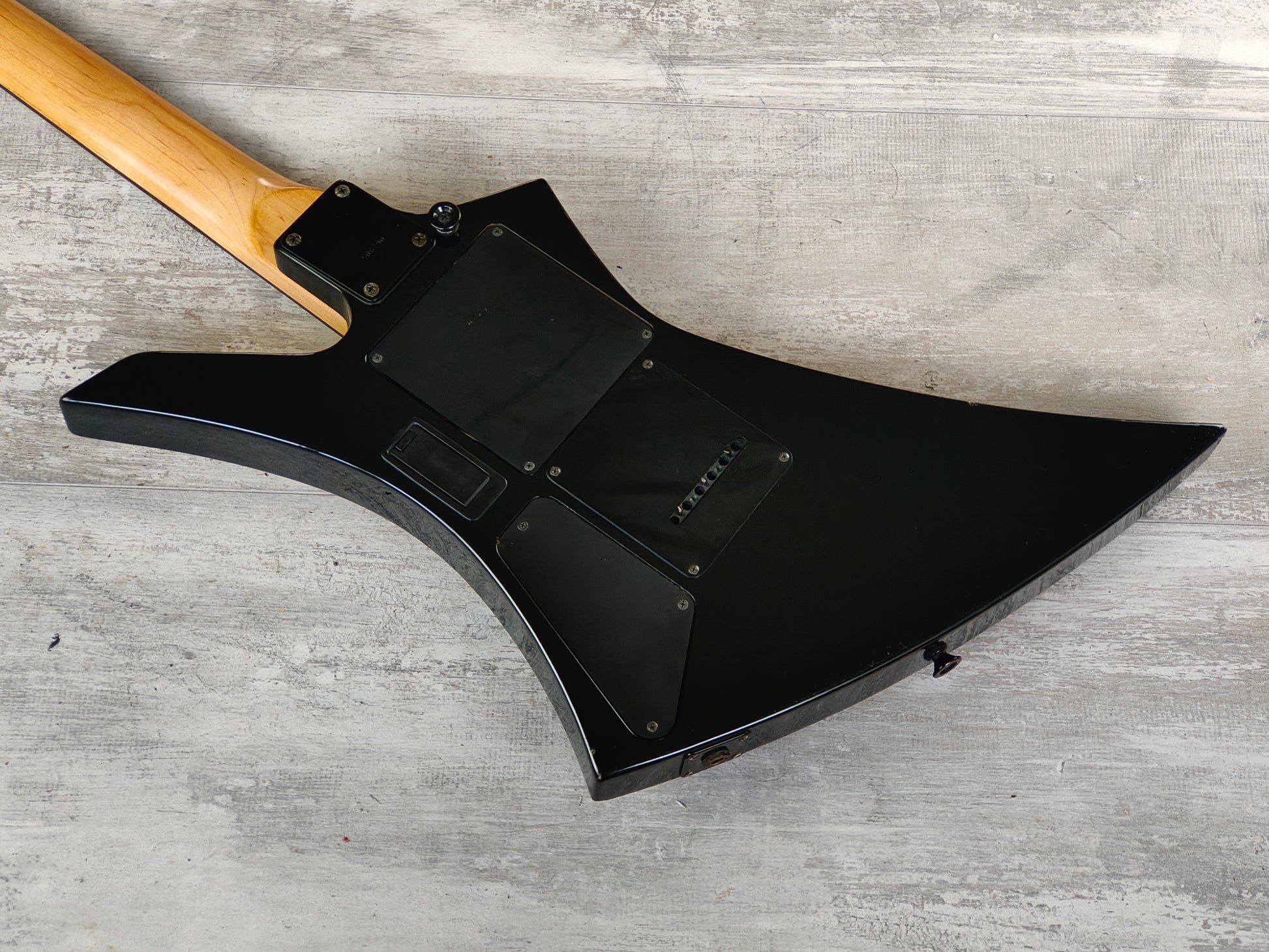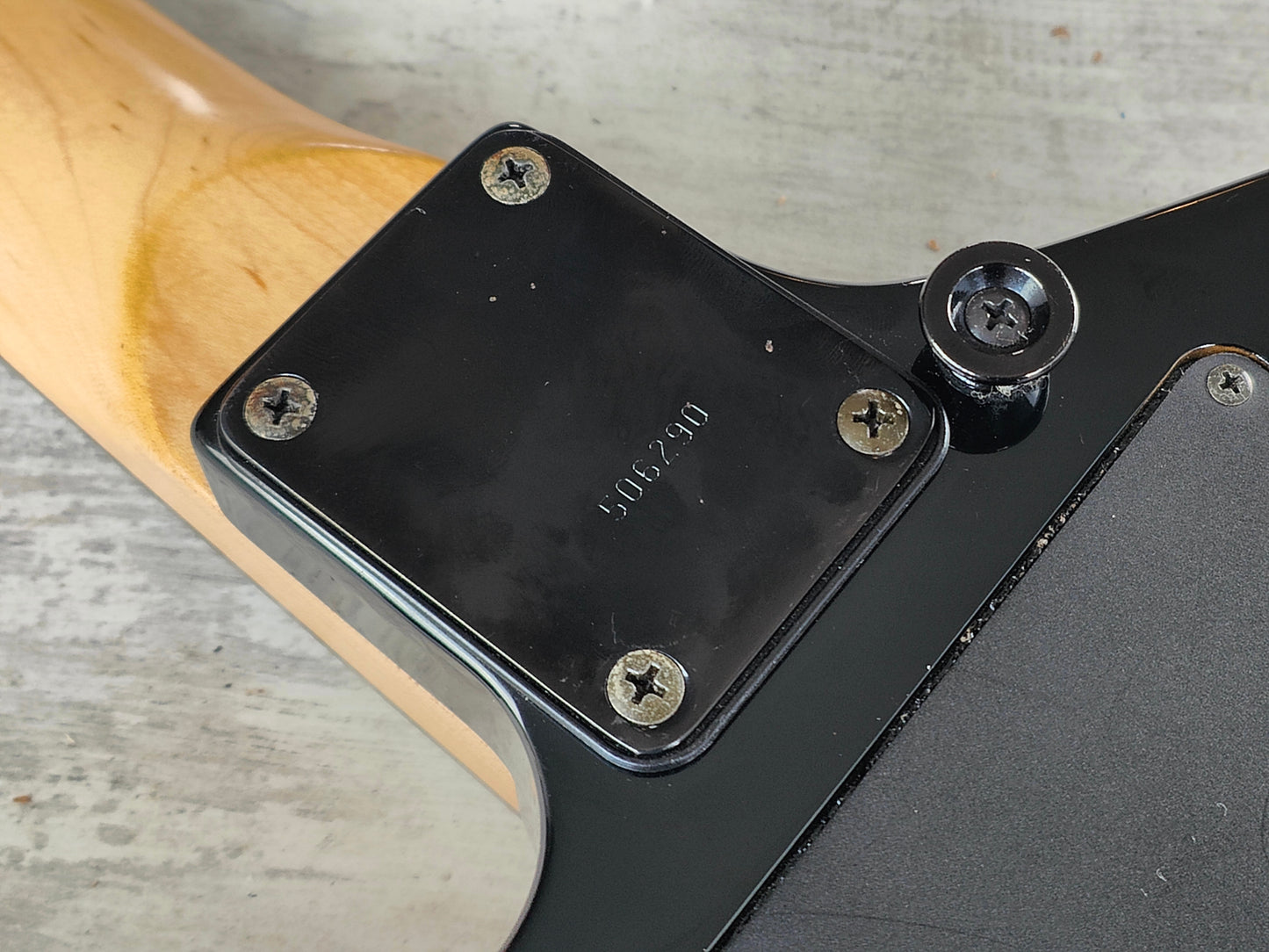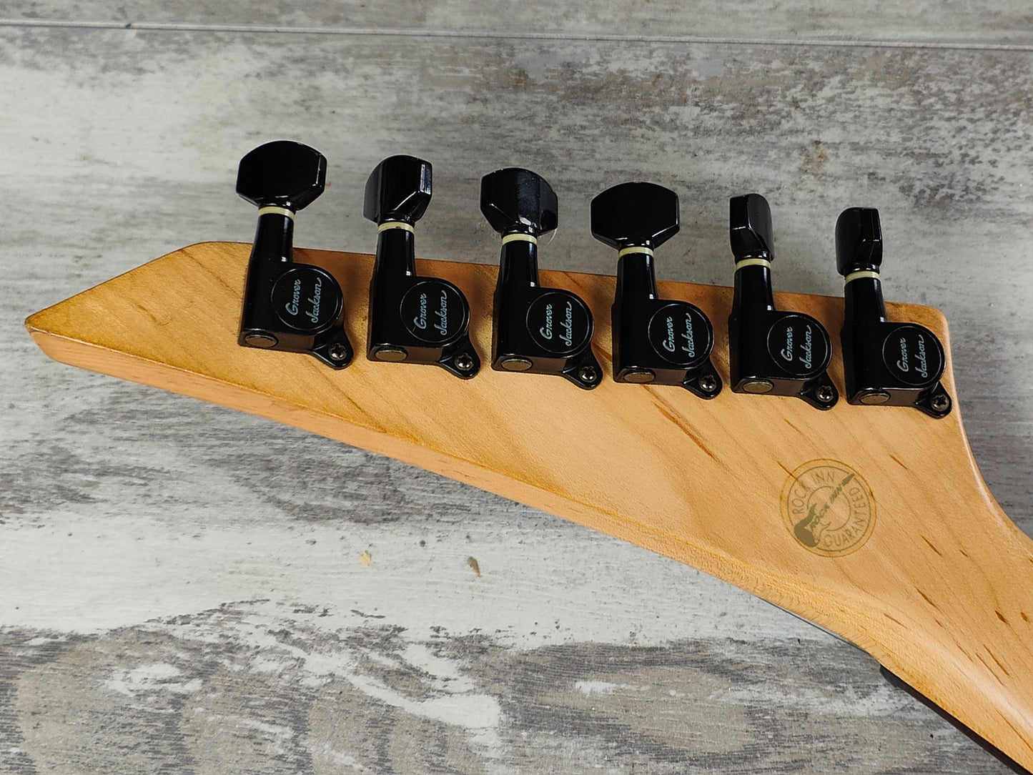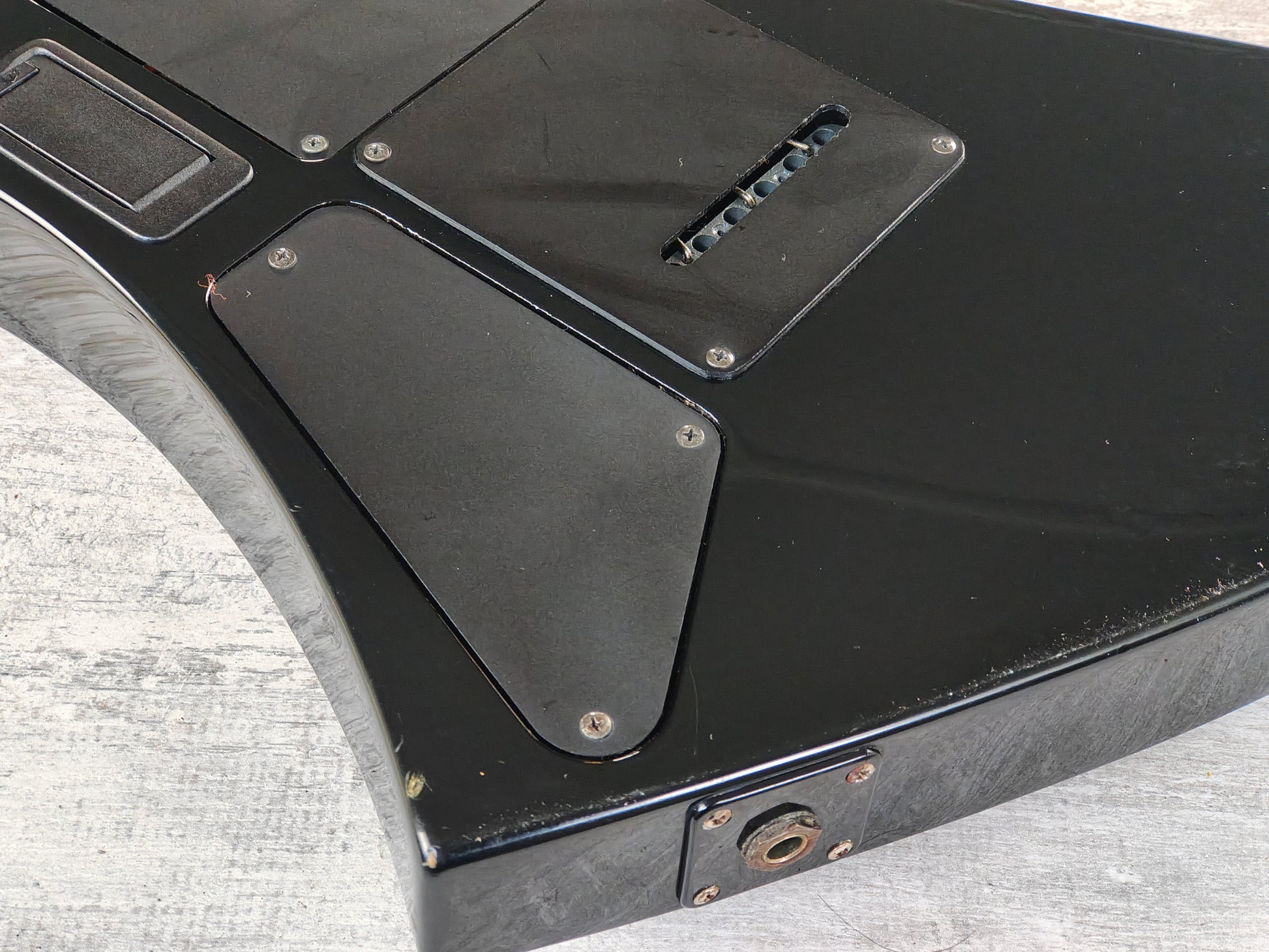 Made in Japan by Jackson in the 1990's, this is a very rare short-scale Kelly model with a built in speaker/amplifier for all your mobile metal fantasies. Seemingly one of only 300 made, it features a 610mm scale rosewood fingerboard with 22 frets, slim maple neck profile and a compact Kelly shaped body (seemingly poplar).