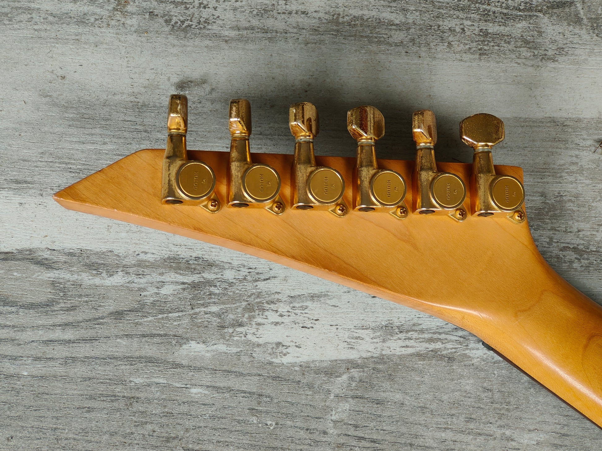 Japanese made in the 1990's, this little Short Scale Rhoads is one of the cooles pointy guitars we've had through in a long time! Solid maple body with a bolt-on maple neck and 22 fret slab rosewood fingerboard (610mm scale length, 40mm nut width), it weighs 2.5kg's.