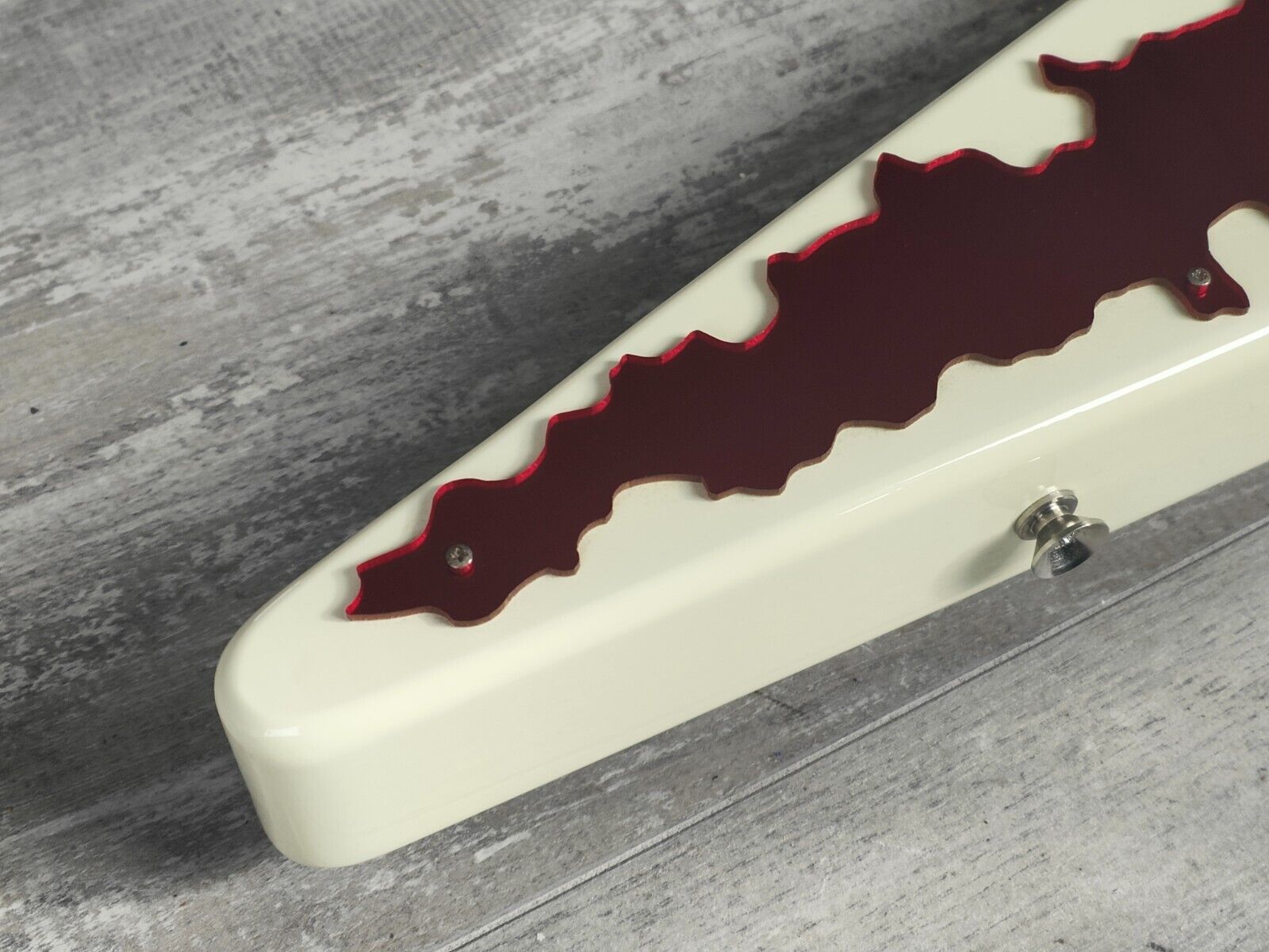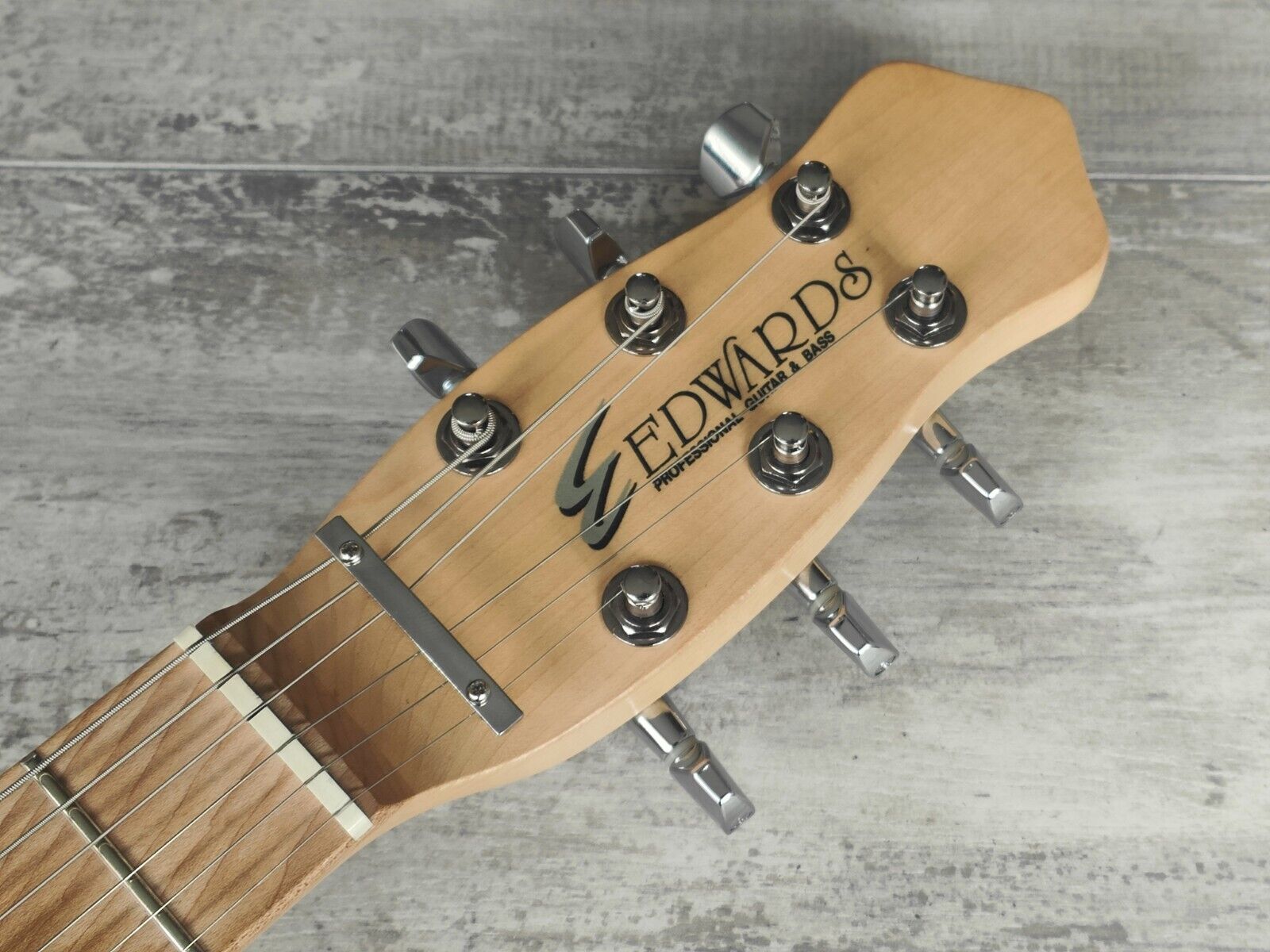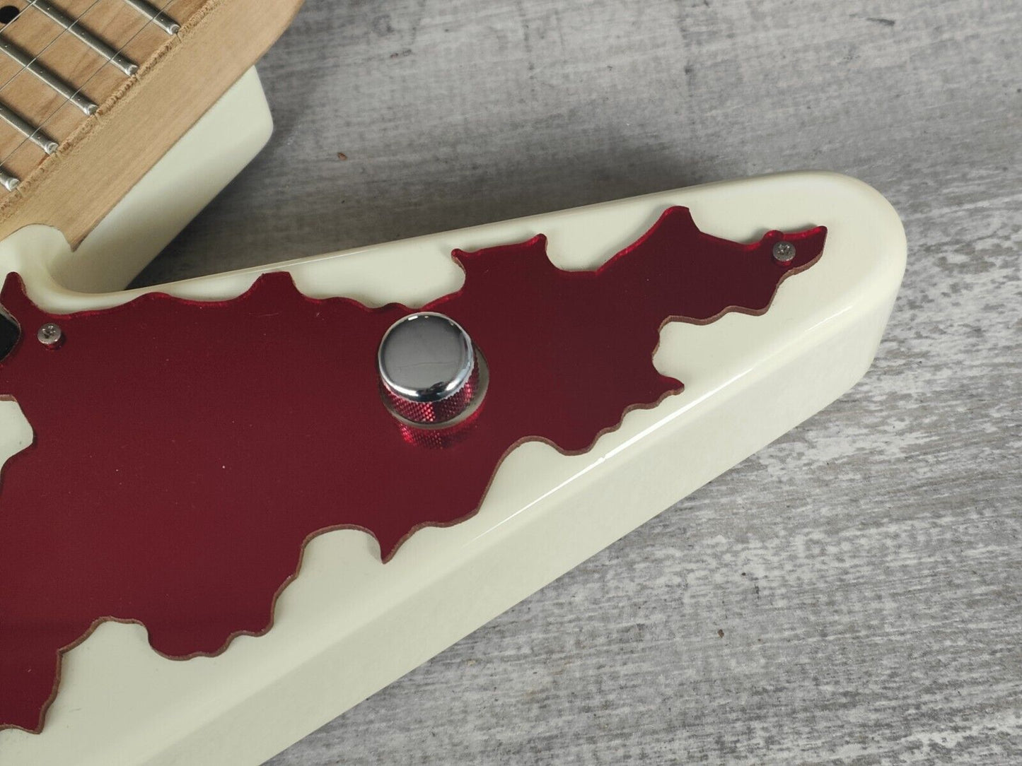A shrunken version of the Akira Takasaki (Loudness) model Random Star made in Japan by Edwards in the late 1990's. The perfect travel or busking guitar that feels more like a real guitar than a toy, it's got a maple neck with 20 frets and a 470mm scale length. Weighing just 2.4kg's, it's loaded with the original humbucker in the bridge position and a super powerful speaker in the neck with a master volume knob and a speaker volume control to fine-tune how gritty the speaker output is. There's some incredibly usable tones available from this one!