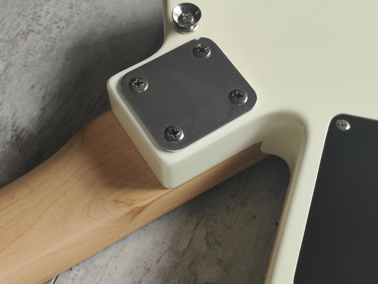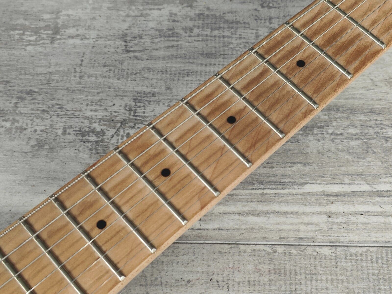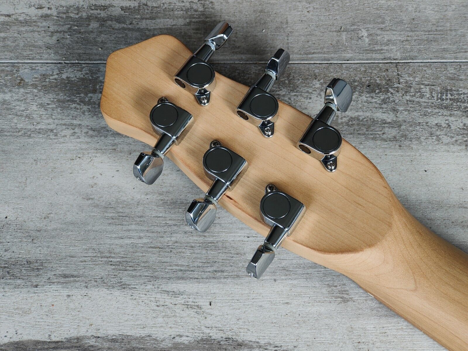A shrunken version of the Akira Takasaki (Loudness) model Random Star made in Japan by Edwards in the late 1990's. The perfect travel or busking guitar that feels more like a real guitar than a toy, it's got a maple neck with 20 frets and a 470mm scale length. Weighing just 2.4kg's, it's loaded with the original humbucker in the bridge position and a super powerful speaker in the neck with a master volume knob and a speaker volume control to fine-tune how gritty the speaker output is. There's some incredibly usable tones available from this one!