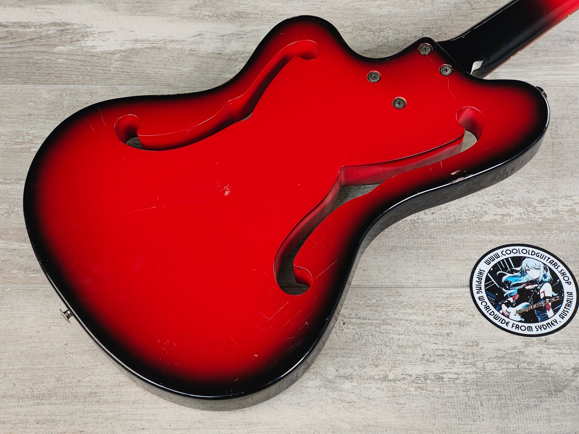 Inexplicably appearing in the Greco catalog for 1992 then seemingly disappearing from their range, these models were aimed at recreating the famous Ampeg AUB-1 model of the 1960's in a short-scale form. Soft maple body with f-holes through the black/redburst finish bolted to a maple neck with a rosewood fingerboard (30" scale length), it weighs 4kg's.