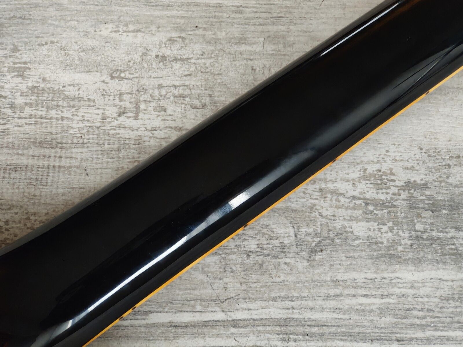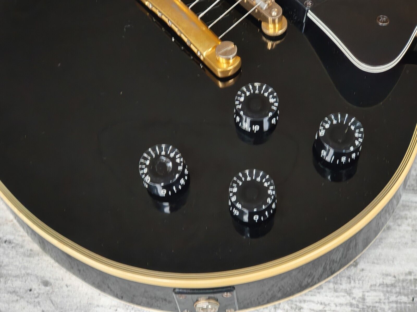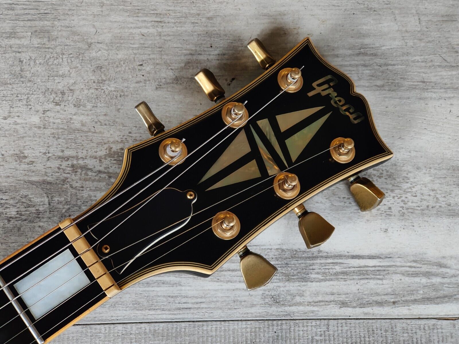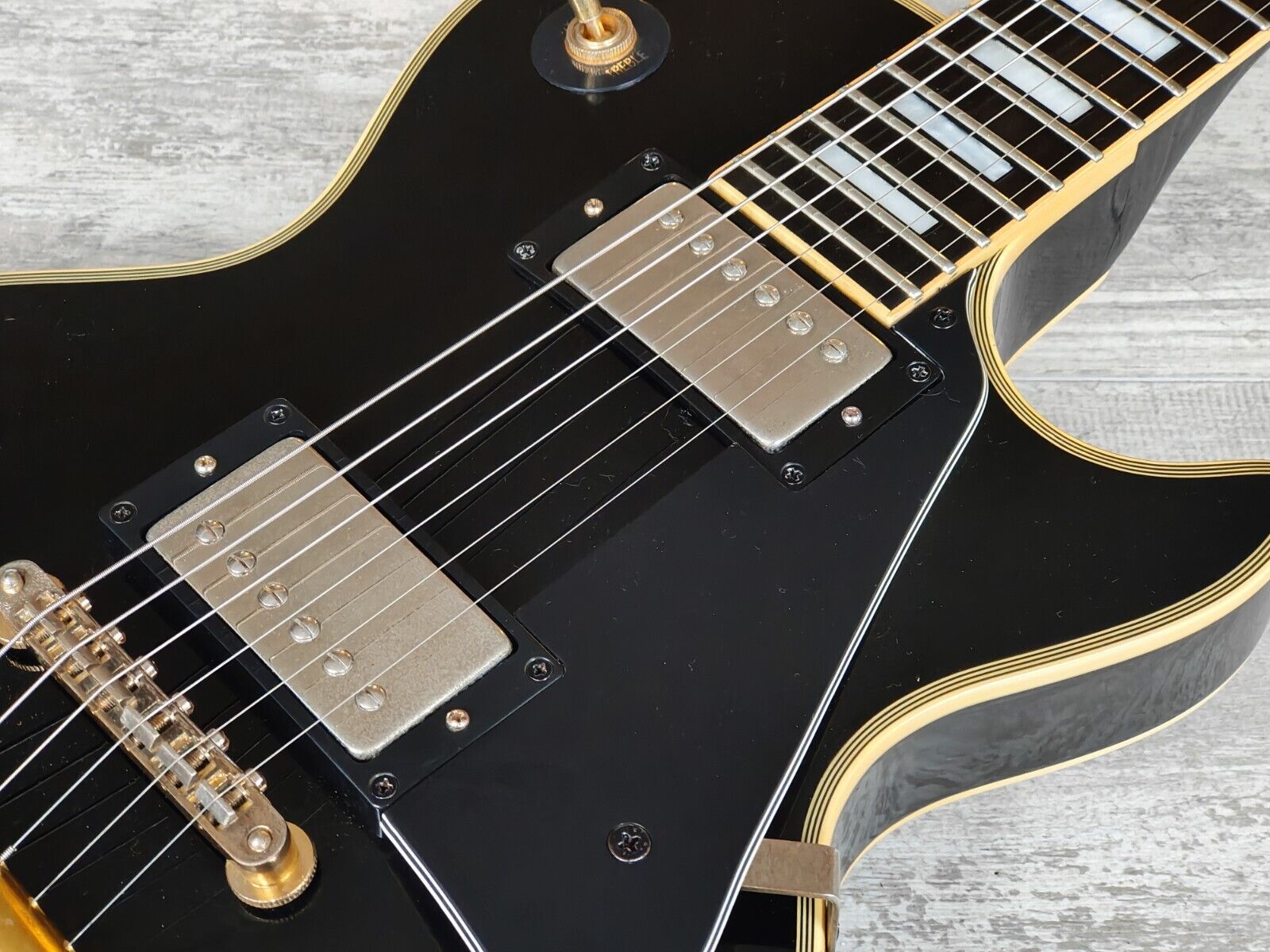 Made by the Cort factory in Korea in the early 1990's, this is the Greco EGC '68 reissue Les Paul Custom in Ebony. Mahogany back with a lightly carved maple top, slim 60's profile mahogany neck and a 22 fret rosewood fingerboard, it weighs a surprisingly hefty 4.6kg's. Looks to have some generic chrome humbuckers installed (unbranded) otherwise it seems all original with a gold bridge/tailpiece along with the original Greco branded tuners.
